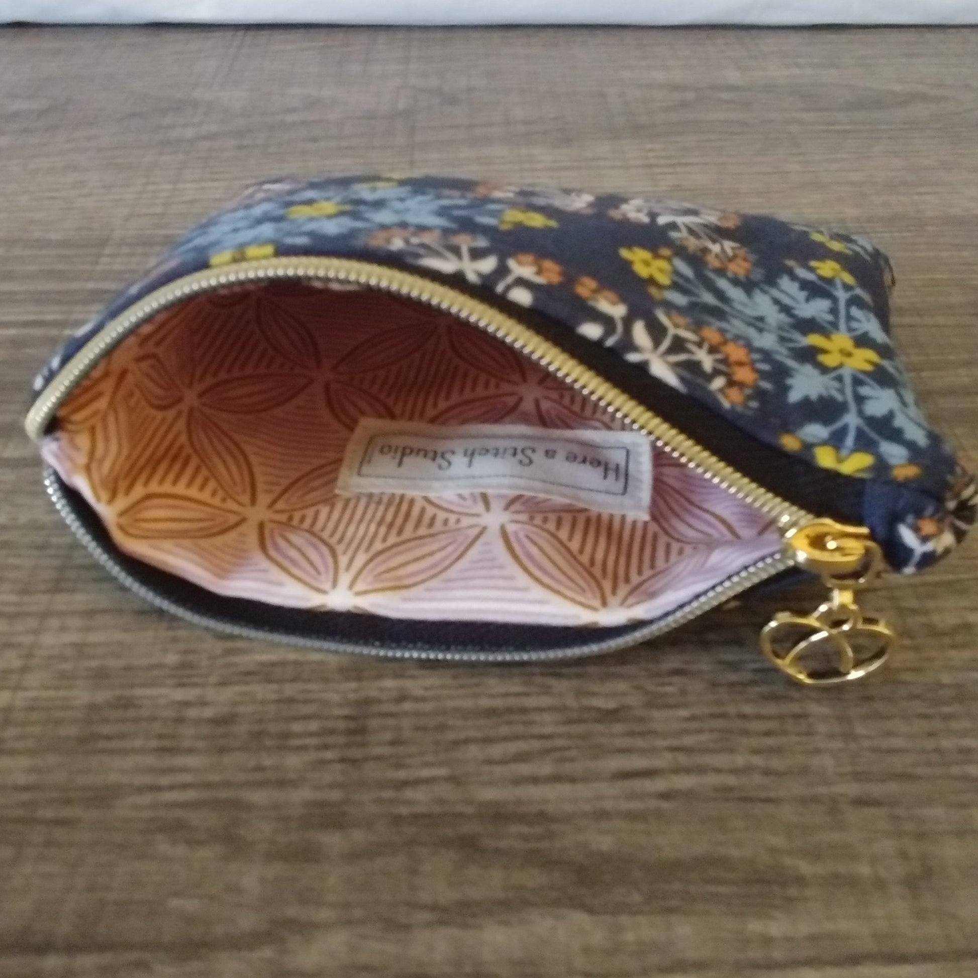 The exterior and interior of the pouch are made from 100% cotton fabric in blue with a floral print, and both are interfaced for extra durability. Each pouch has a metal zipper made with a heart shaped zipper pull in a gold finish.