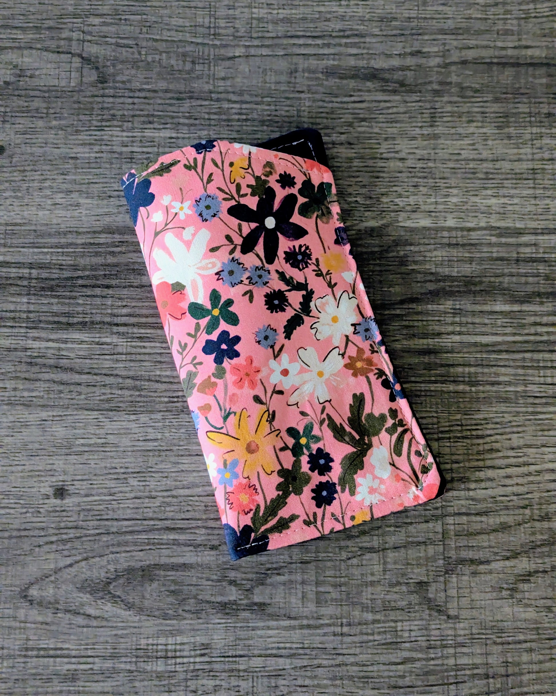 Keep your glasses safe, and add a little style with this padded eyeglass pouch. The exterior is a cream cotton featuring a pink and green floral print. The interior features a pink print cotton.