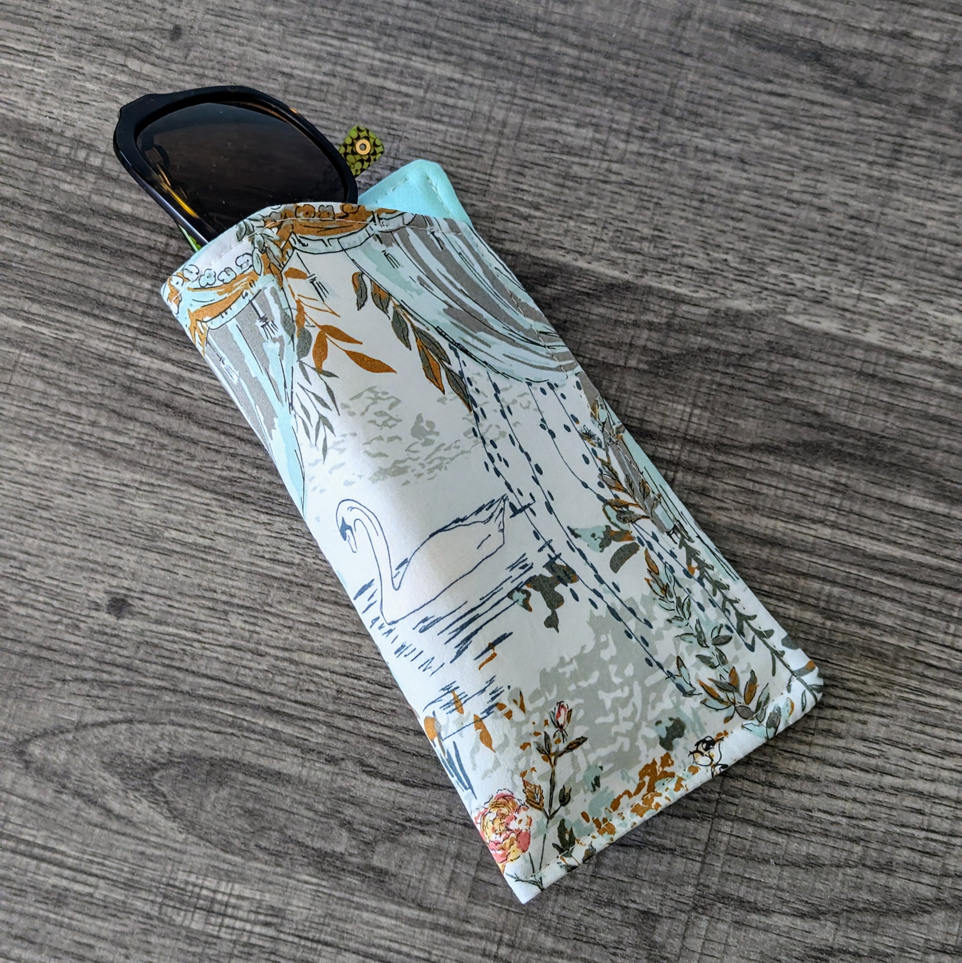 Keep your glasses safe, and add a little style with this soft eyeglass pouch. The exterior is a light cotton featuring a swan and floral print. The interior is a aqua blue cotton.