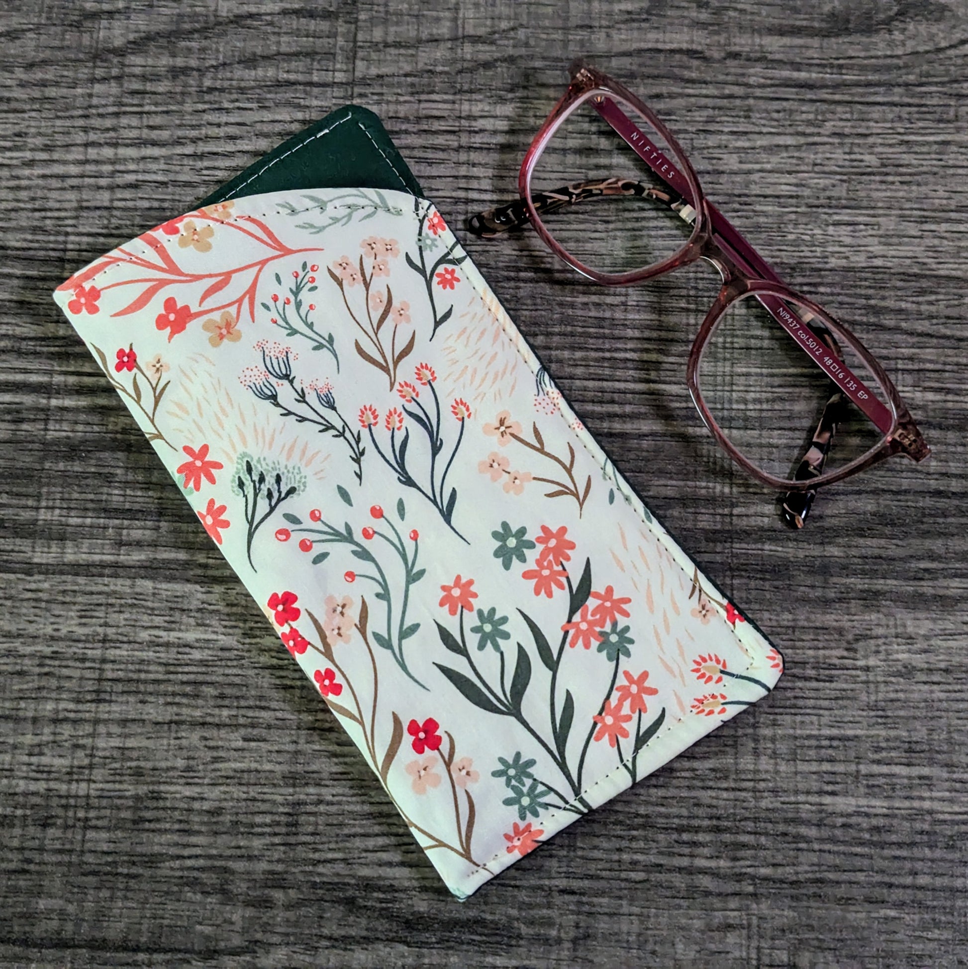 Keep your glasses safe, and add a little style with this padded eyeglass pouch. The exterior is a white cotton featuring a wildflower print. The interior is a solid green cotton.