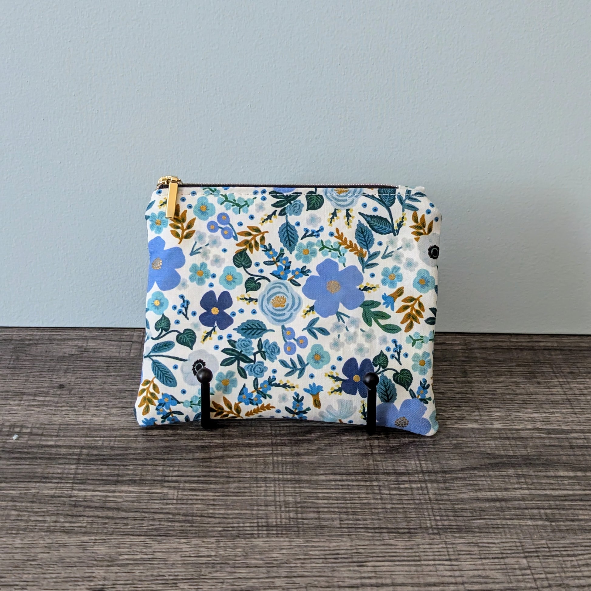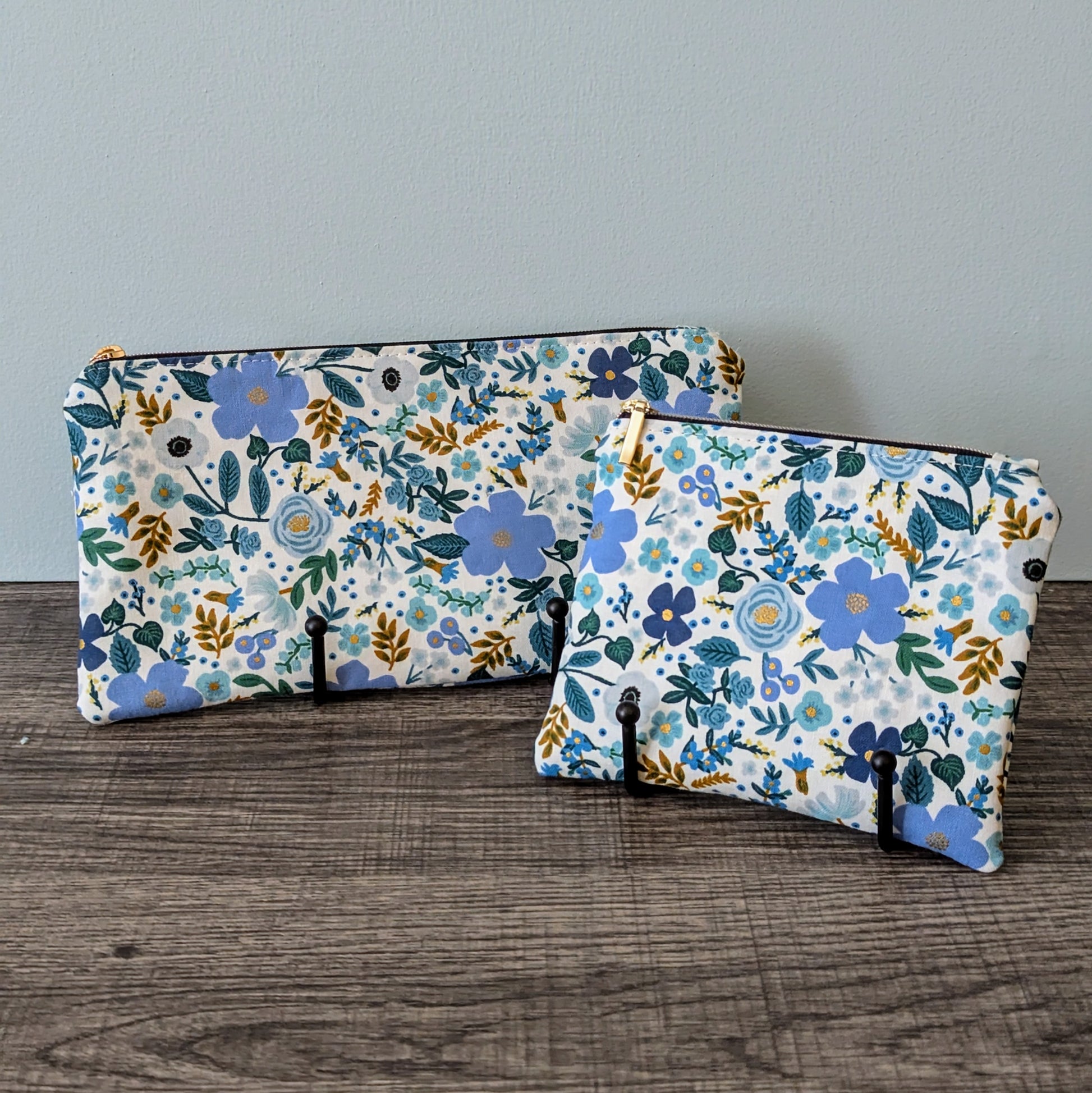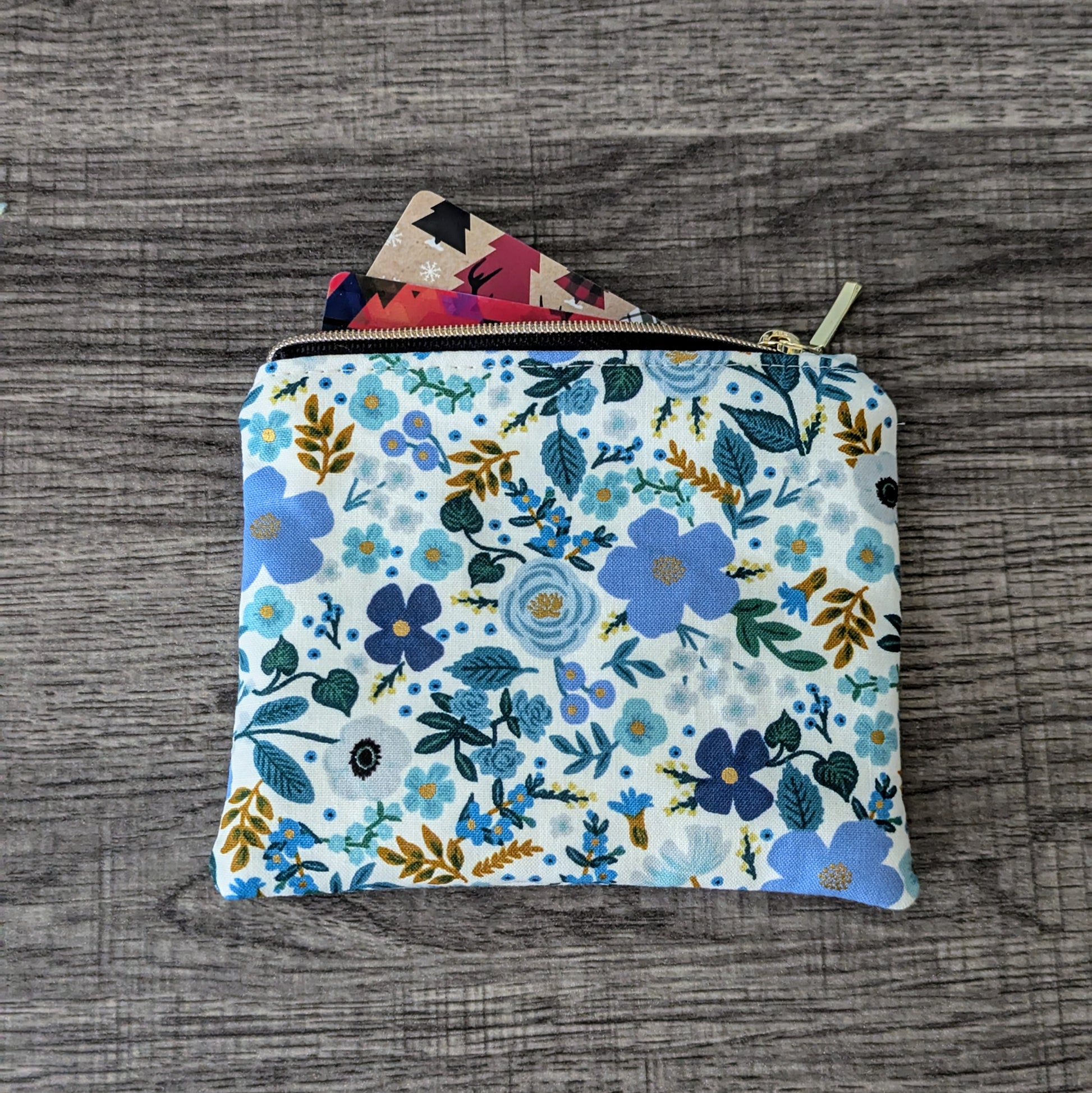 This blue floral pouch is perfect for all your needs. The small zipper pouch makes a nice money and coin purse, and it is the right size to hold debit, credit and gift cards. The larger zipper pouch makes a nice pencil case. These pouches can also be used as small makeup bags.