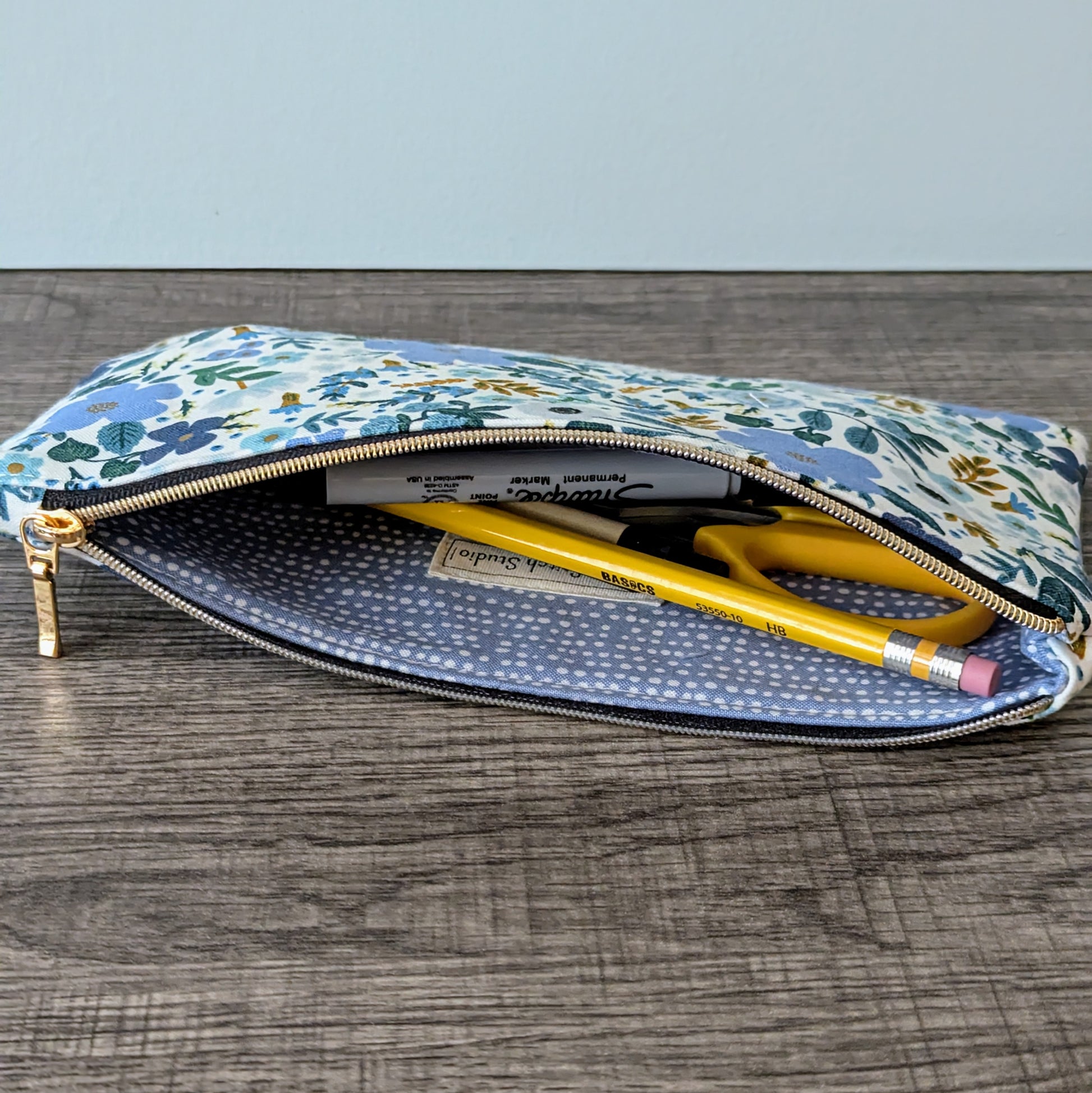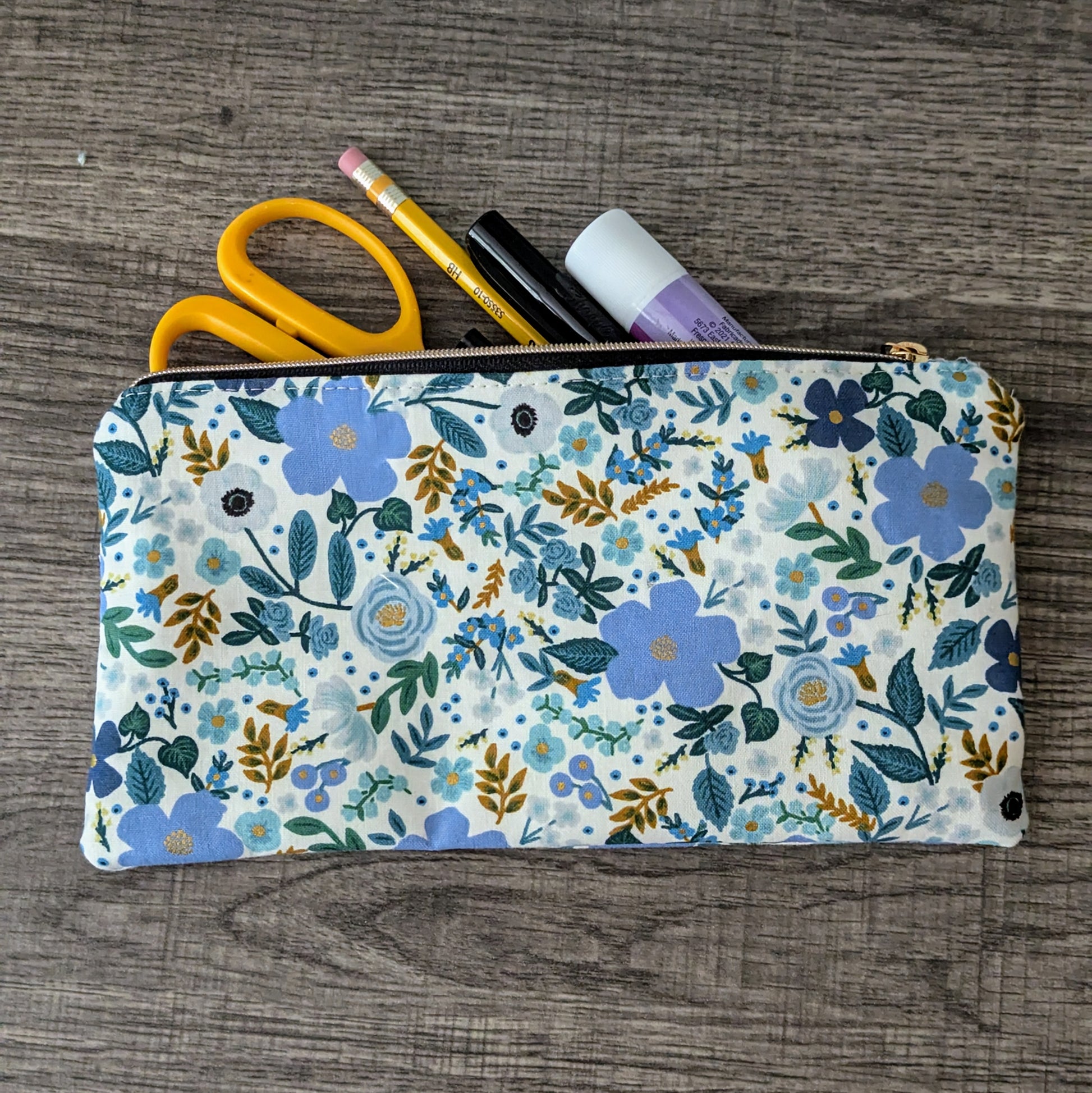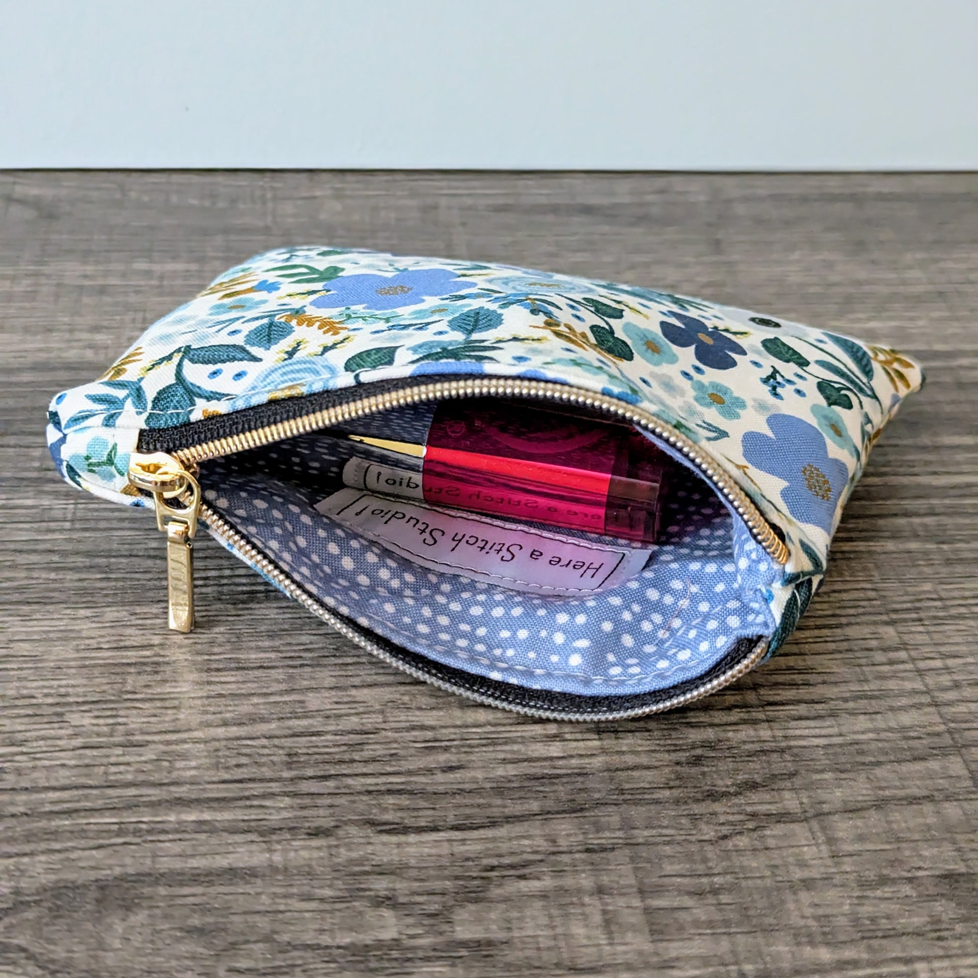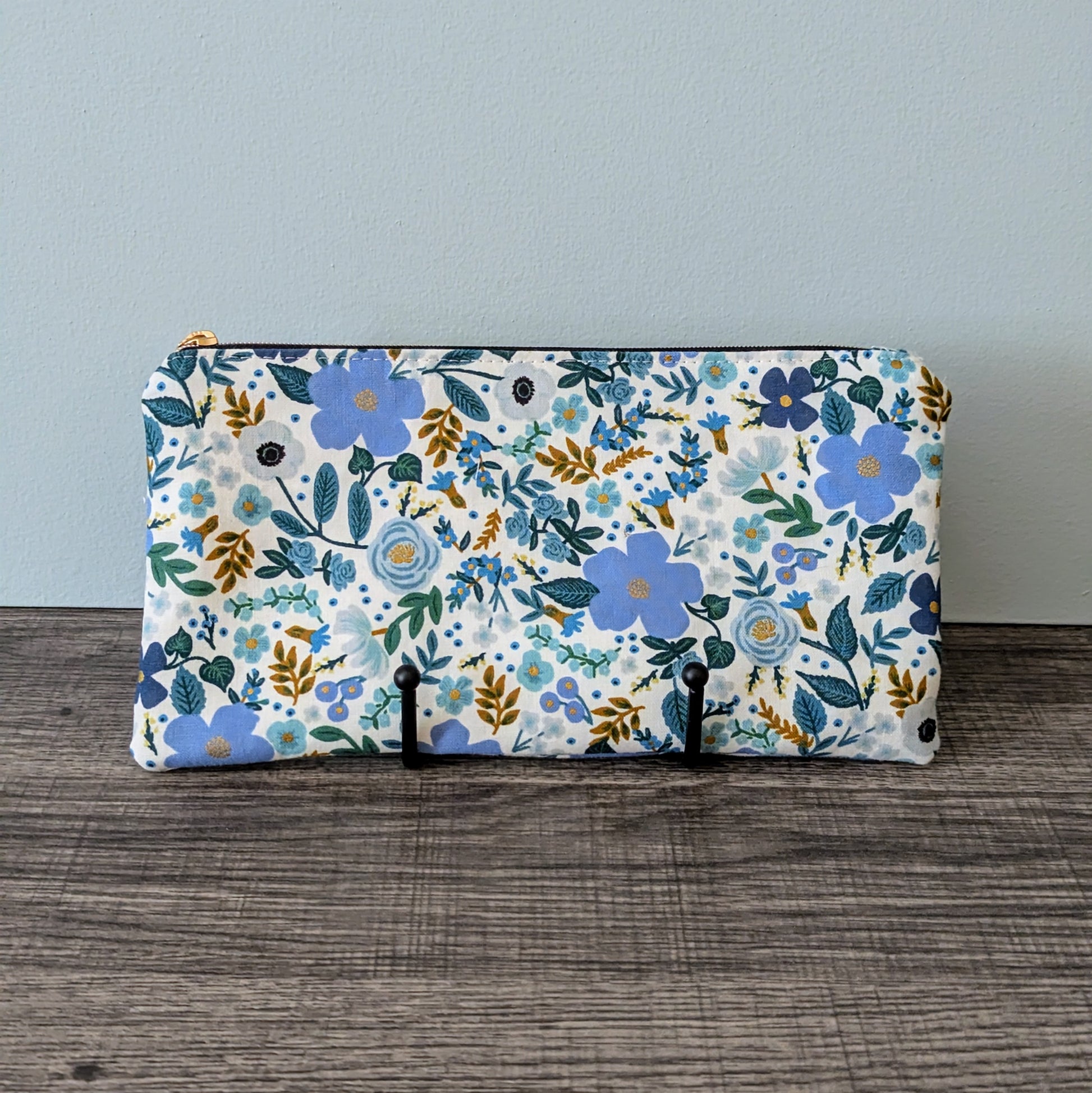 This blue floral pouch is perfect for all your needs. The small zipper pouch makes a nice money and coin purse, and it is the right size to hold debit, credit and gift cards. The larger zipper pouch makes a nice pencil case. These pouches can also be used as small makeup bags.