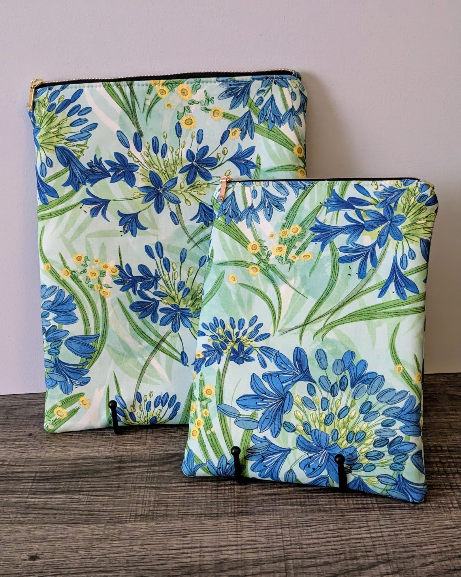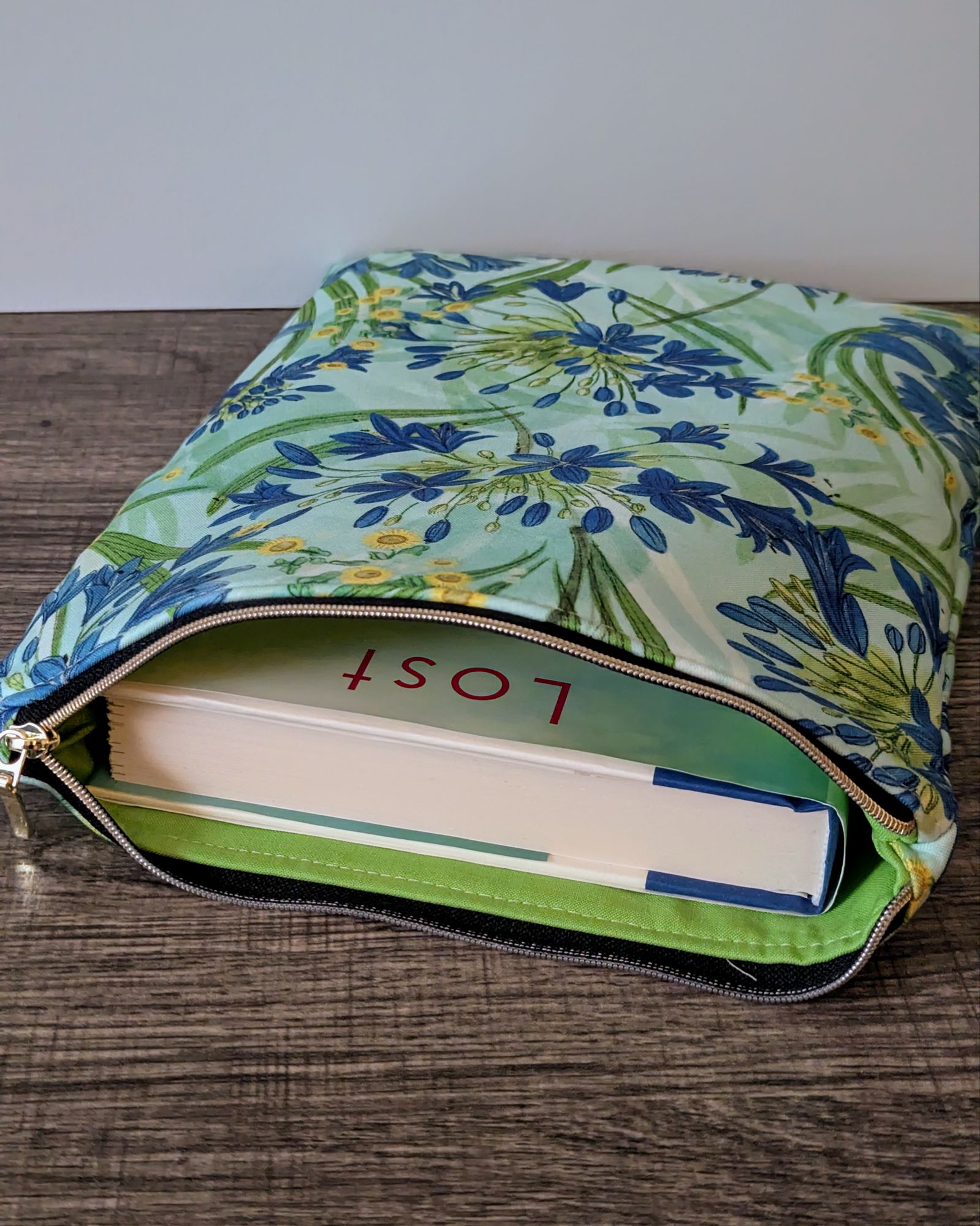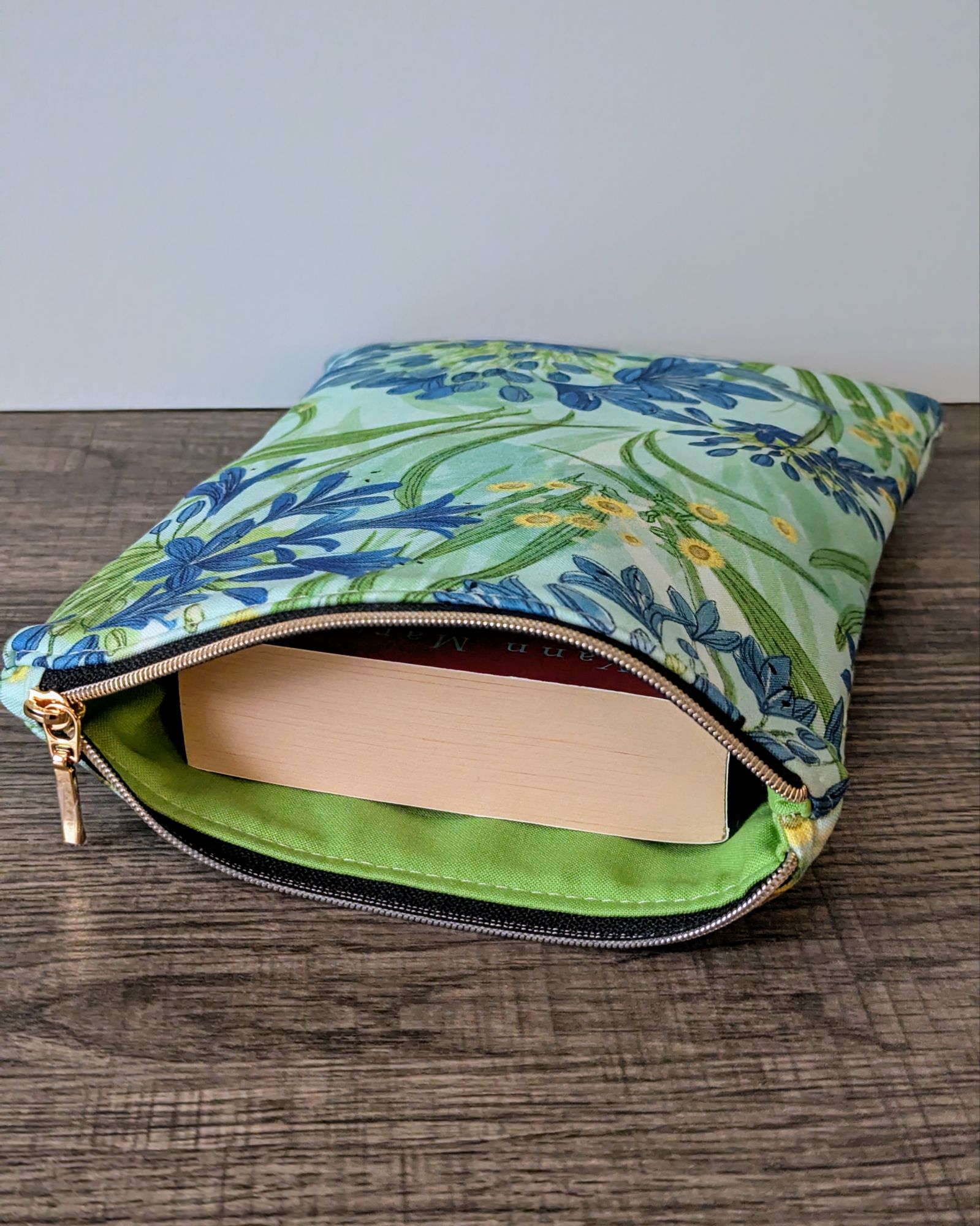 Protect your book, e-reader or tablet with this fabric book sleeve. These sleeves feature a large floral print on aqua blue cotton and have a lime green cotton lining. The small book sleeve fits smaller paper backs, as well as some e-readers and tablets. The larger book sleeve fits some larger paper backs and hardcover books, as well as e-readers and tablets. Approximate size of book sleeves are below to check if they will fit your book or device.