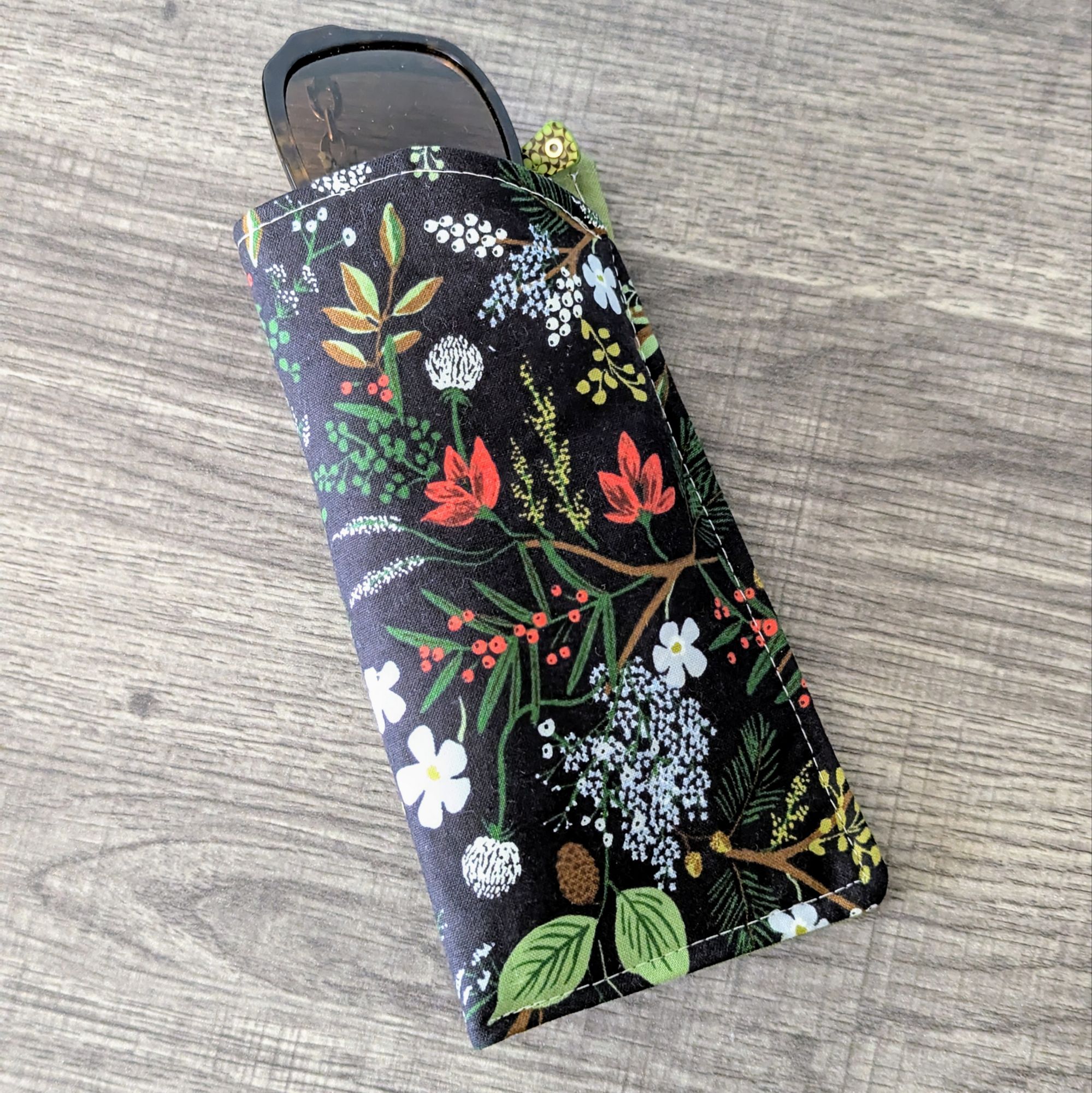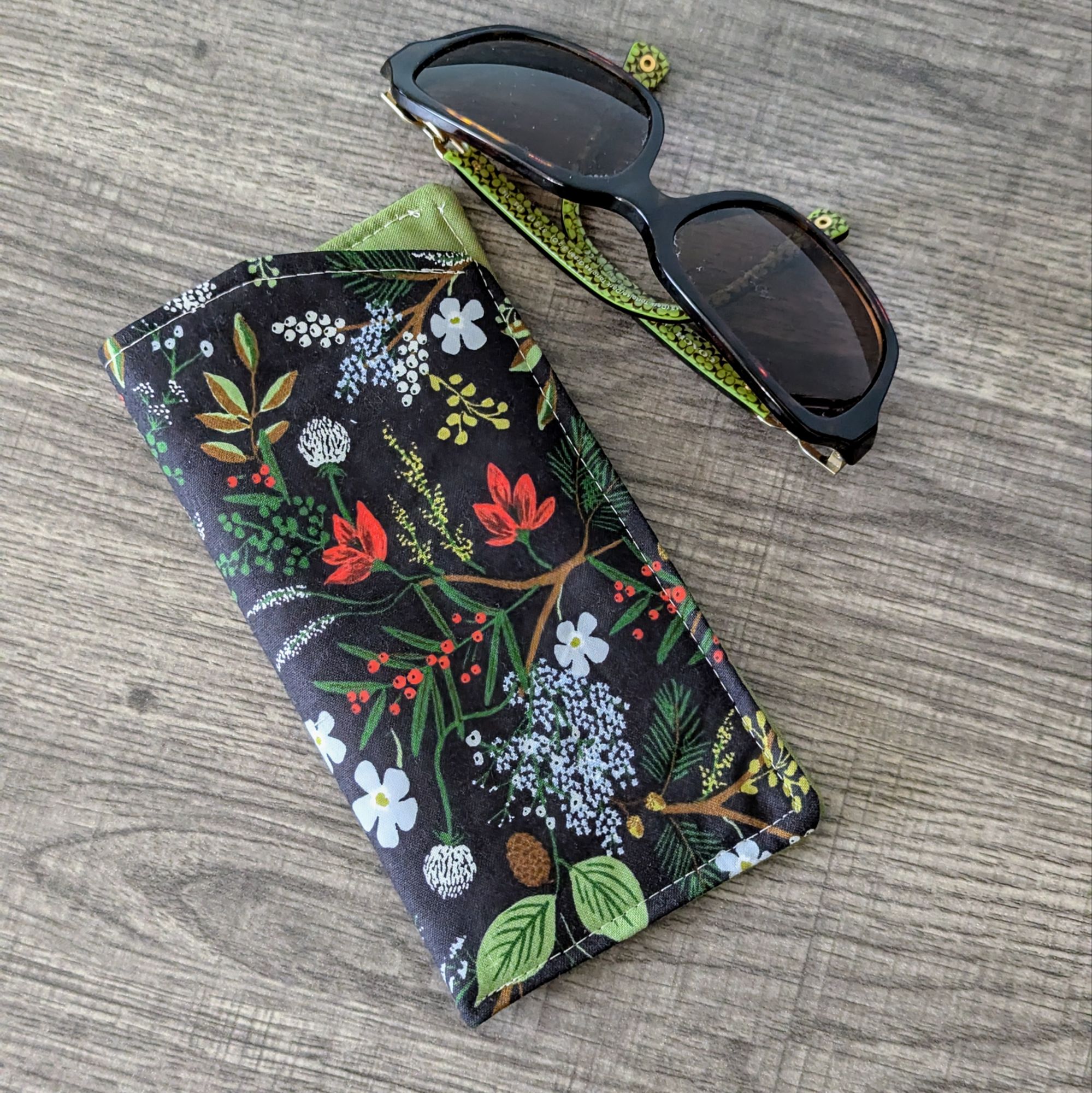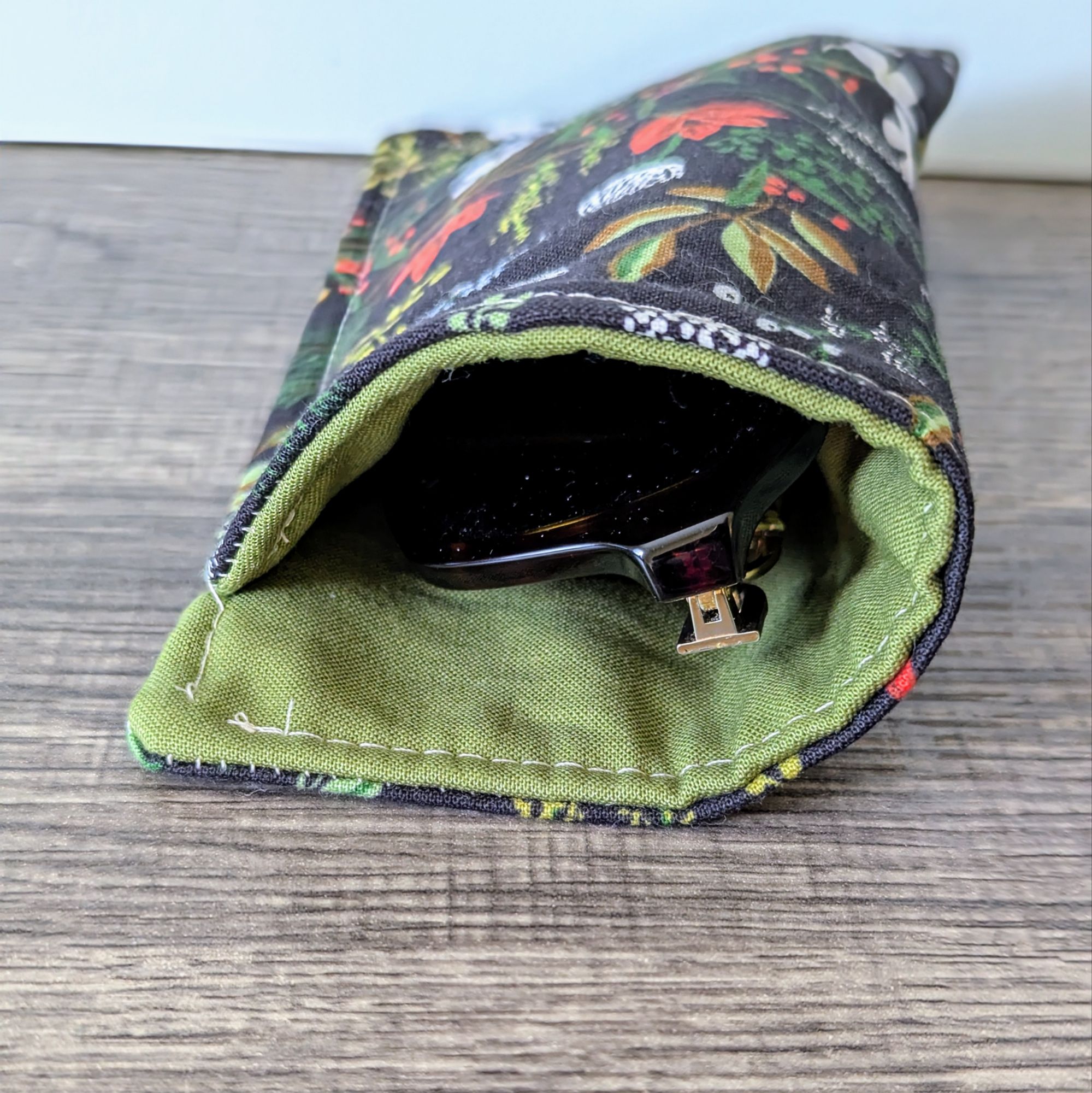 Keep your glasses safe, and add a little style with this soft eyeglass pouch. The exterior is a black cotton featuring a floral and foliage print. The interior is a green cotton.