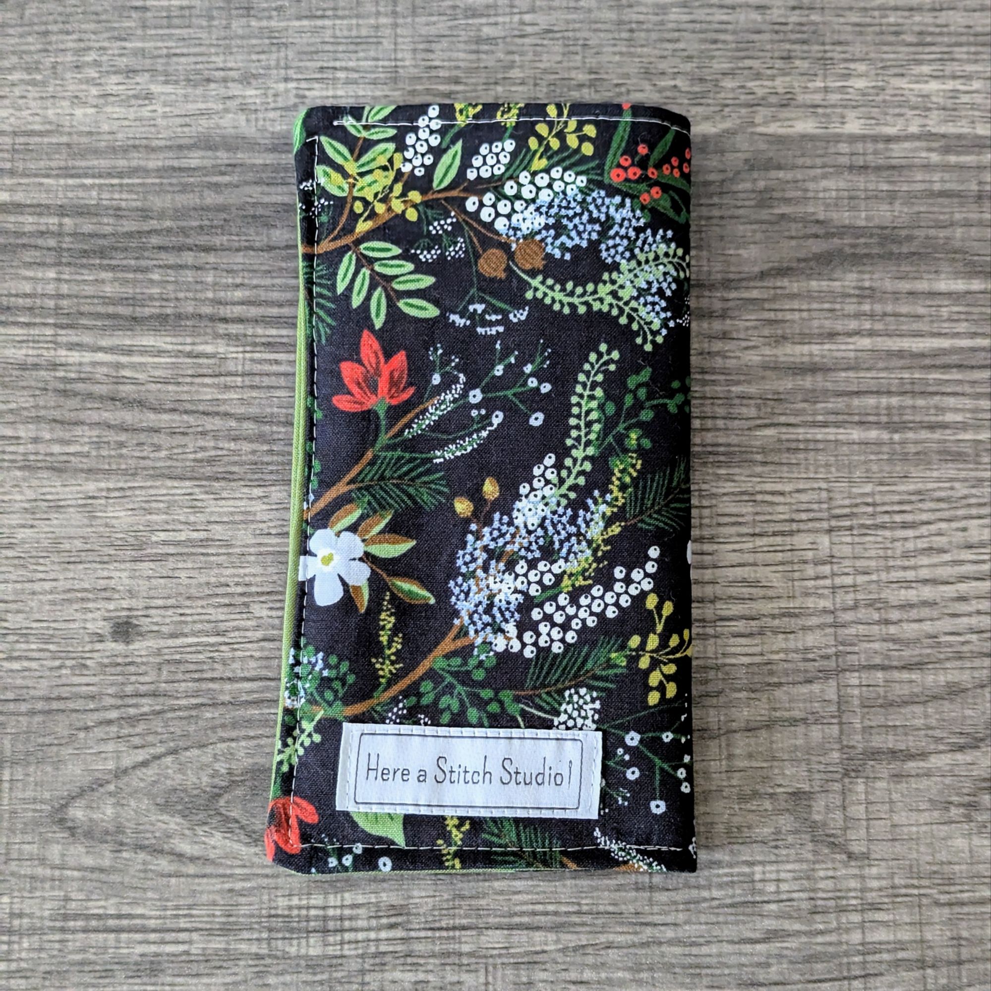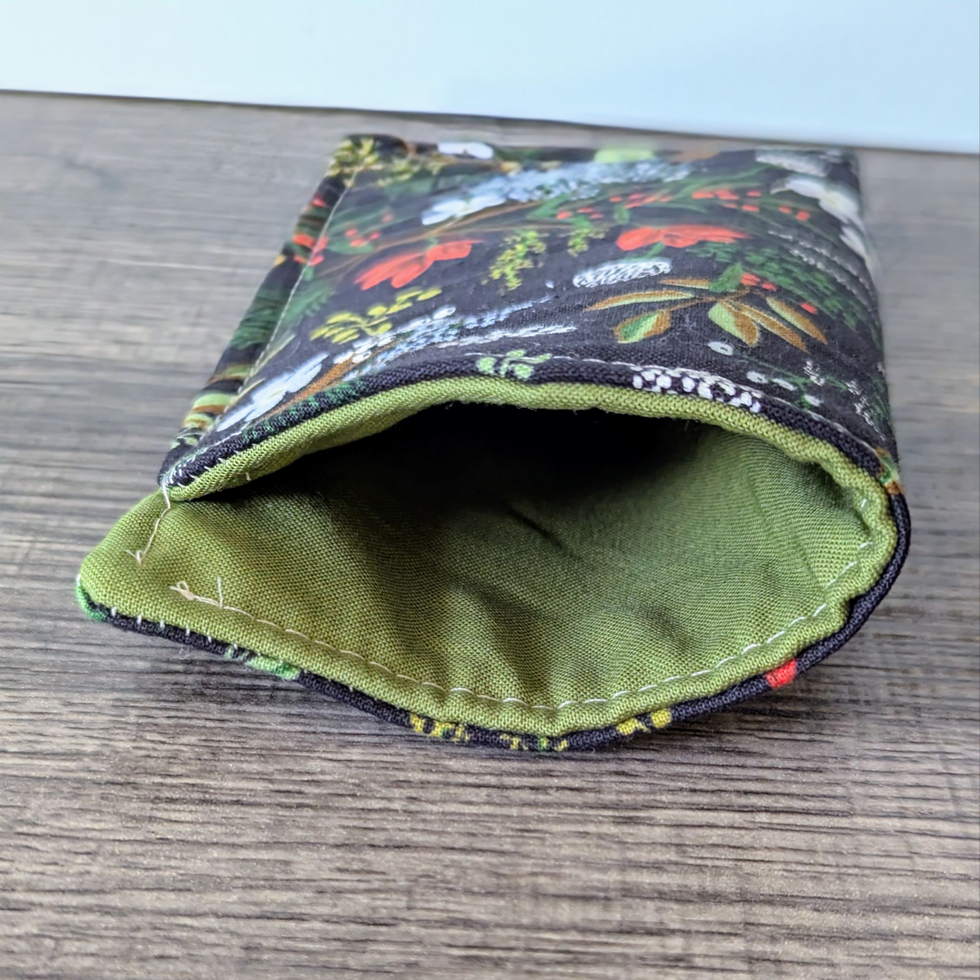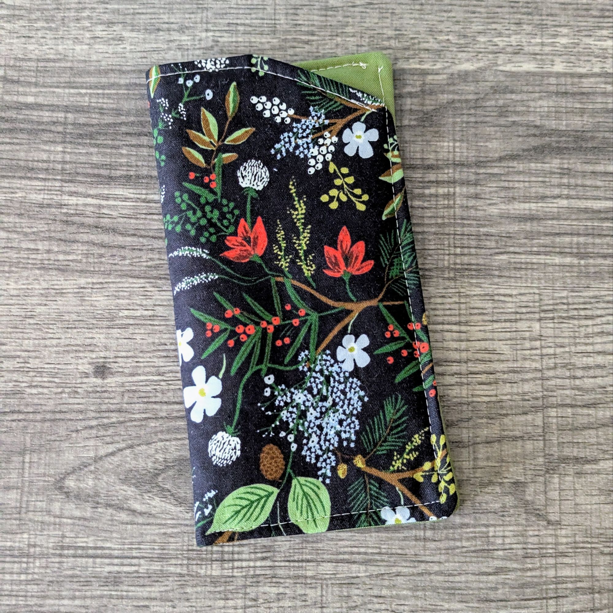 Keep your glasses safe, and add a little style with this soft eyeglass pouch. The exterior is a black cotton featuring a floral and foliage print. The interior is a green cotton.