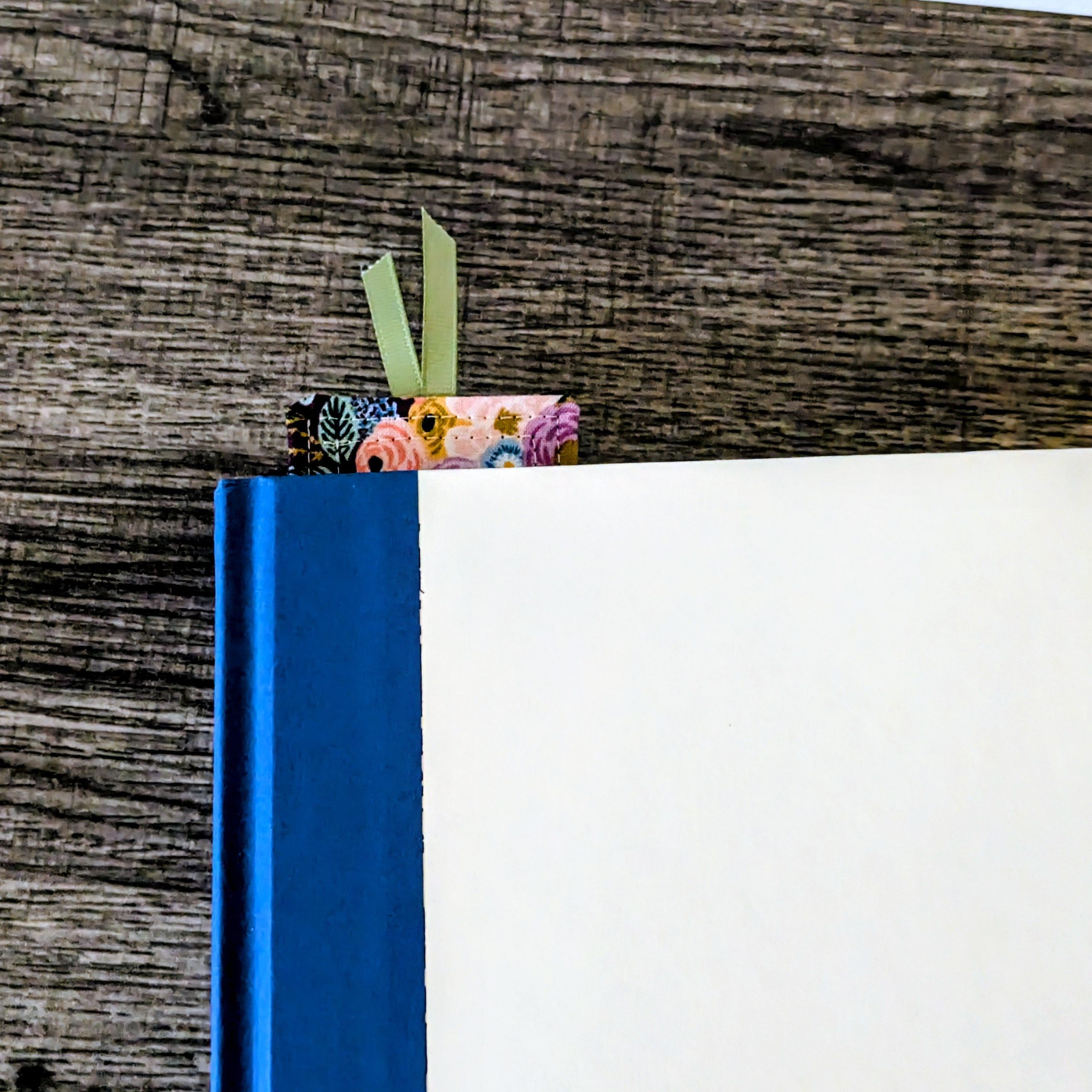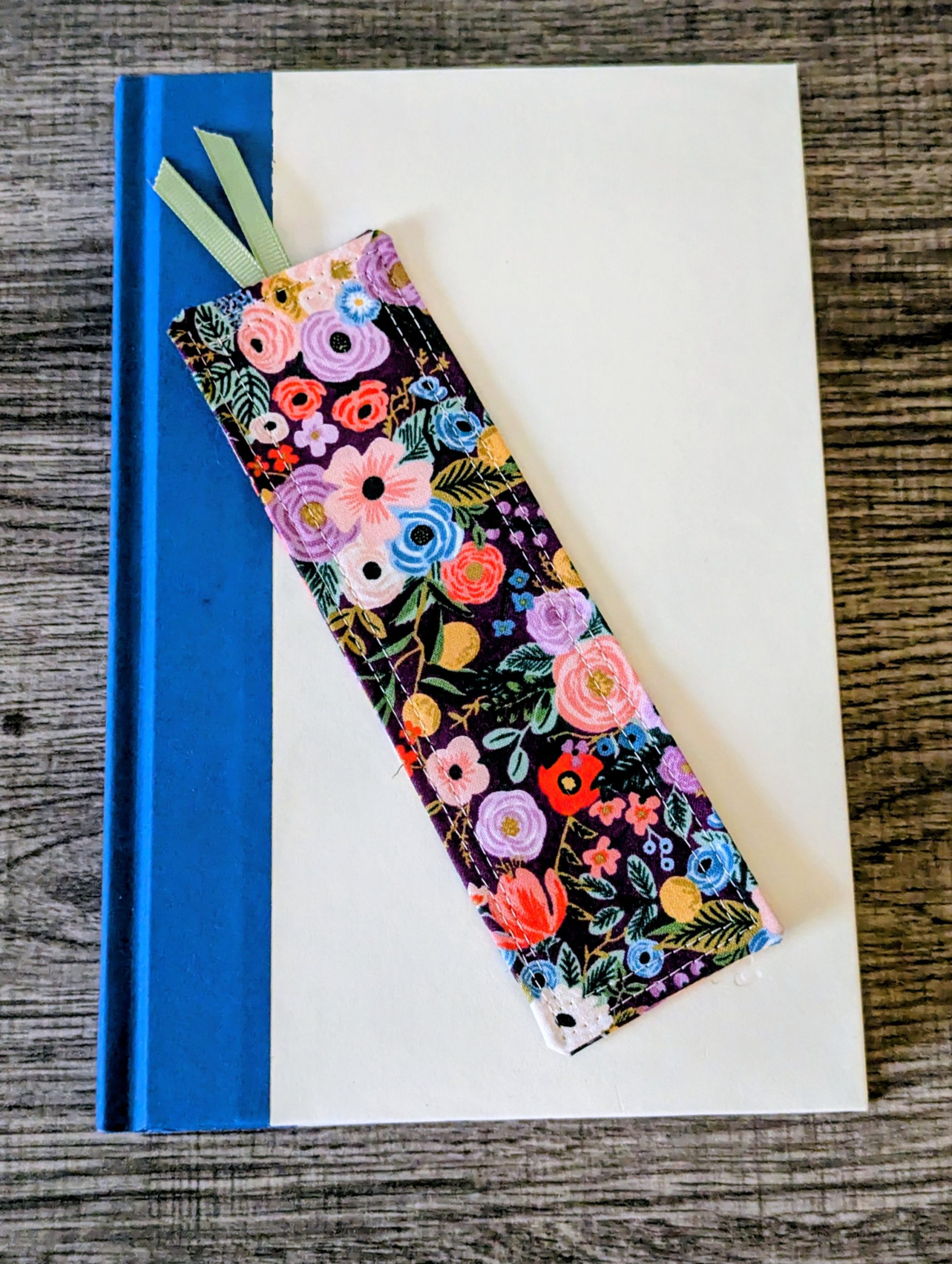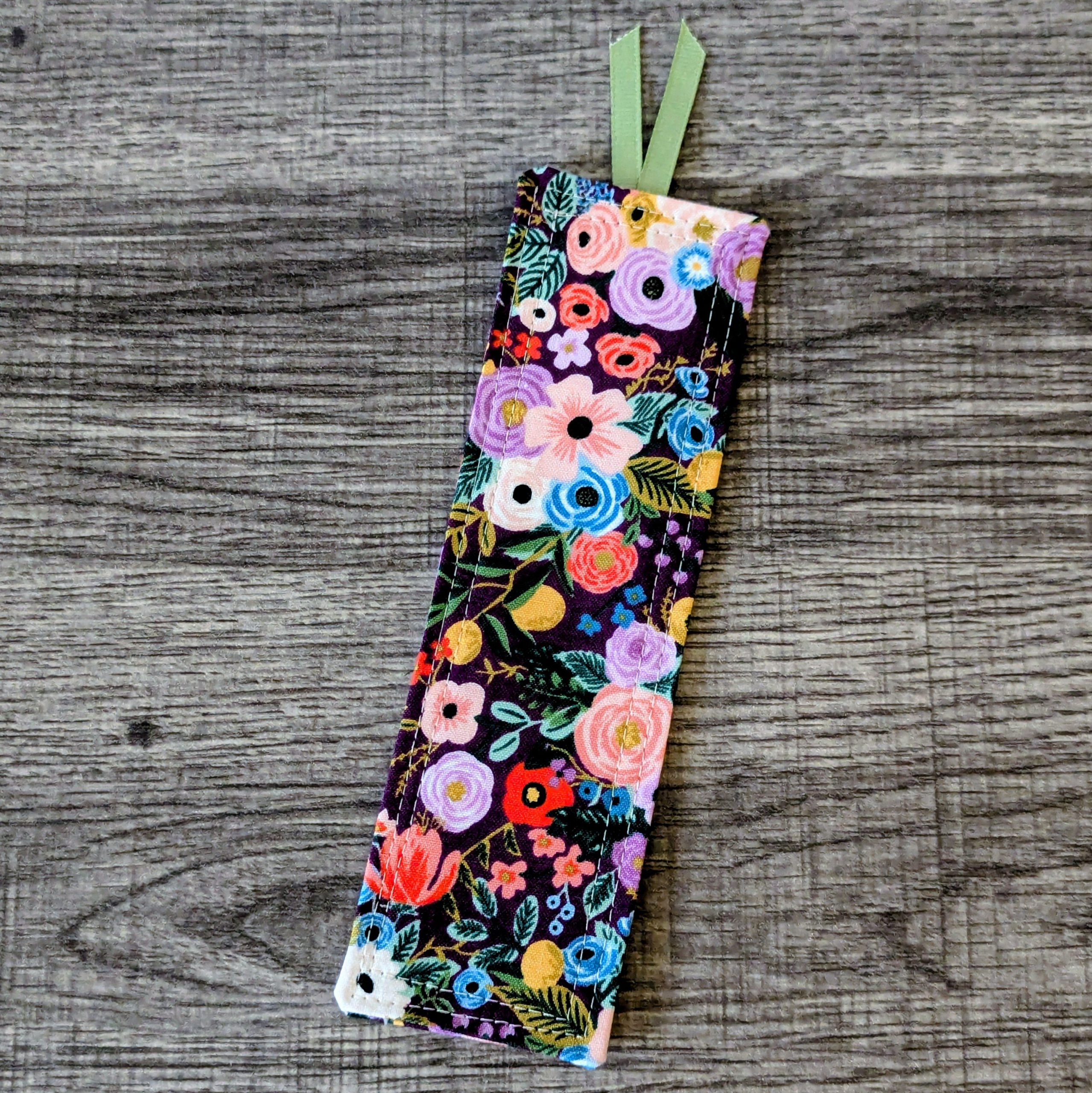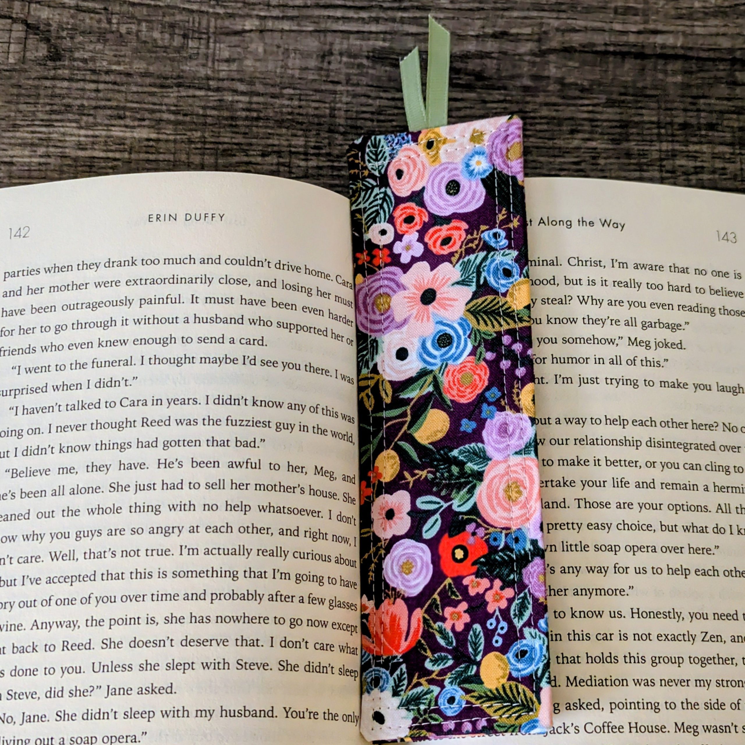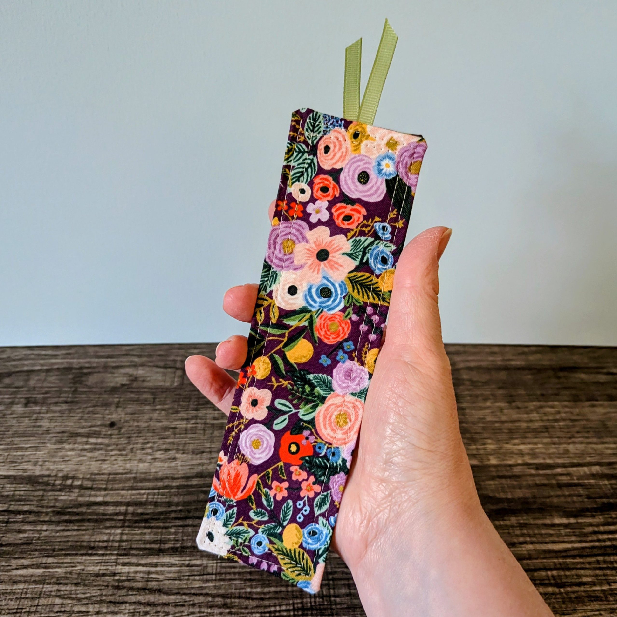 Hold your place in a book with this pretty floral bookmark. Featuring a burgundy flower print, this bookmark is handcrafted with cotton fabric and a firm interfacing, and accented with a ribbon in a coordinating colour.