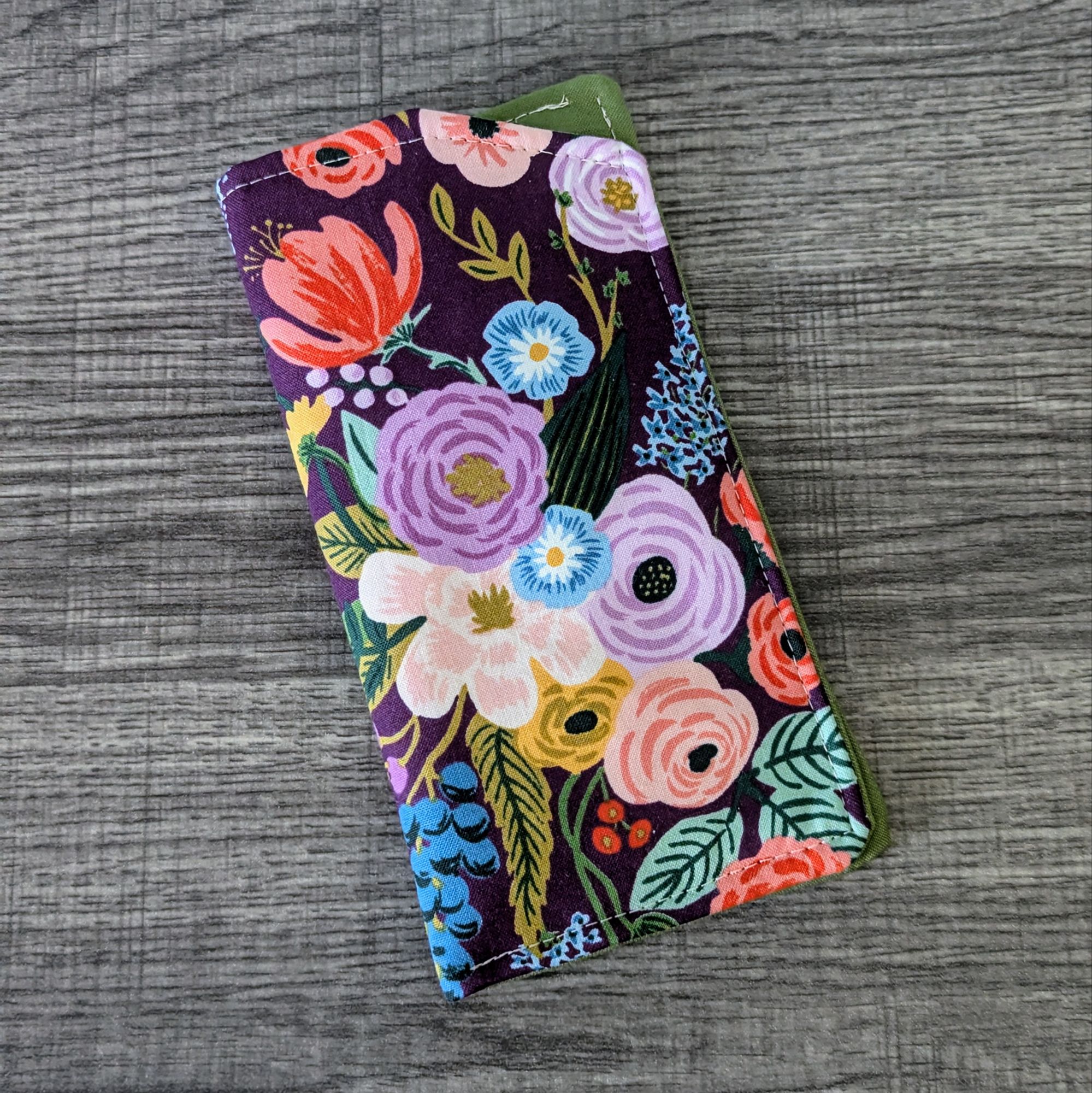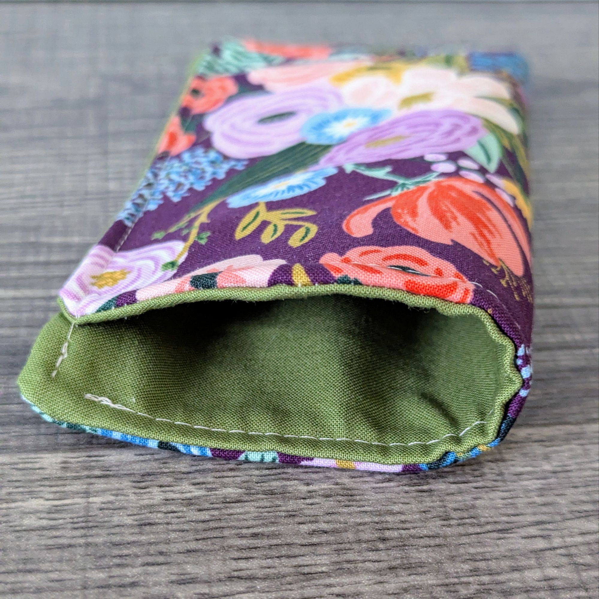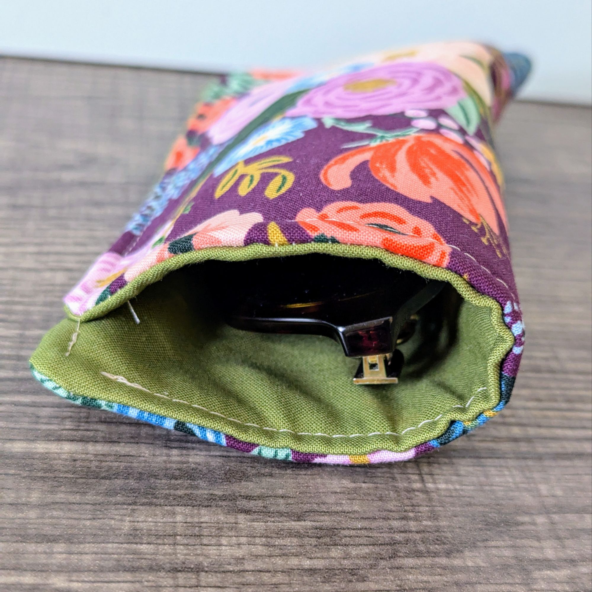 Keep your glasses safe, and add a little style with this soft eyeglass pouch. The exterior is a burgundy red cotton featuring a floral print. The interior is a solid green cotton.