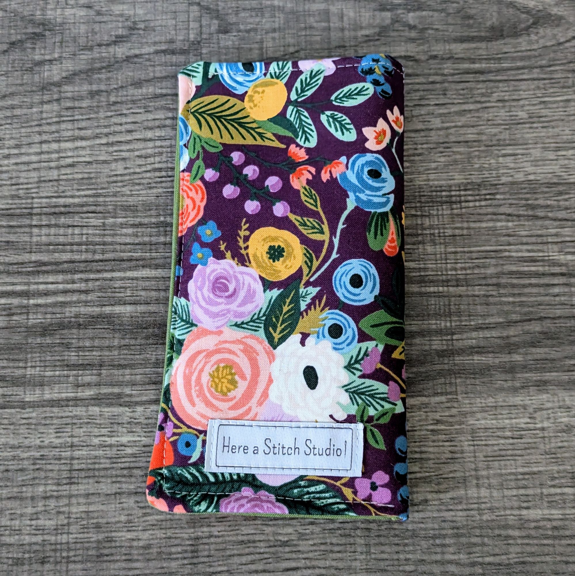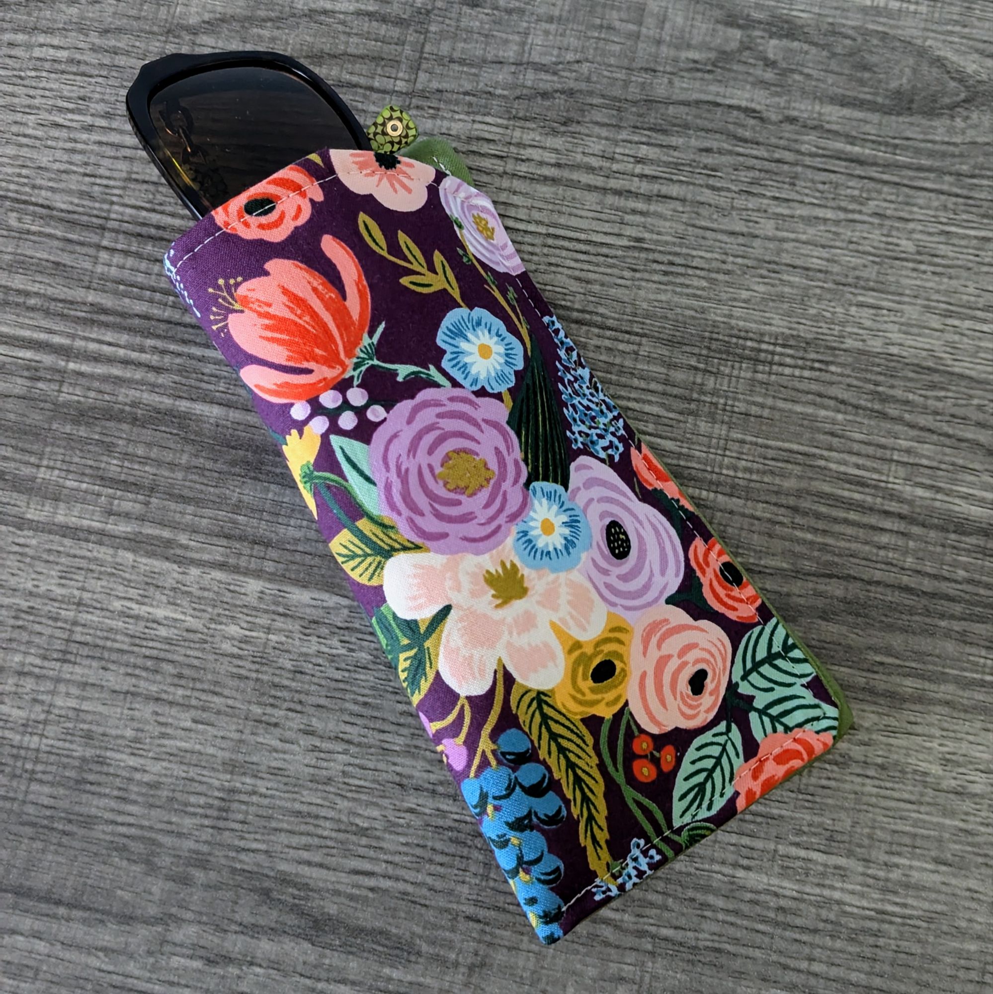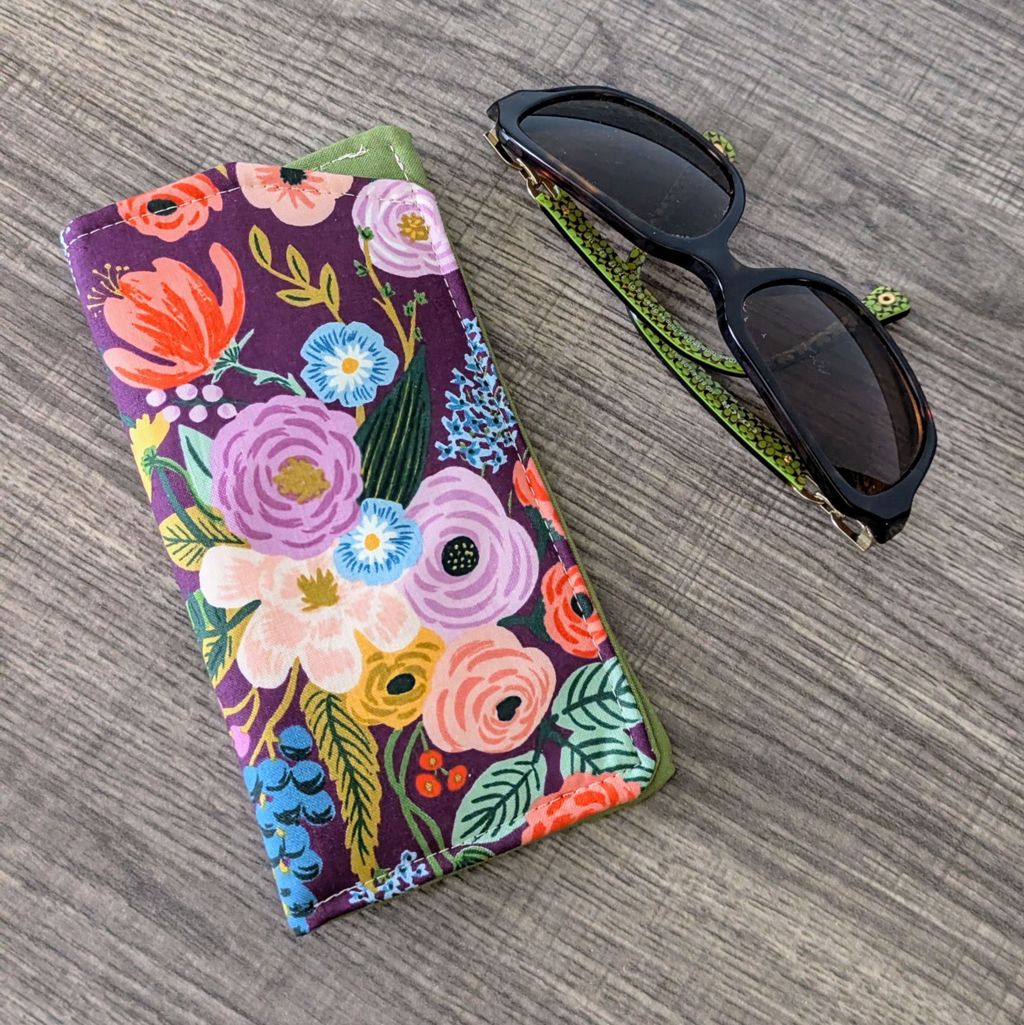 Keep your glasses safe, and add a little style with this soft eyeglass pouch. The exterior is a burgundy red cotton featuring a floral print. The interior is a solid green cotton.
