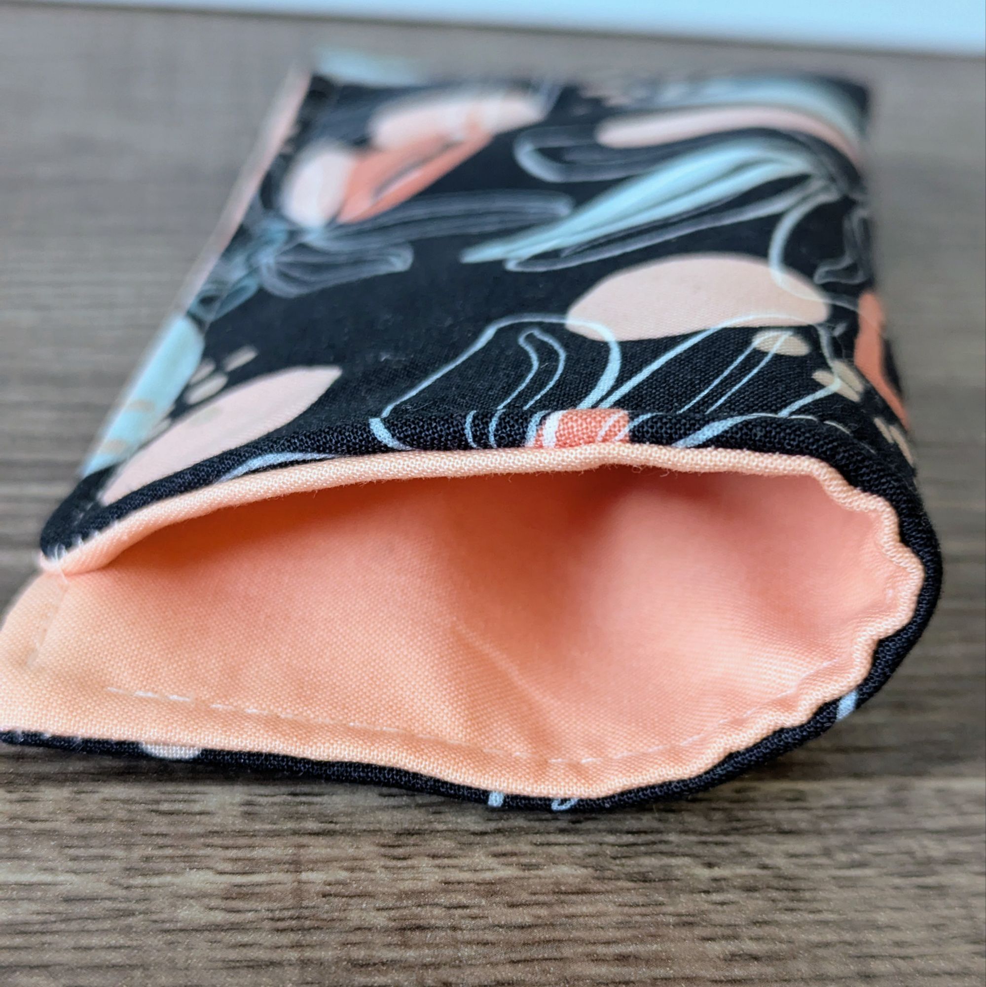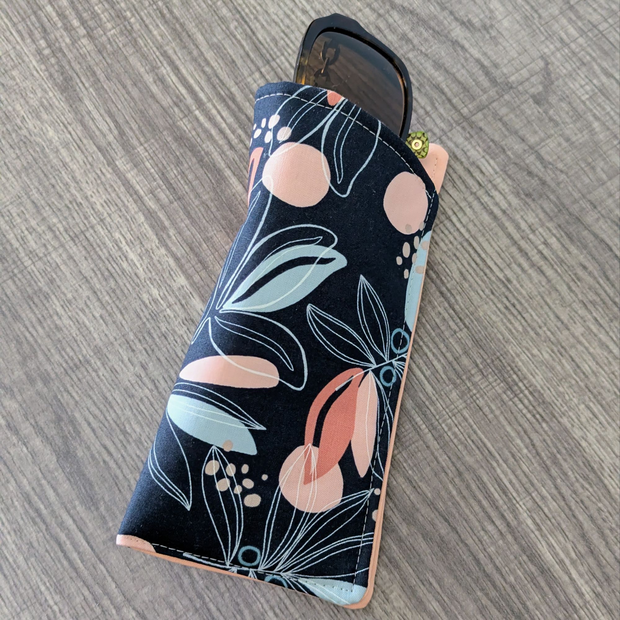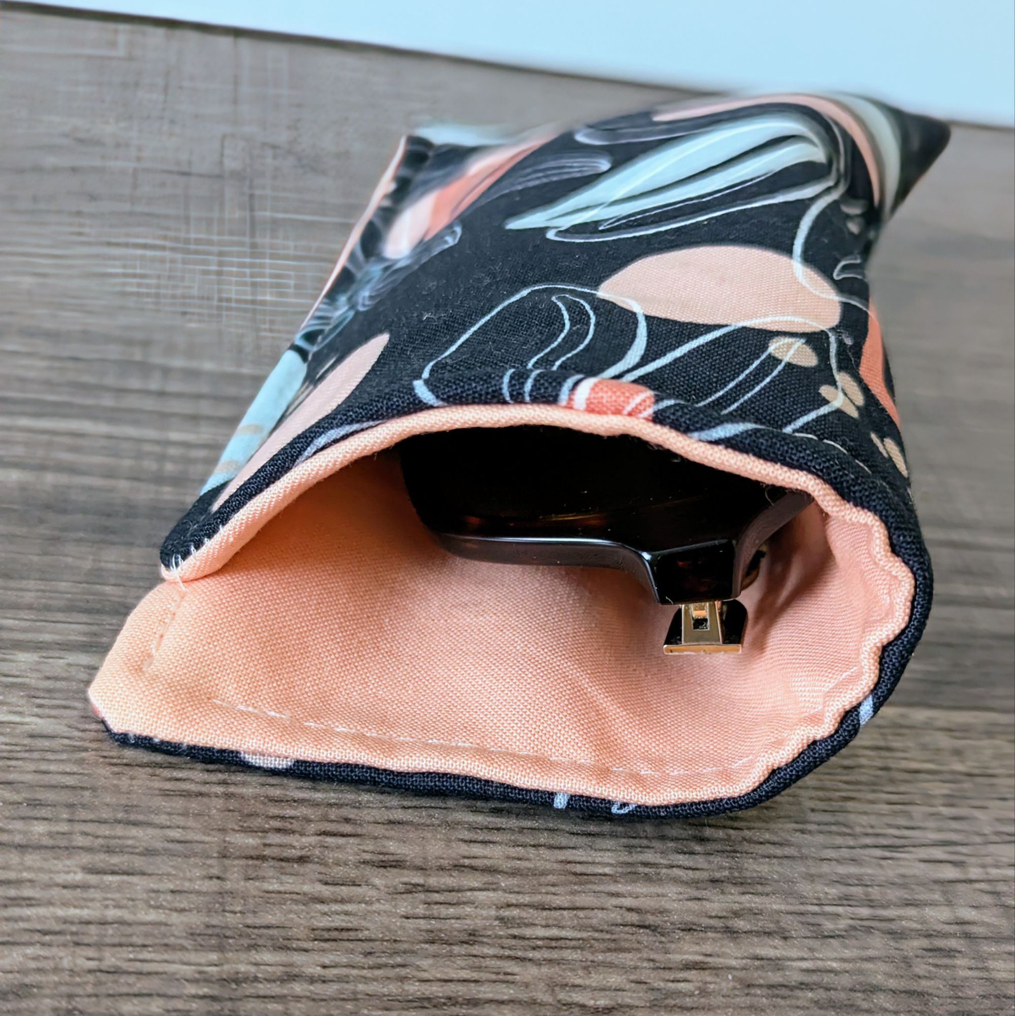 Keep your glasses safe, and add a little style with this soft eyeglass pouch. The exterior is a dark blue cotton featuring a palm leaf print. The interior is a peach cotton.