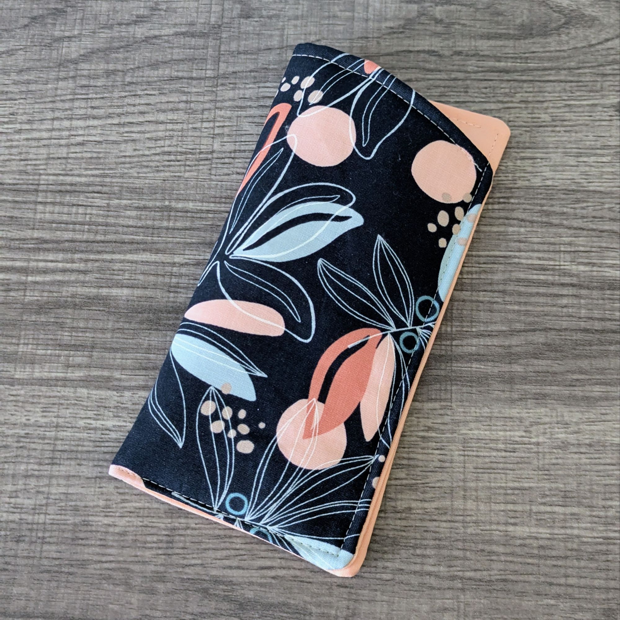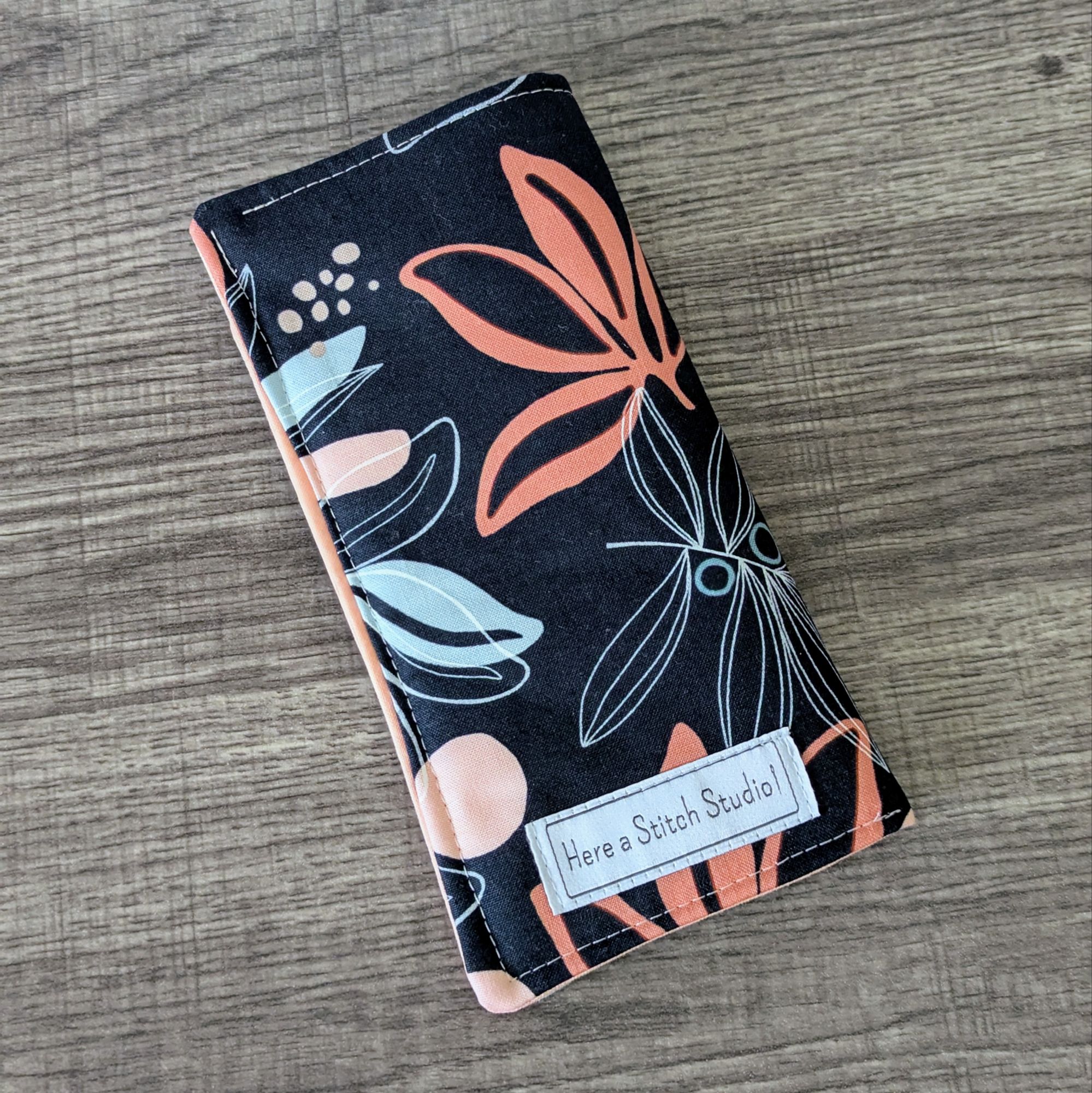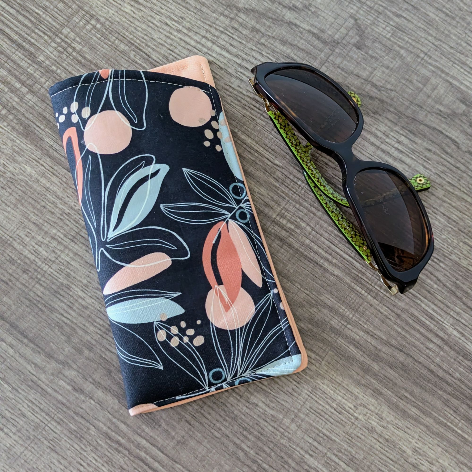 Keep your glasses safe, and add a little style with this soft eyeglass pouch. The exterior is a dark blue cotton featuring a palm leaf print. The interior is a peach cotton.