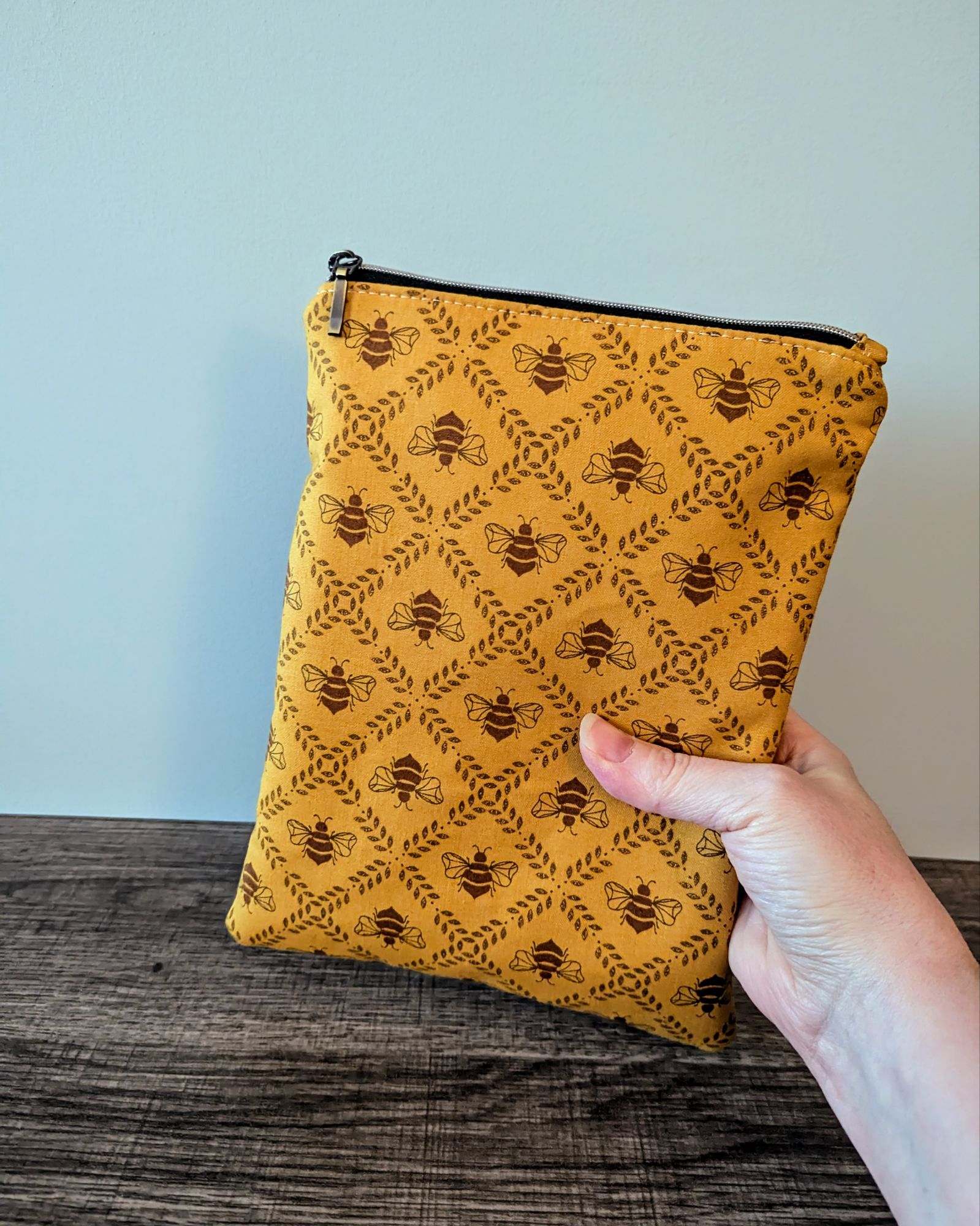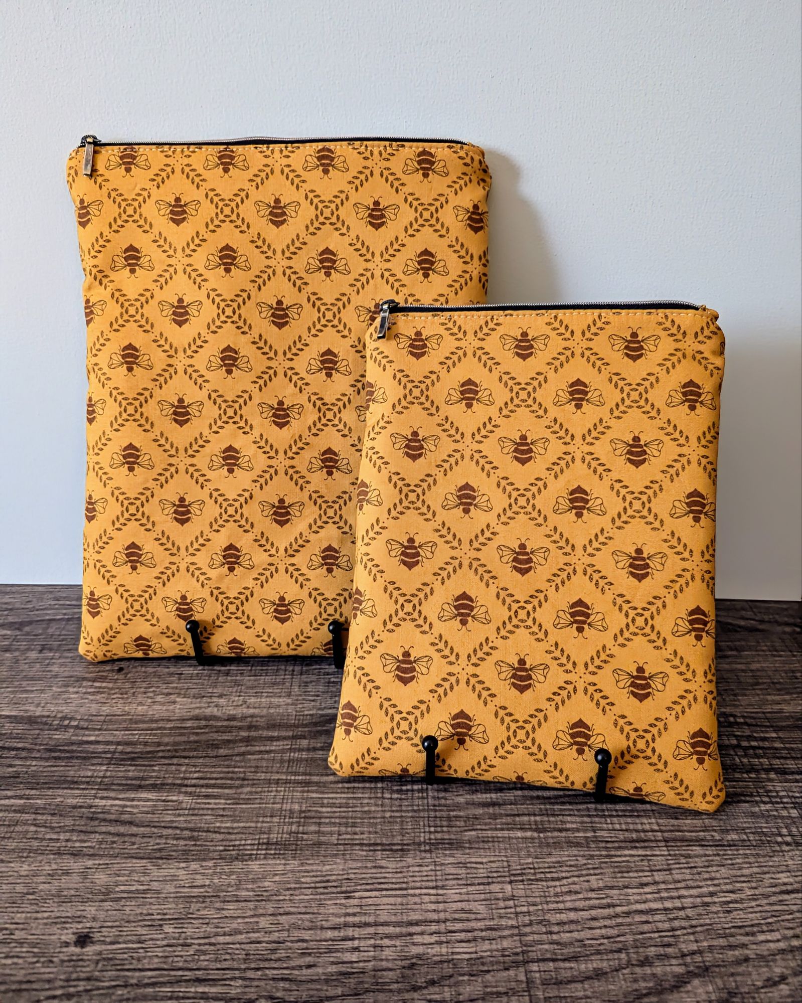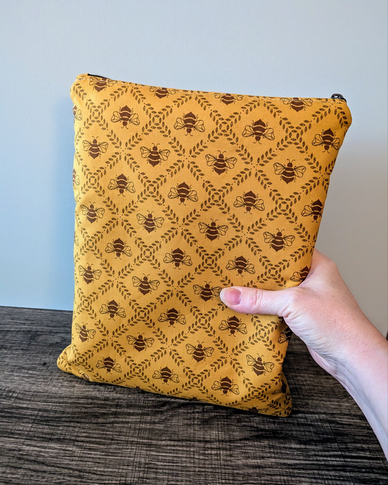 Protect your book, e-reader or tablet with this fabric book sleeve. These sleeves feature a honey bee print on dark golden yellow cotton and have a beige cotton lining. The small book sleeve fits smaller paper backs, as well as some e-readers and tablets. The larger book sleeve fits some larger paper backs and hardcover books, as well as e-readers and tablets. Approximate size of book sleeves are below to check if they will fit your book or device.