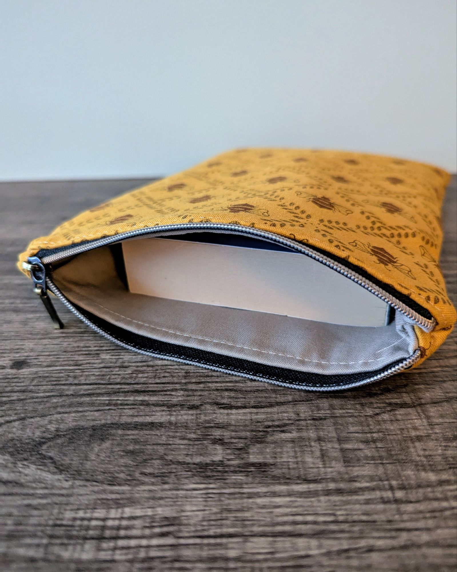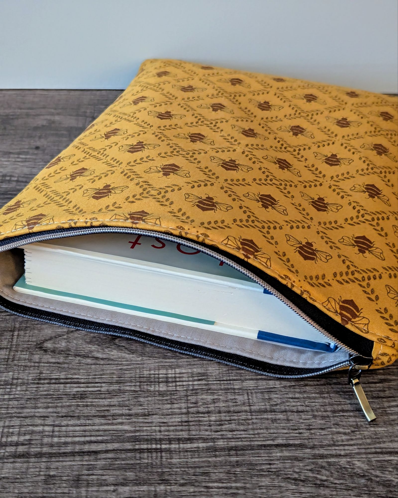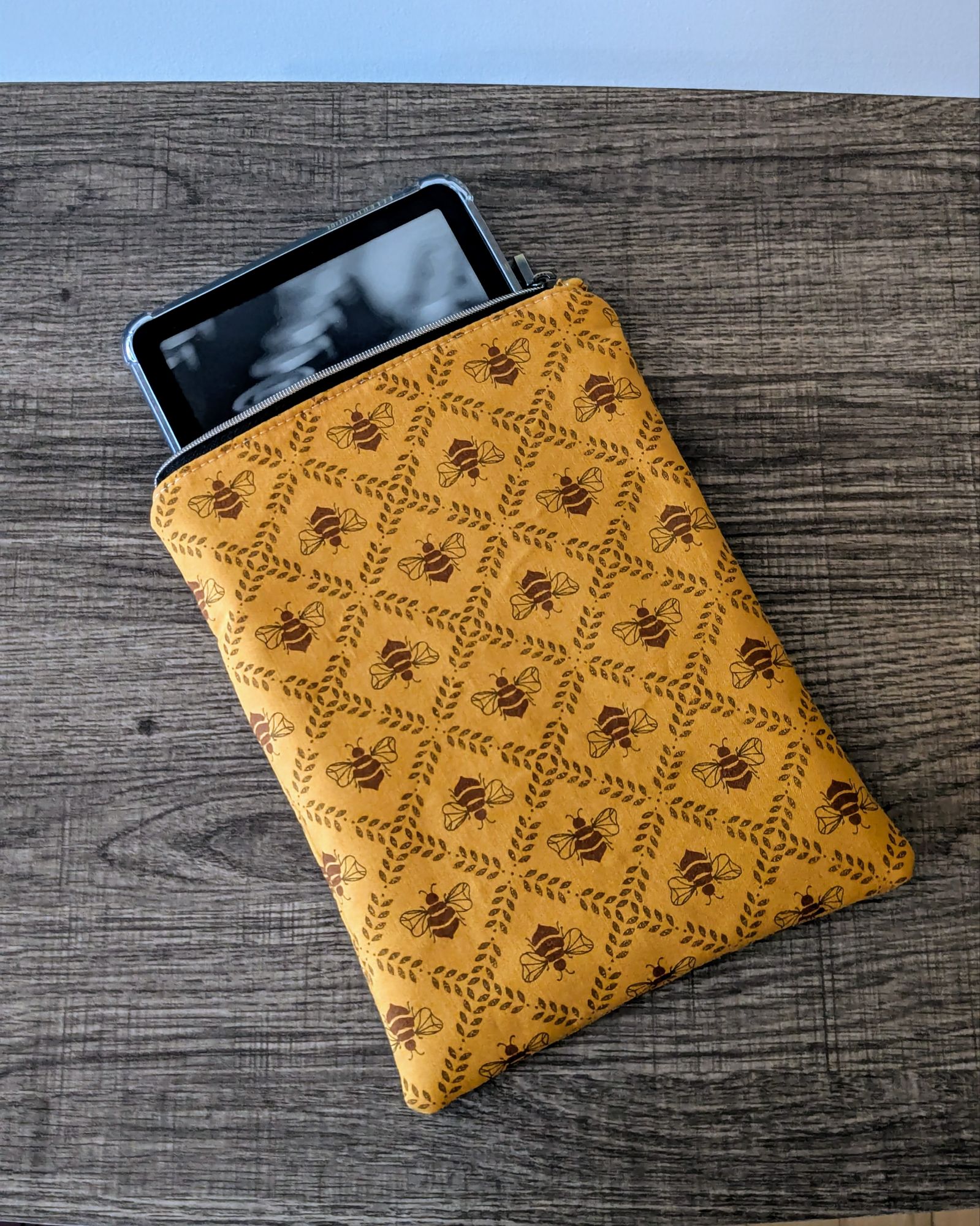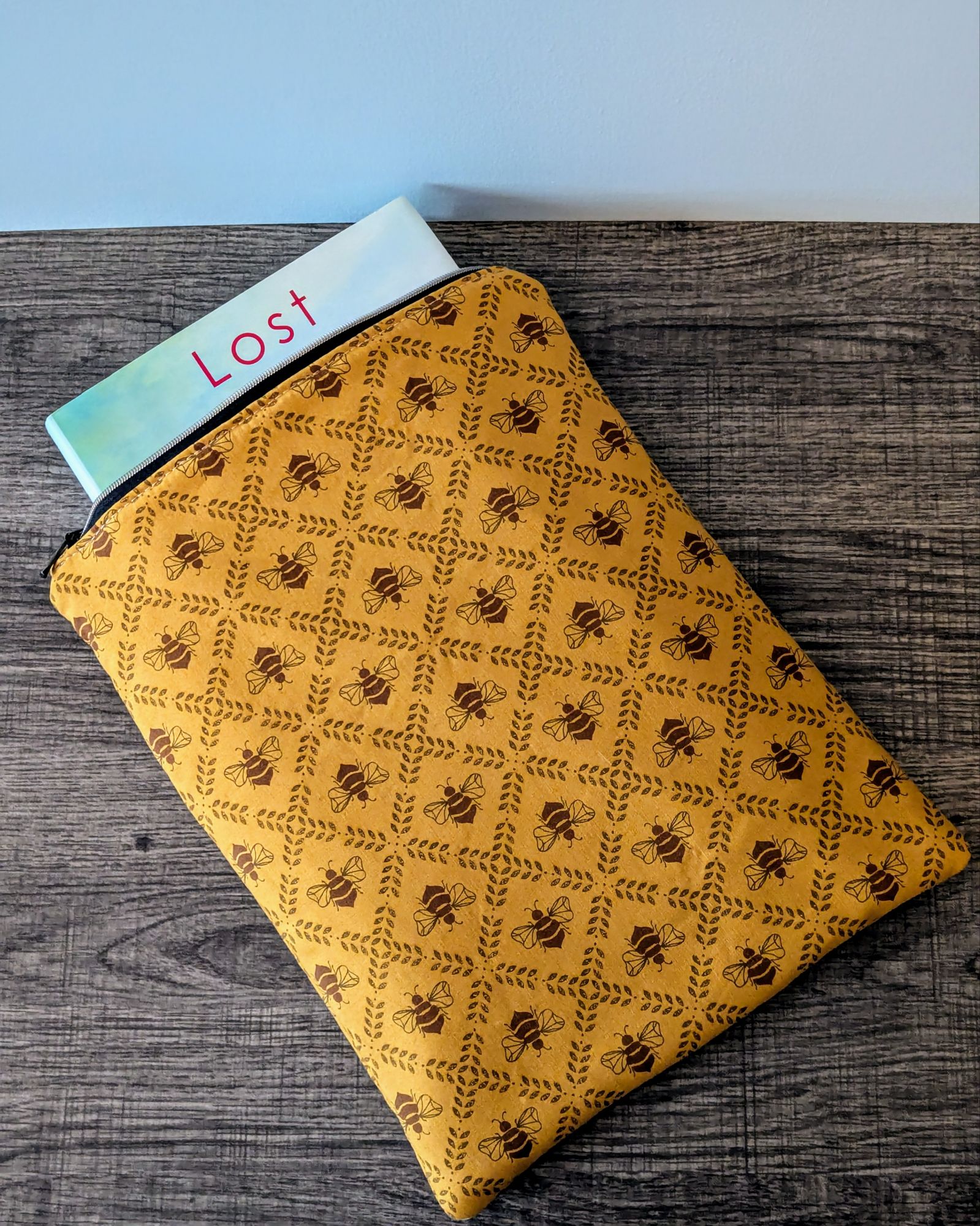 Protect your book, e-reader or tablet with this fabric book sleeve. These sleeves feature a honey bee print on dark golden yellow cotton and have a beige cotton lining. The small book sleeve fits smaller paper backs, as well as some e-readers and tablets. The larger book sleeve fits some larger paper backs and hardcover books, as well as e-readers and tablets. Approximate size of book sleeves are below to check if they will fit your book or device.