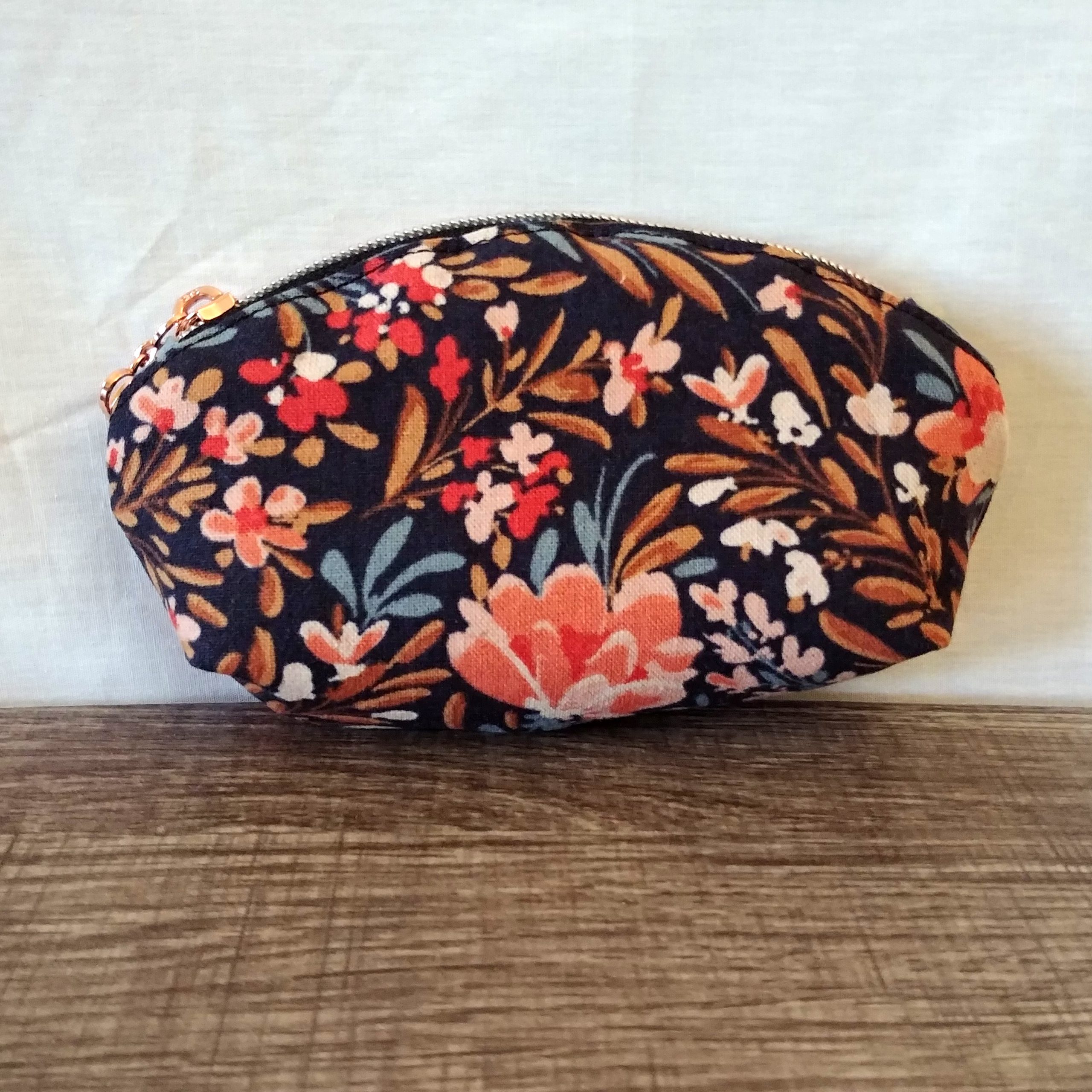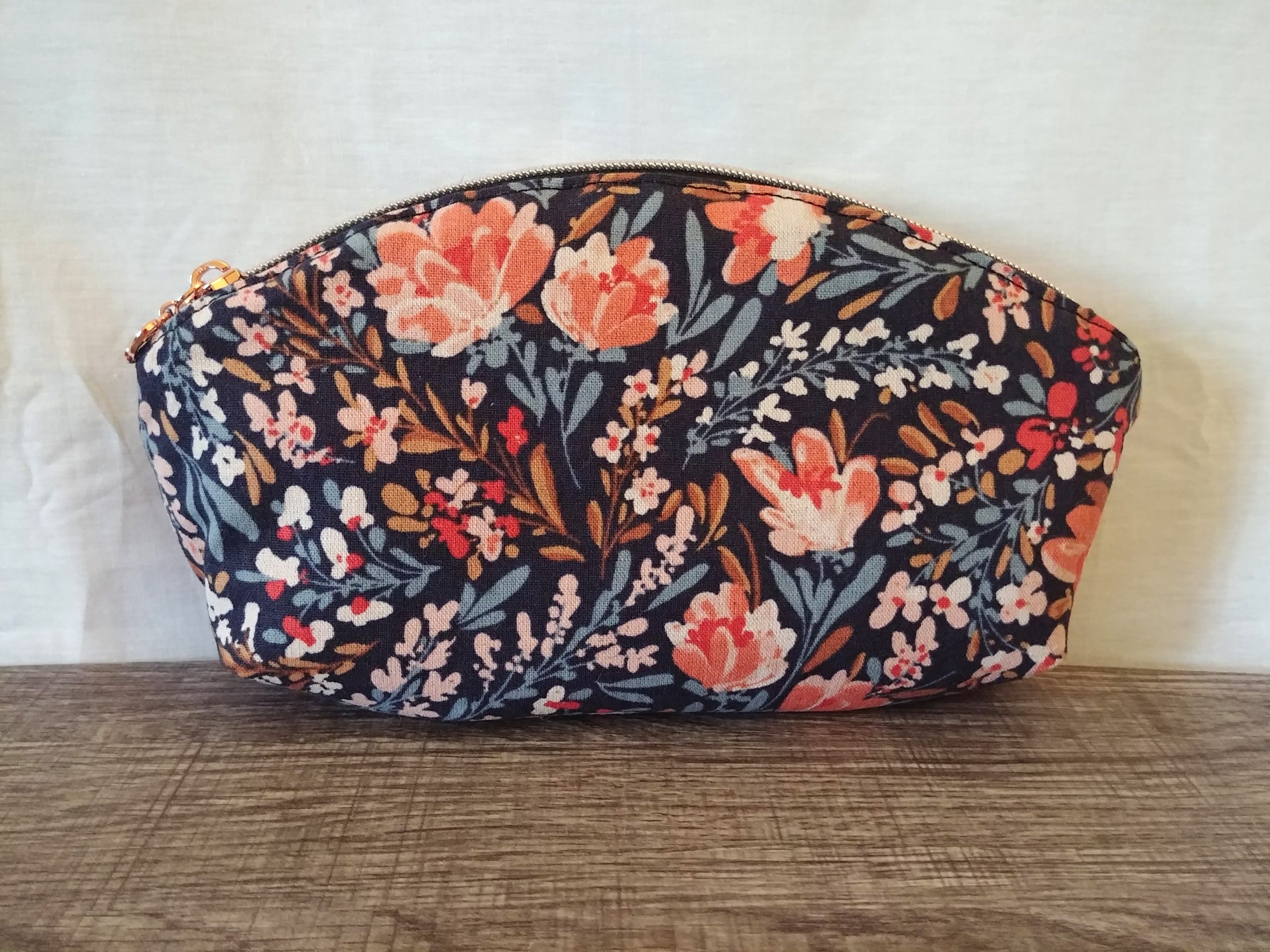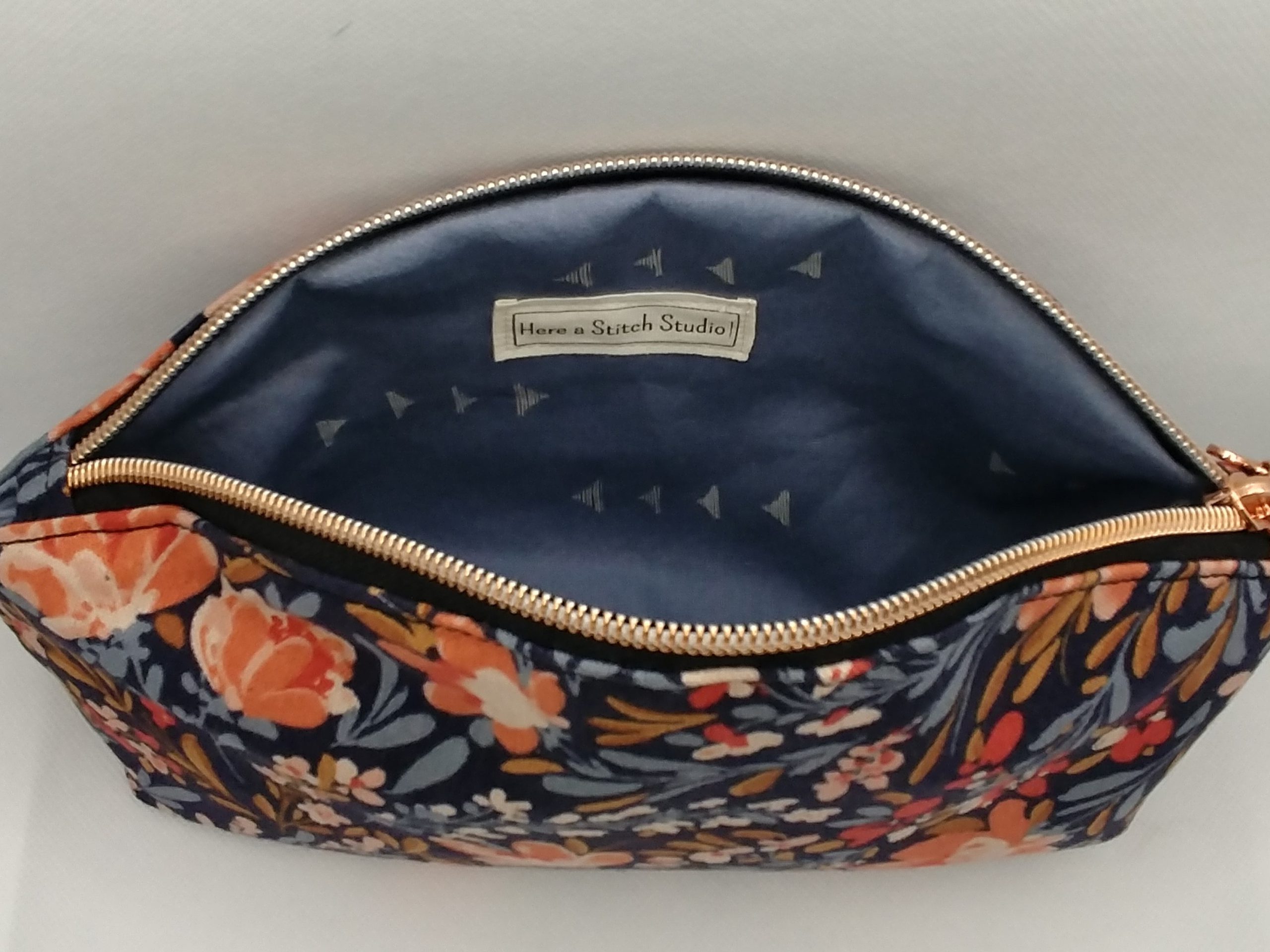 Navy floral canvas zipper pouch makes the perfect toiletry and cosmetic bag. Great toiletry bag to use when travelling. This cosmetic bag comes in two sizes, large and small, to accommodate your personal care storage needs. This pouch is also makes a great notions bag or pencil case. Features a zipper in rose gold finish with a heart shaped zipper pull.
