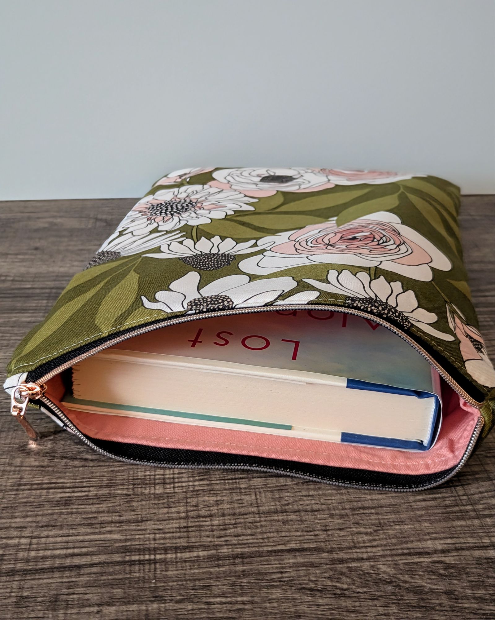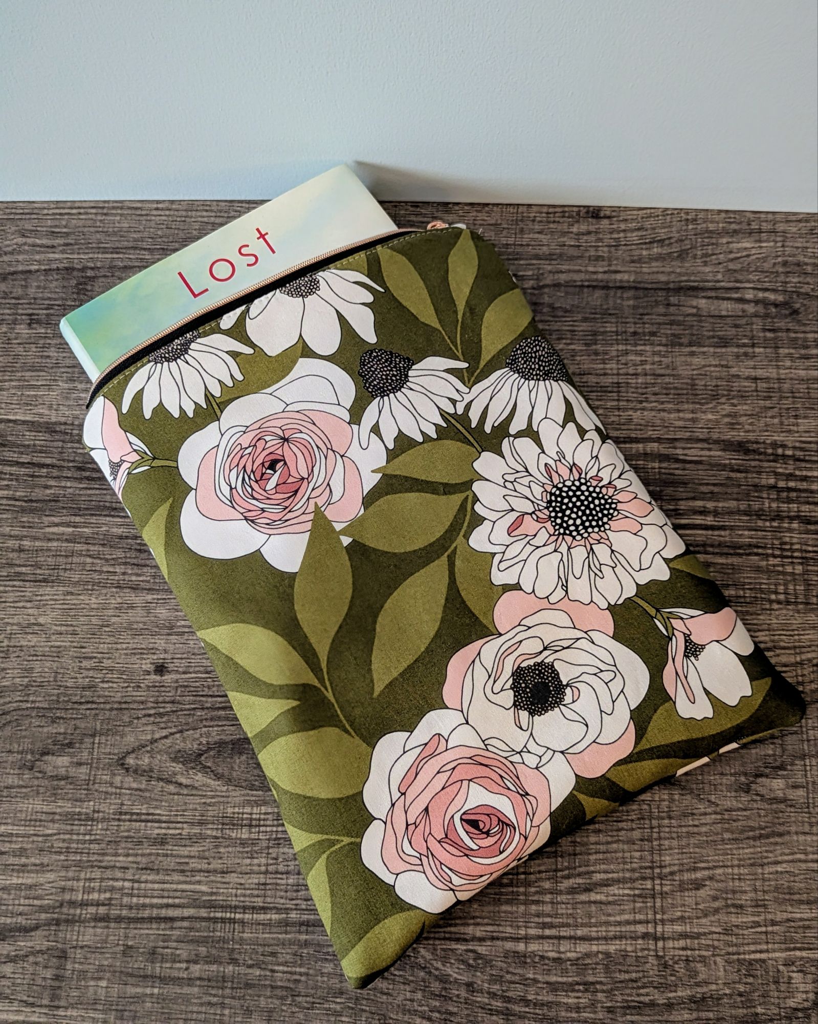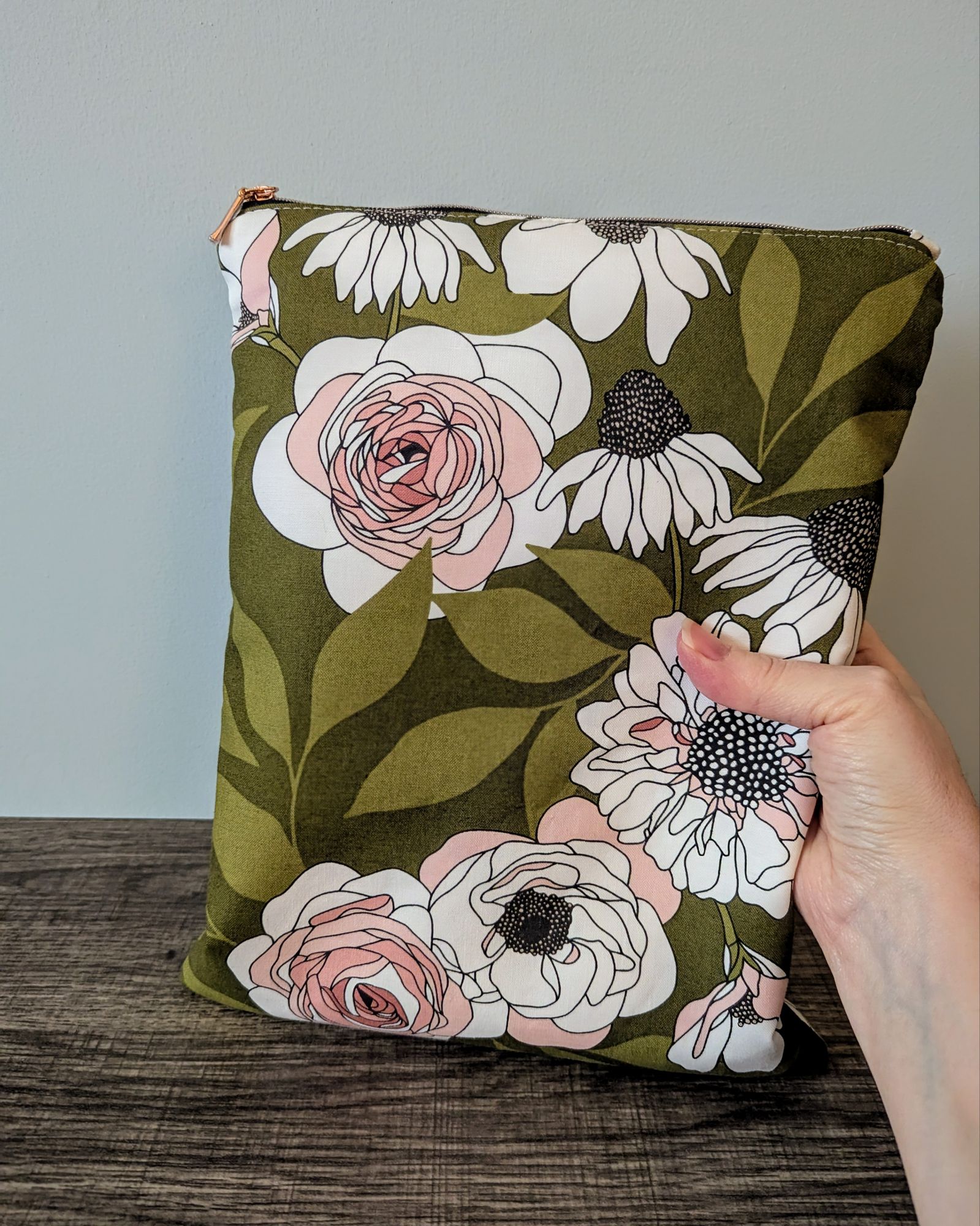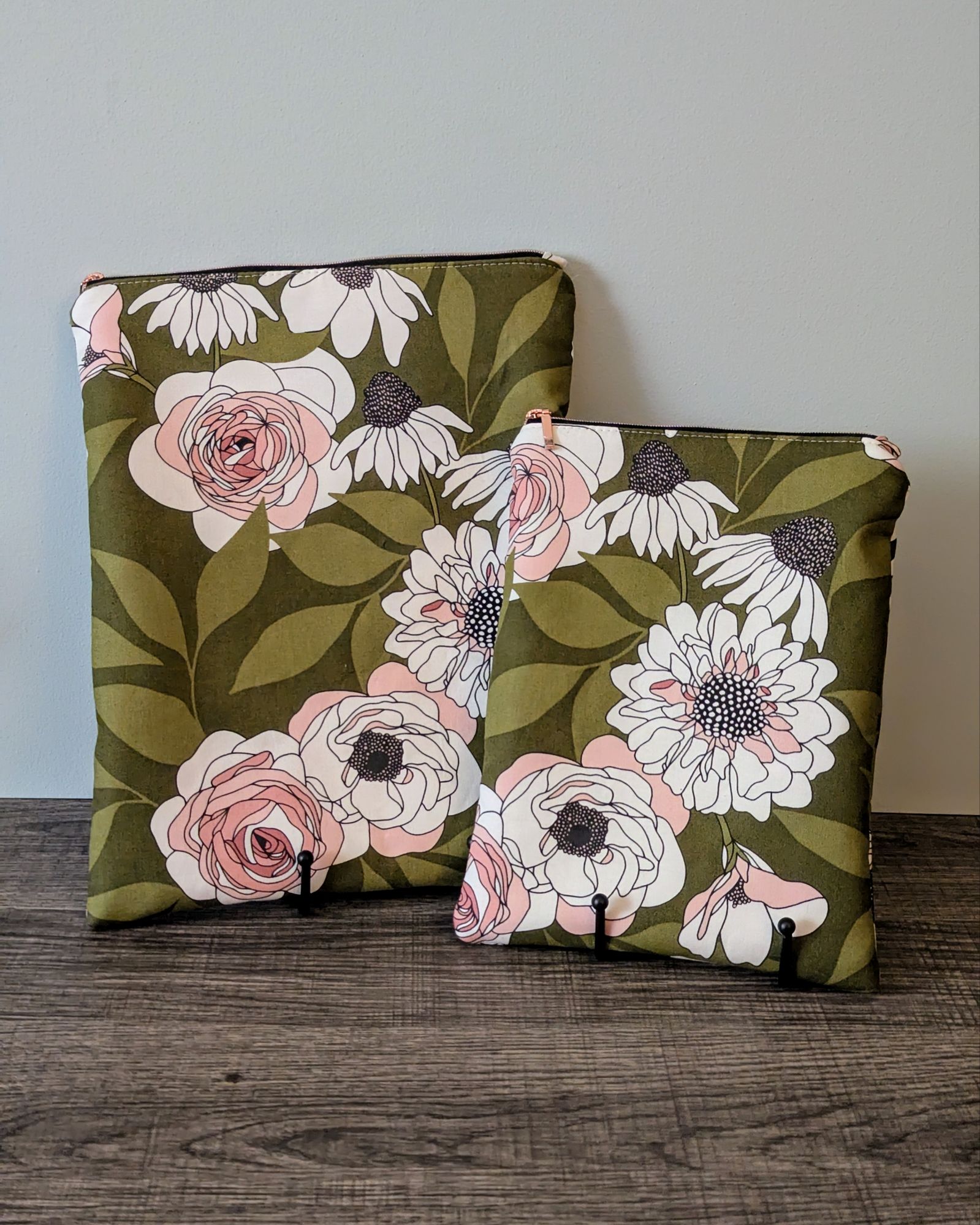 Protect your book, e-reader or tablet with this fabric book sleeve. These sleeves feature a large floral print on olive green cotton and have a pink cotton lining. The small book sleeve fits smaller paper backs, as well as some e-readers and tablets. The larger book sleeve fits some larger paper backs and hardcover books, as well as e-readers and tablets. Approximate size of book sleeves are below to check if they will fit your book or device.