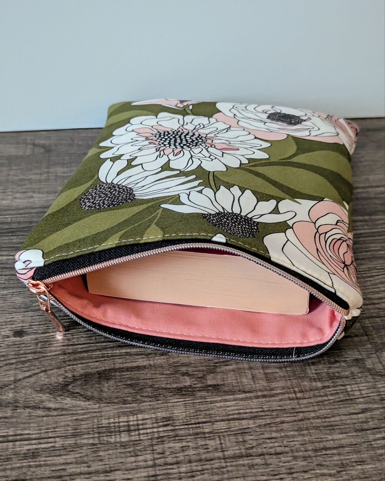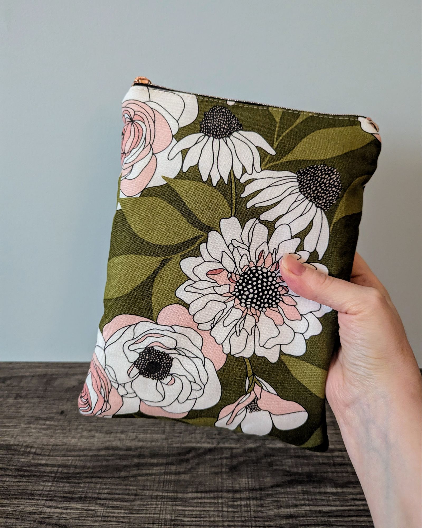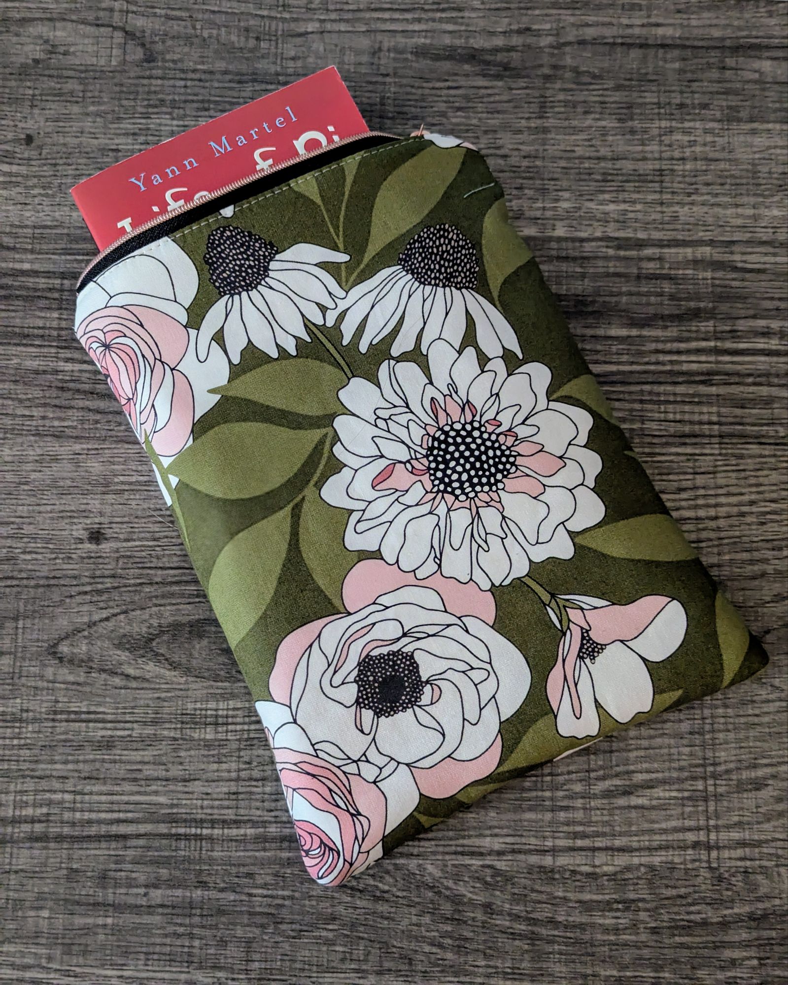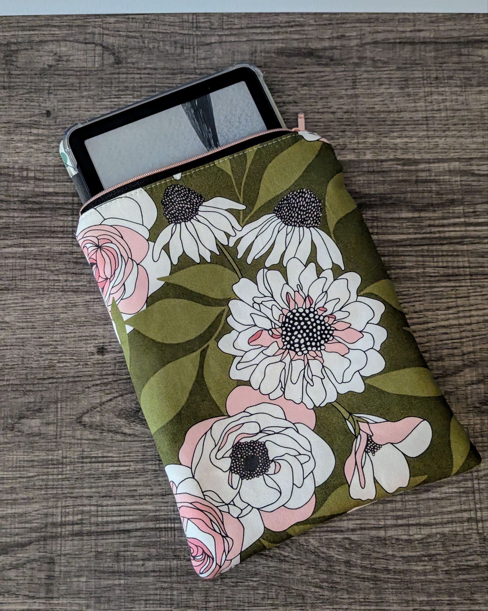 Protect your book, e-reader or tablet with this fabric book sleeve. These sleeves feature a large floral print on olive green cotton and have a pink cotton lining. The small book sleeve fits smaller paper backs, as well as some e-readers and tablets. The larger book sleeve fits some larger paper backs and hardcover books, as well as e-readers and tablets. Approximate size of book sleeves are below to check if they will fit your book or device.