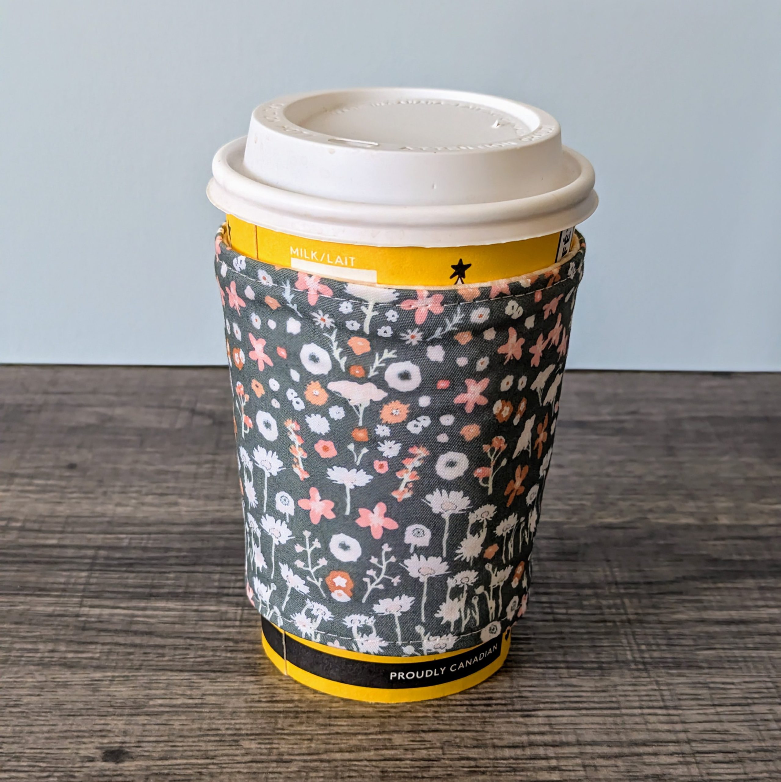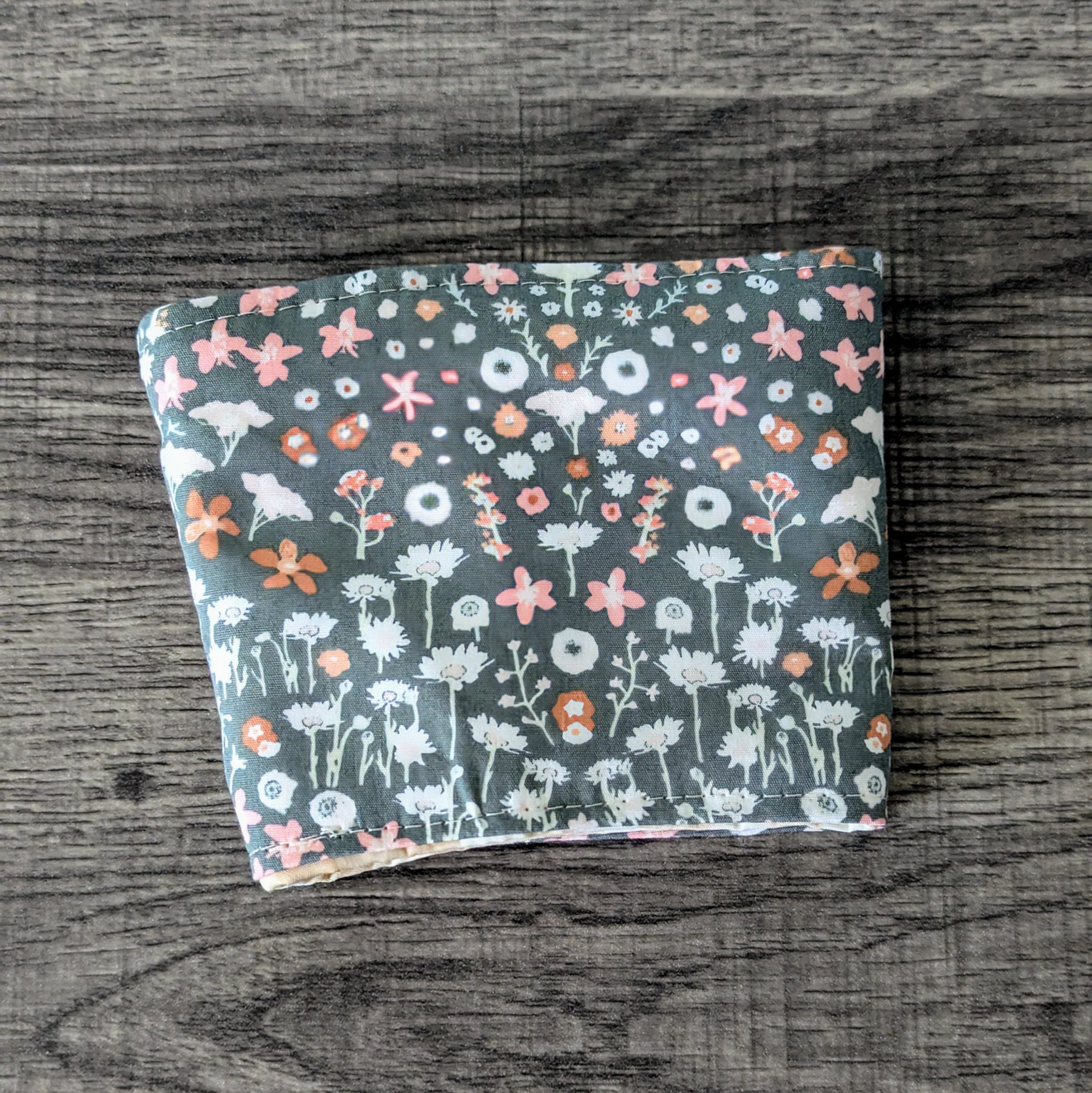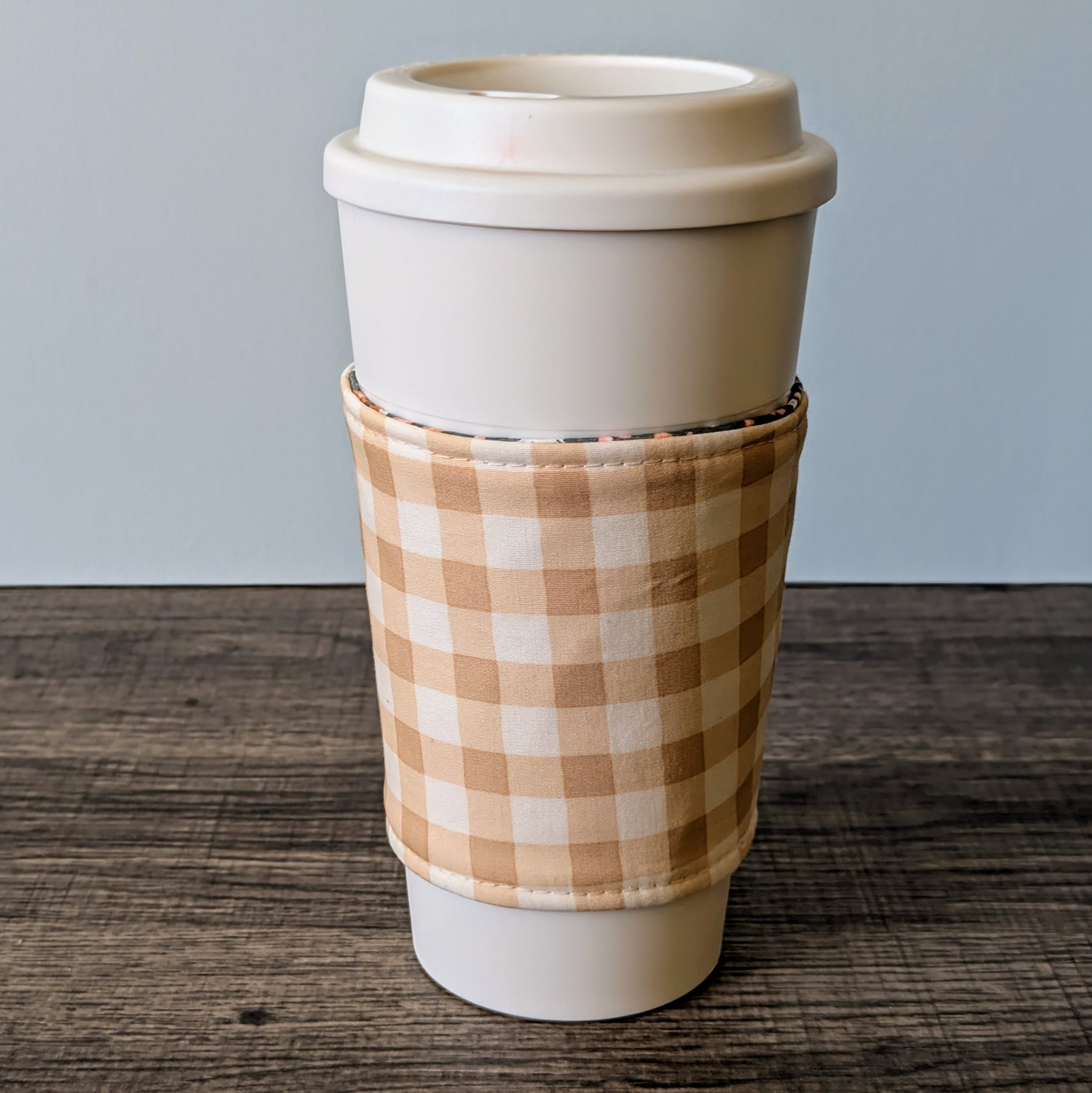 Keep your hands protected from both hot and cold drinks, and add some style to your on the go cup with this reversible cup cozy. One side features a floral print on grey fabric, while the other side features a beige gingham print.