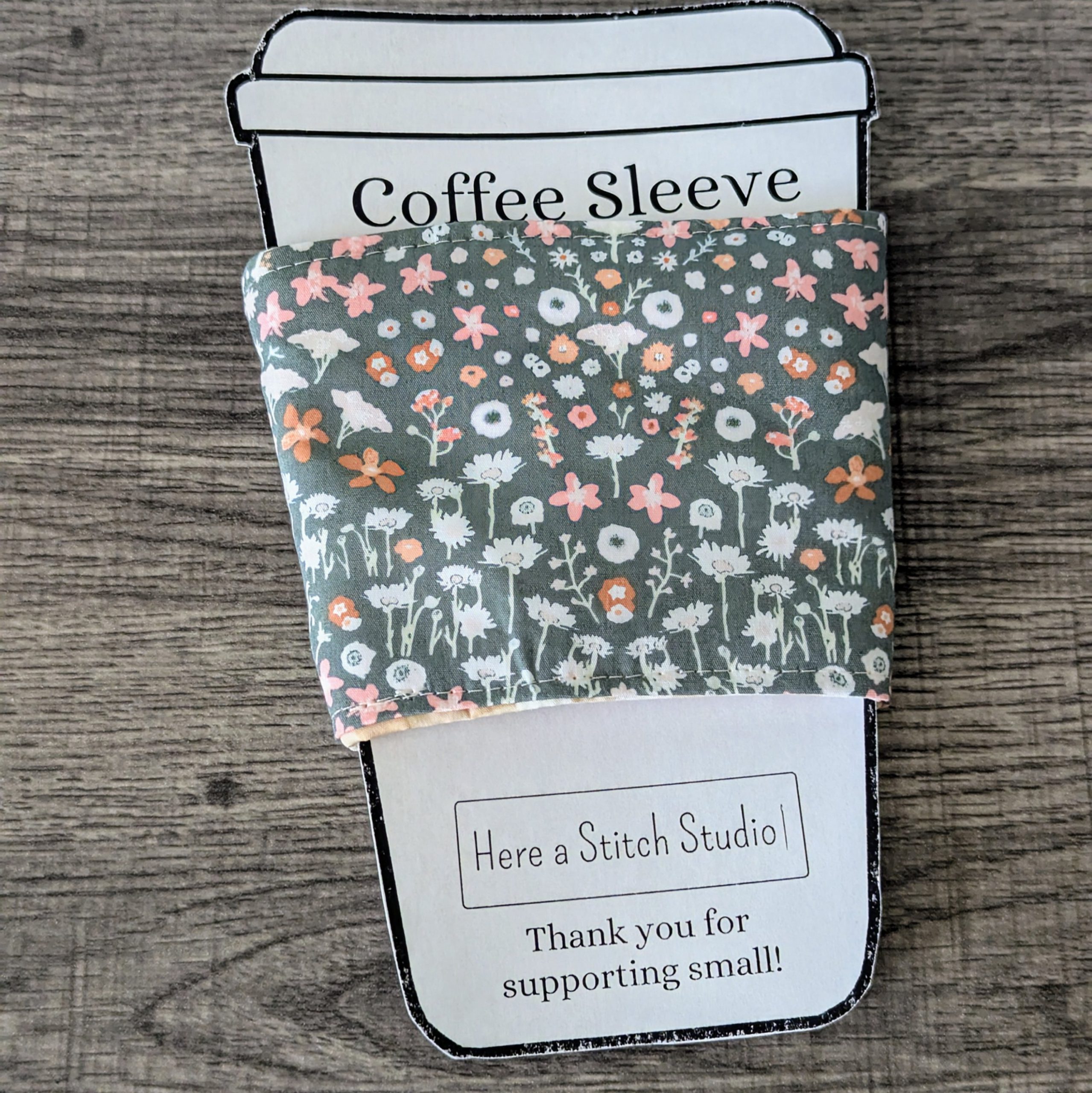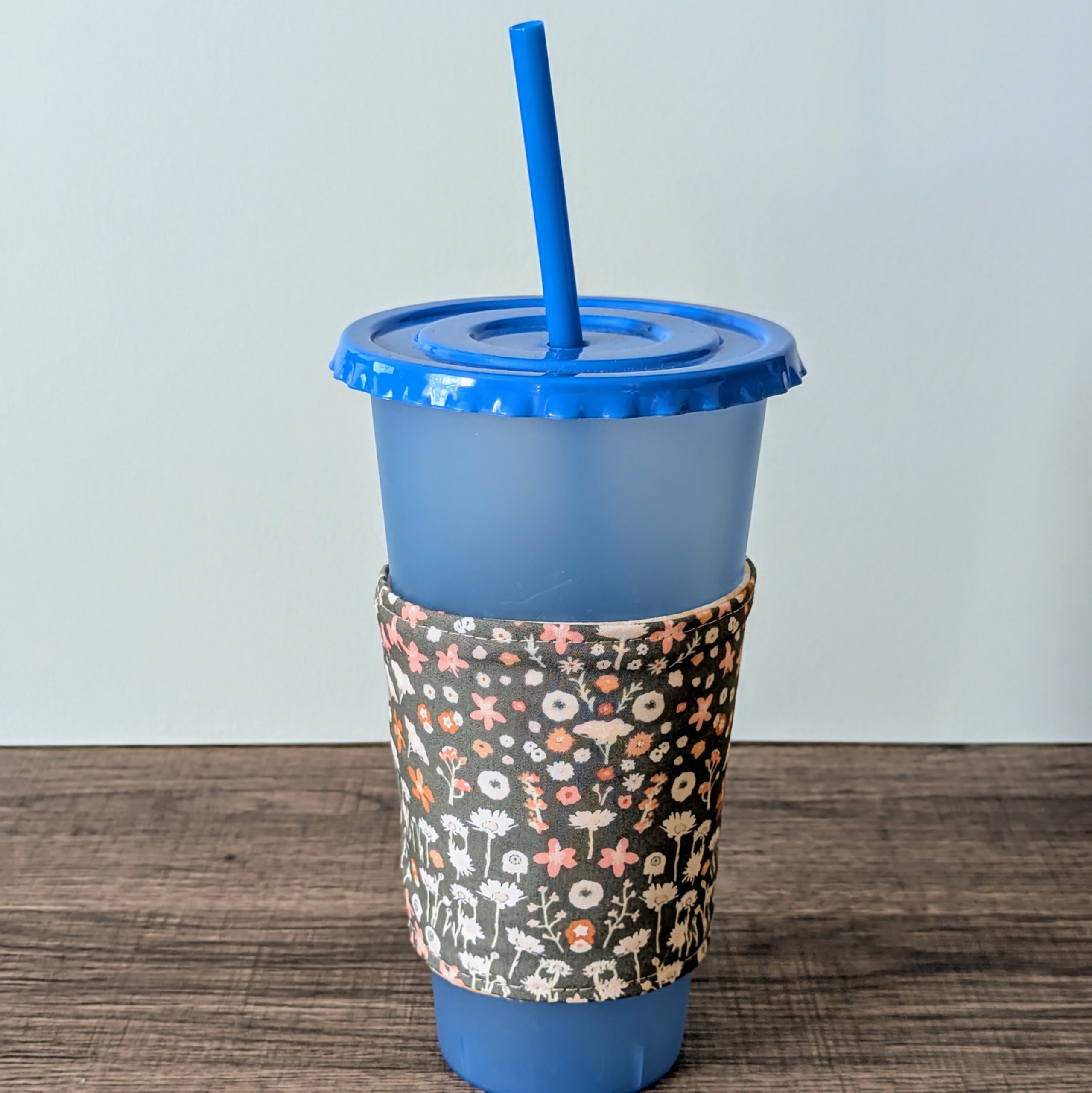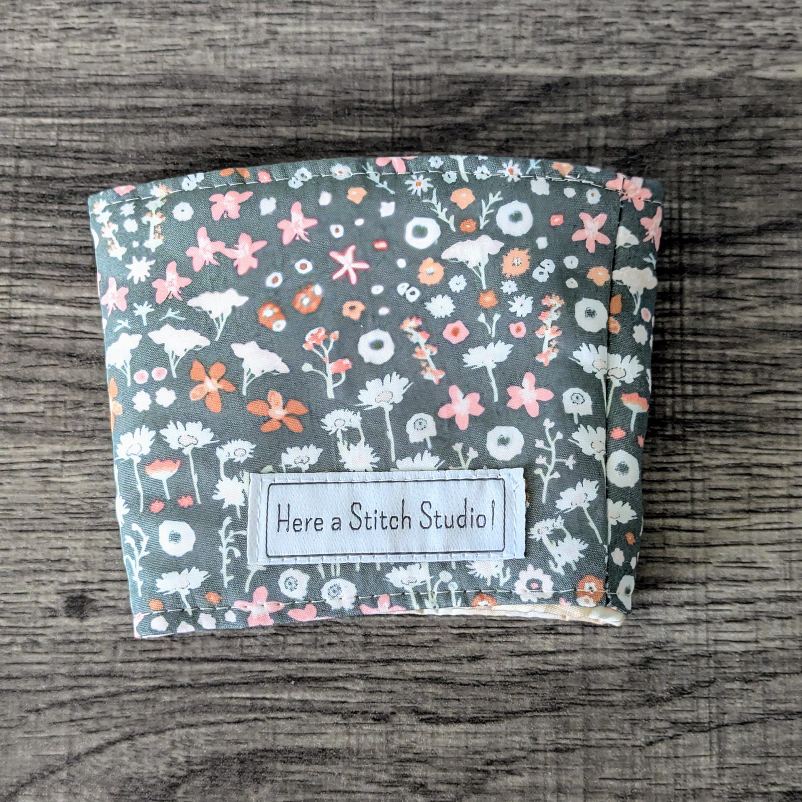 Keep your hands protected from both hot and cold drinks, and add some style to your on the go cup with this reversible cup cozy. One side features a floral print on grey fabric, while the other side features a beige gingham print.