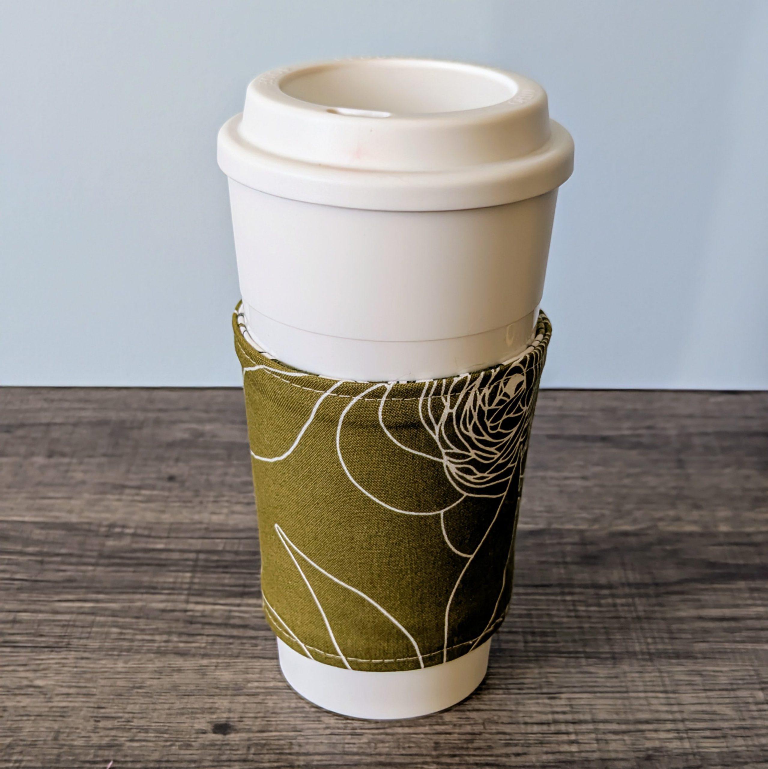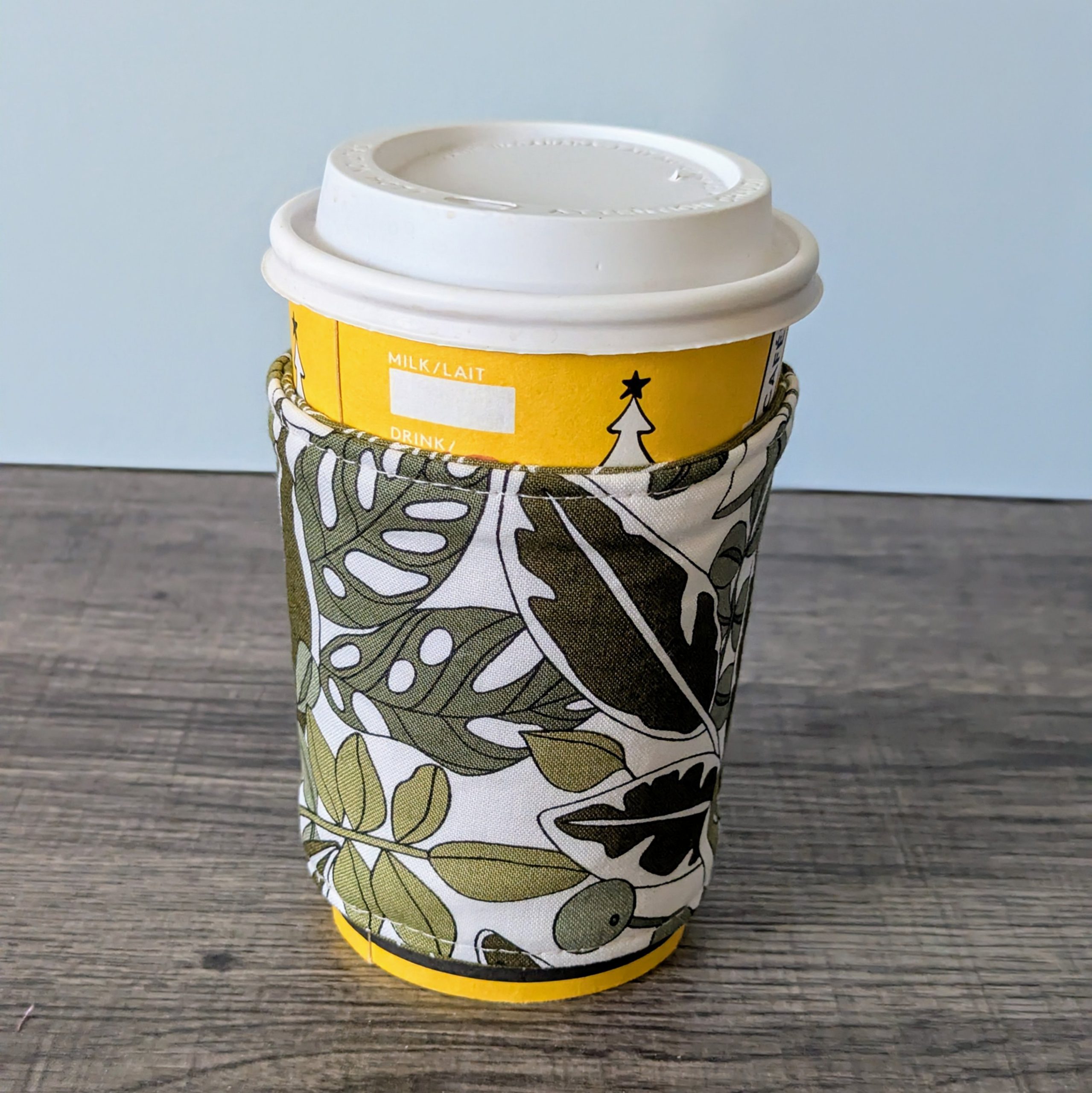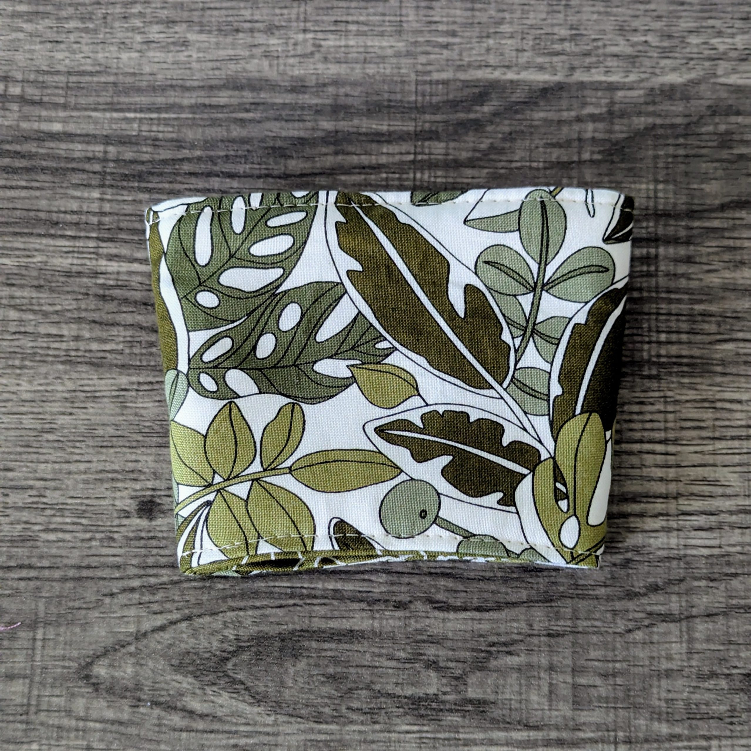 Keep your hands protected from both hot and cold drinks, and add some style to your on the go cup with this reversible cup cozy. One side features a green leaf print on white fabric, while the other side features a etched floral print on green fabric.