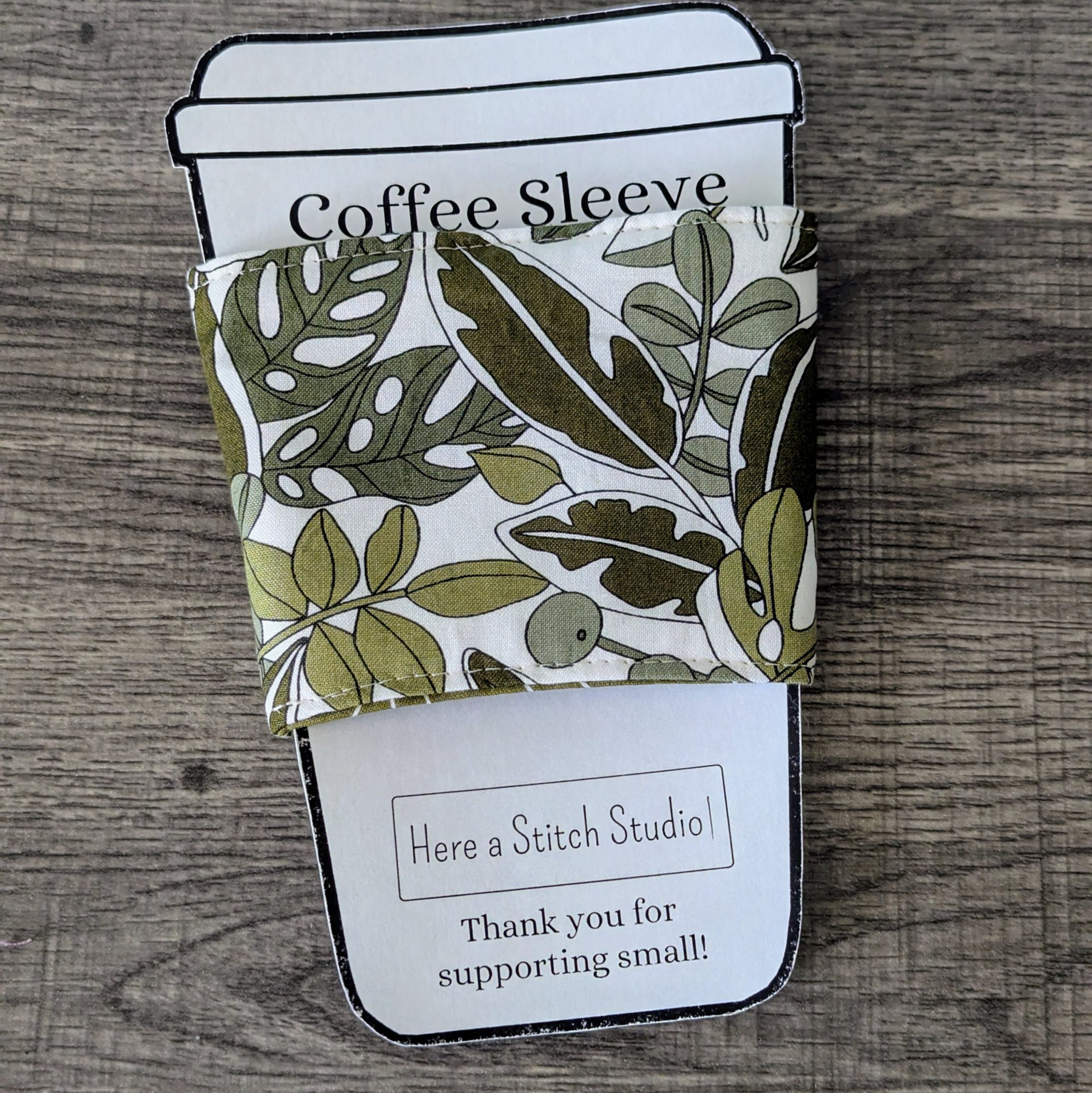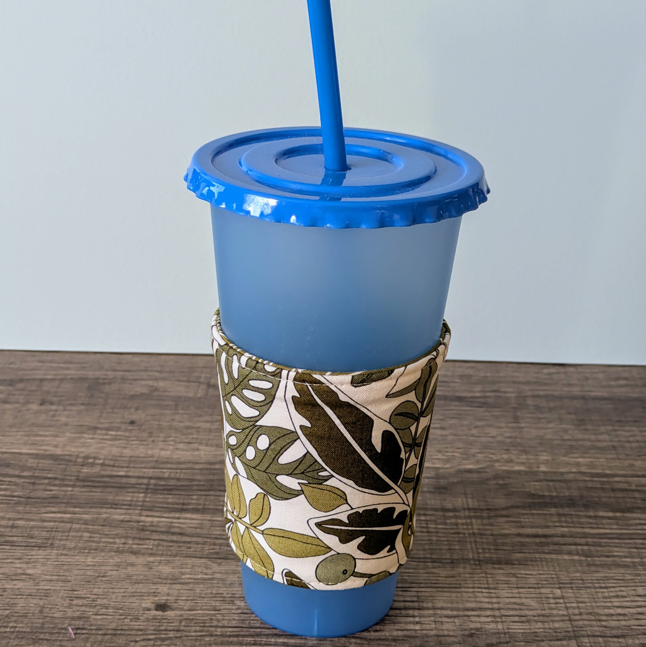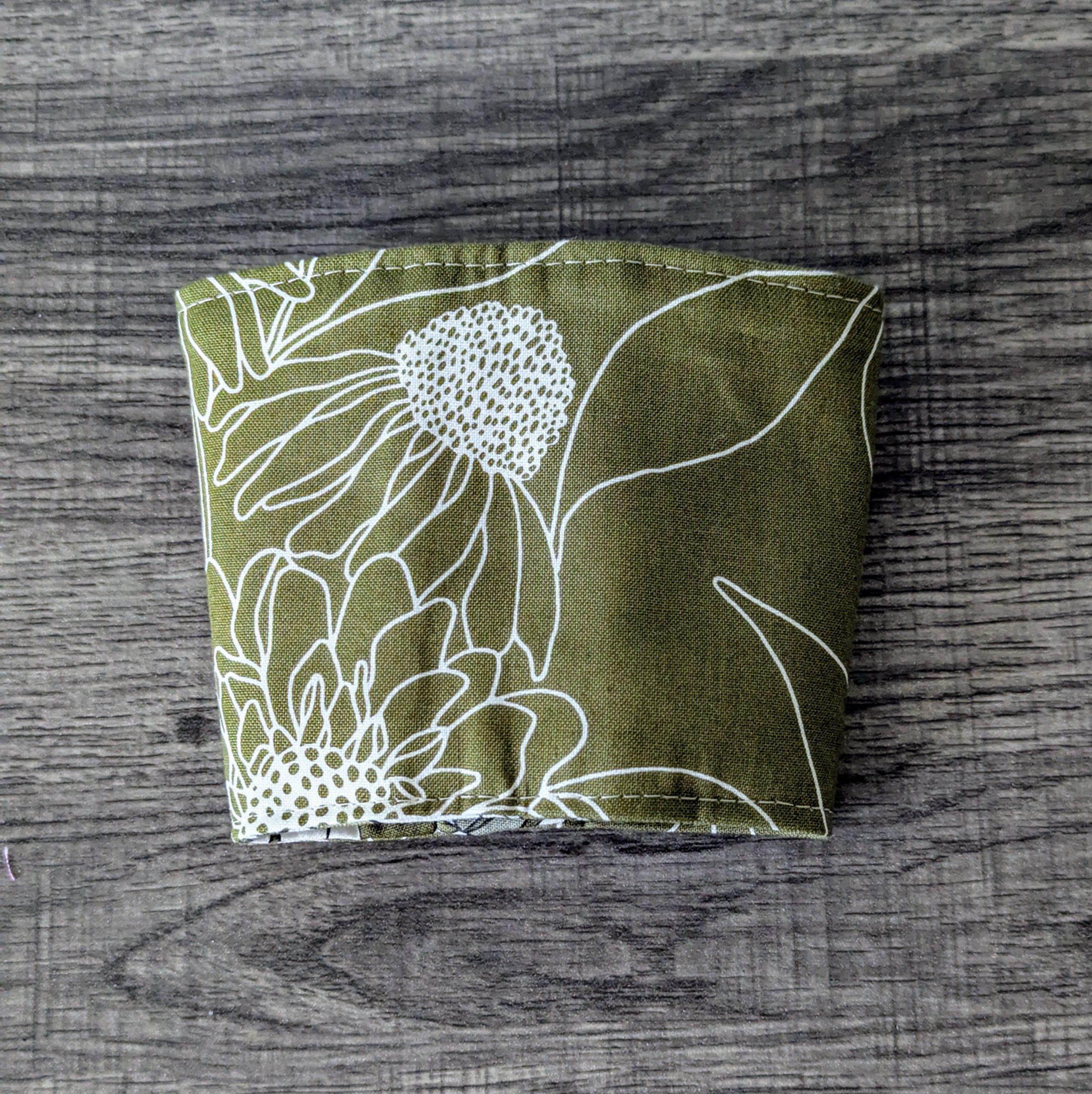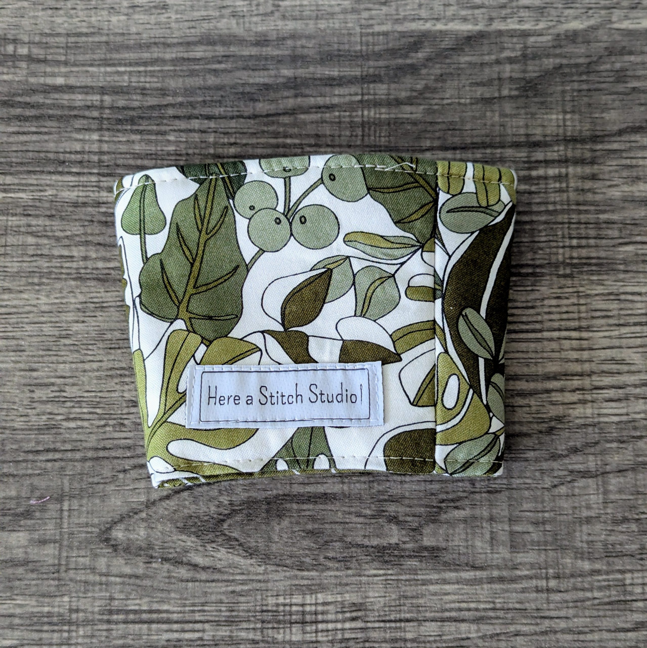Keep your hands protected from both hot and cold drinks, and add some style to your on the go cup with this reversible cup cozy. One side features a green leaf print on white fabric, while the other side features a etched floral print on green fabric.