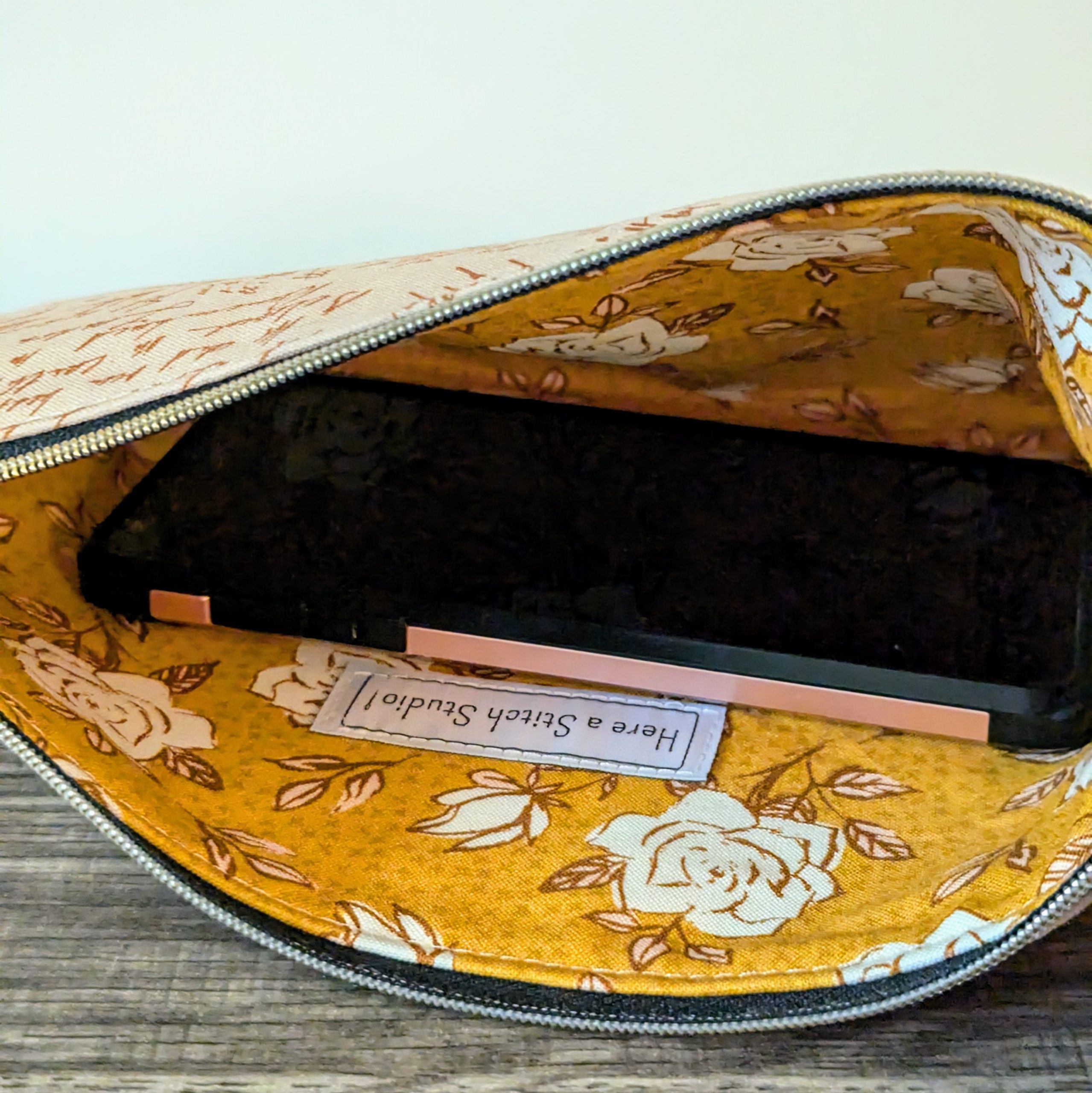The exterior and interior of the pouch are made from 100% cotton fabric, and both are interfaced for extra durability. Each pouch has a metal zipper made with a heart shaped zipper pull in a gold finish.