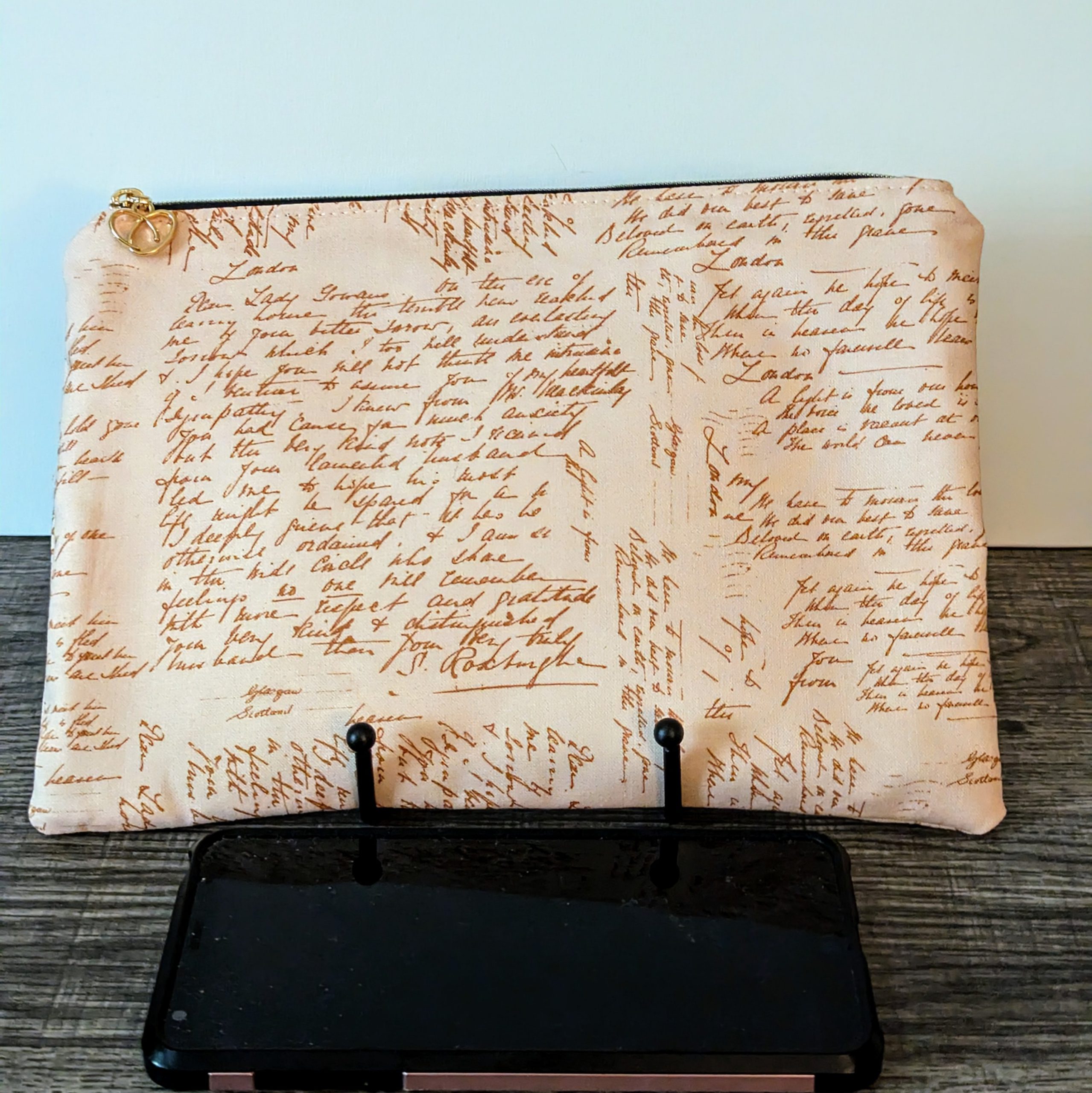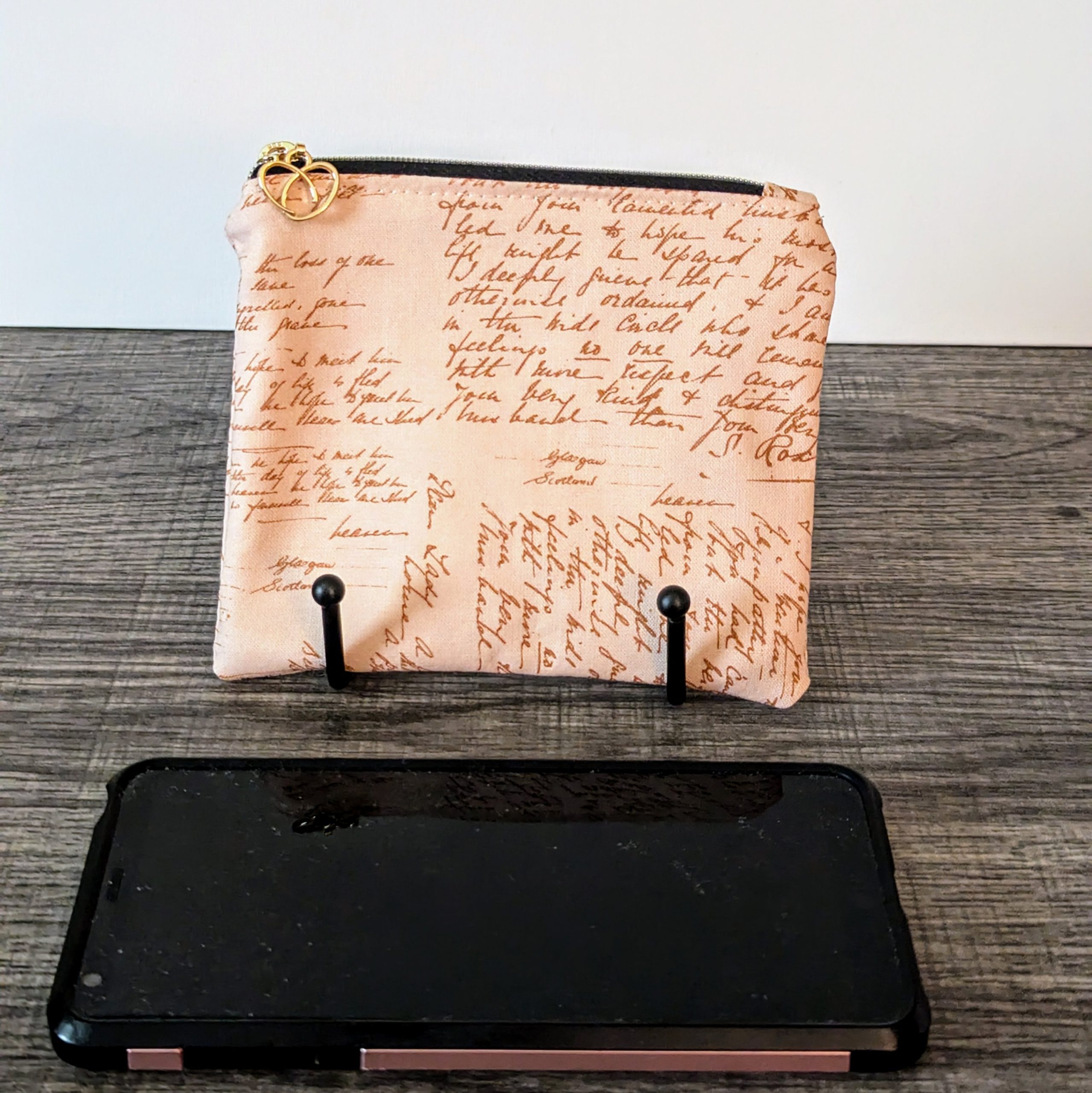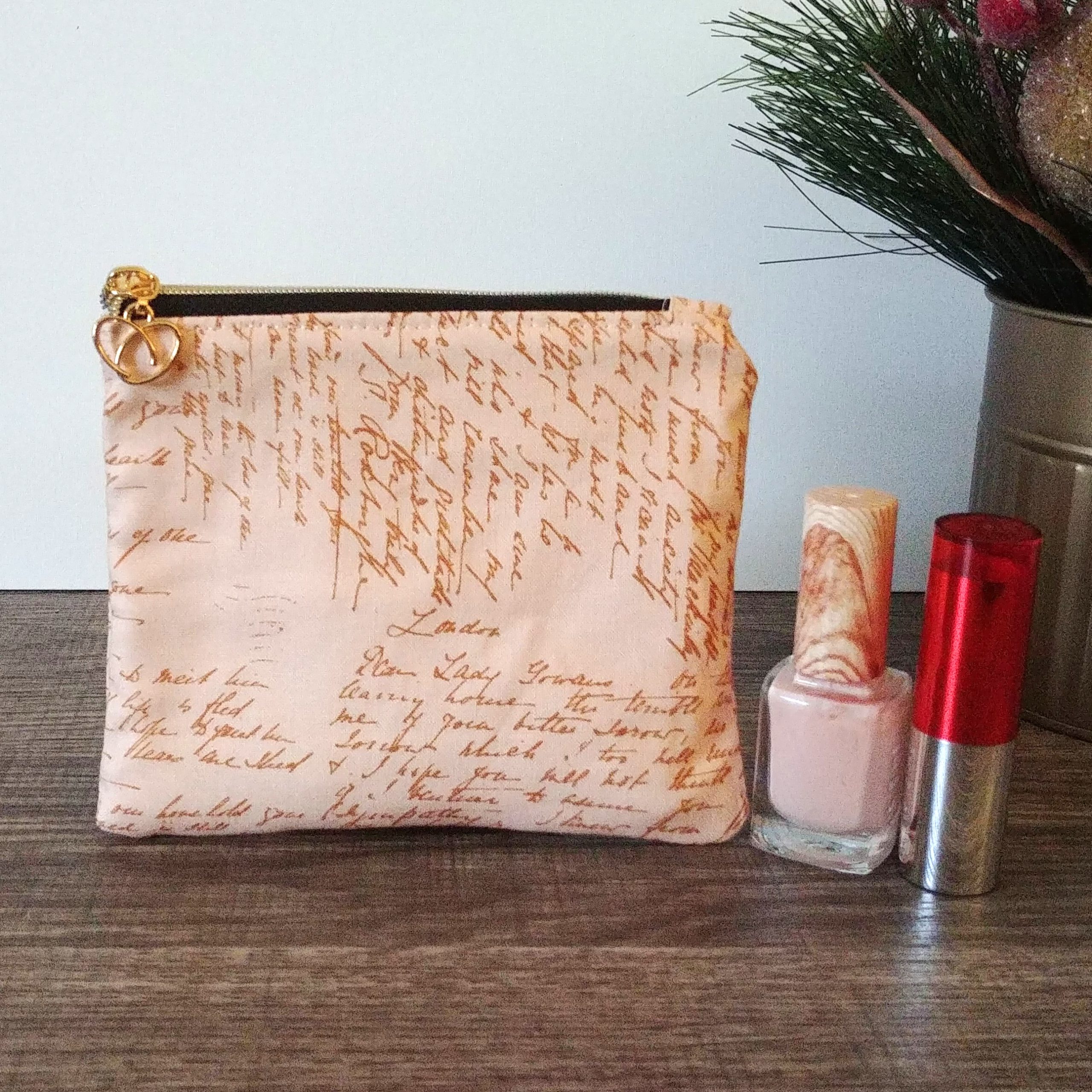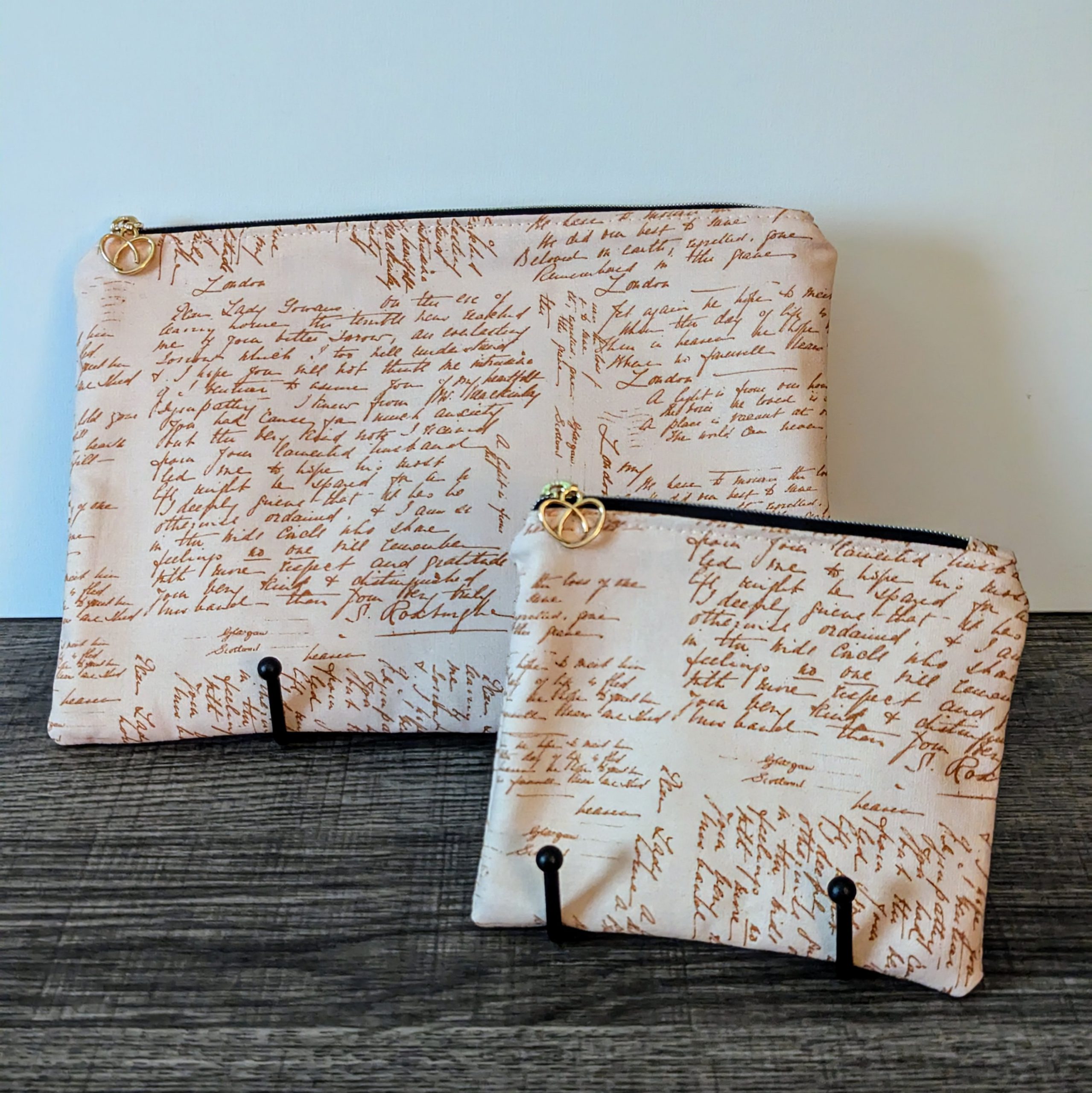 This light pink pouch features a handwriting print fabric. The small zipper pouch makes a nice money and coin purse, and it is the right size to hold debit, credit and gift cards. The large zipper pouch is a good size as a make up bag, pencil case, or as a pouch for small books.