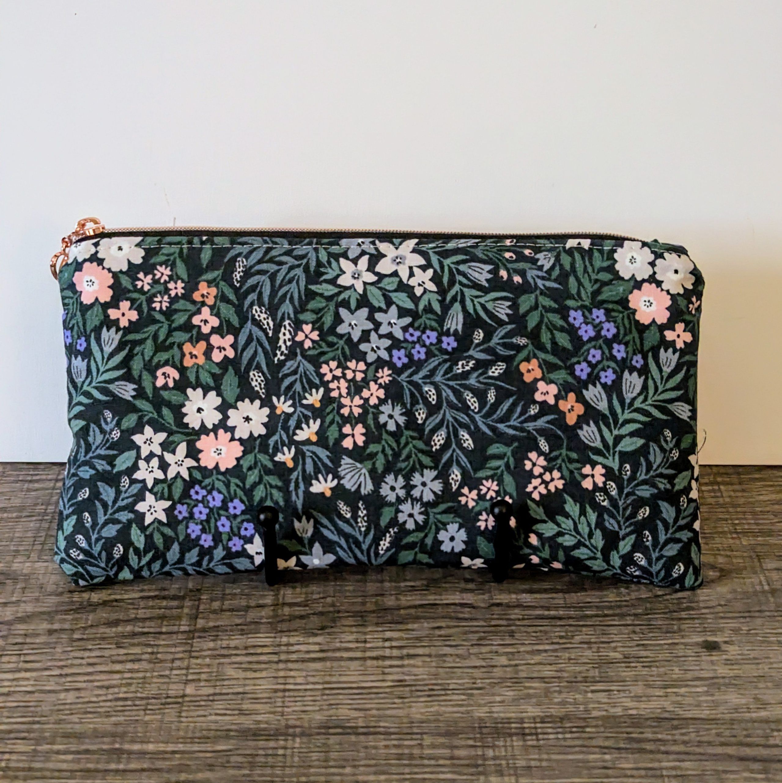 The exterior fabric is 100% organic cotton from Cloud 9 Fabrics, and the interior is made from 100% cotton fabric from Dear Stella, and both are interfaced for extra durability. Each pouch has a metal zipper in a rose gold finish.