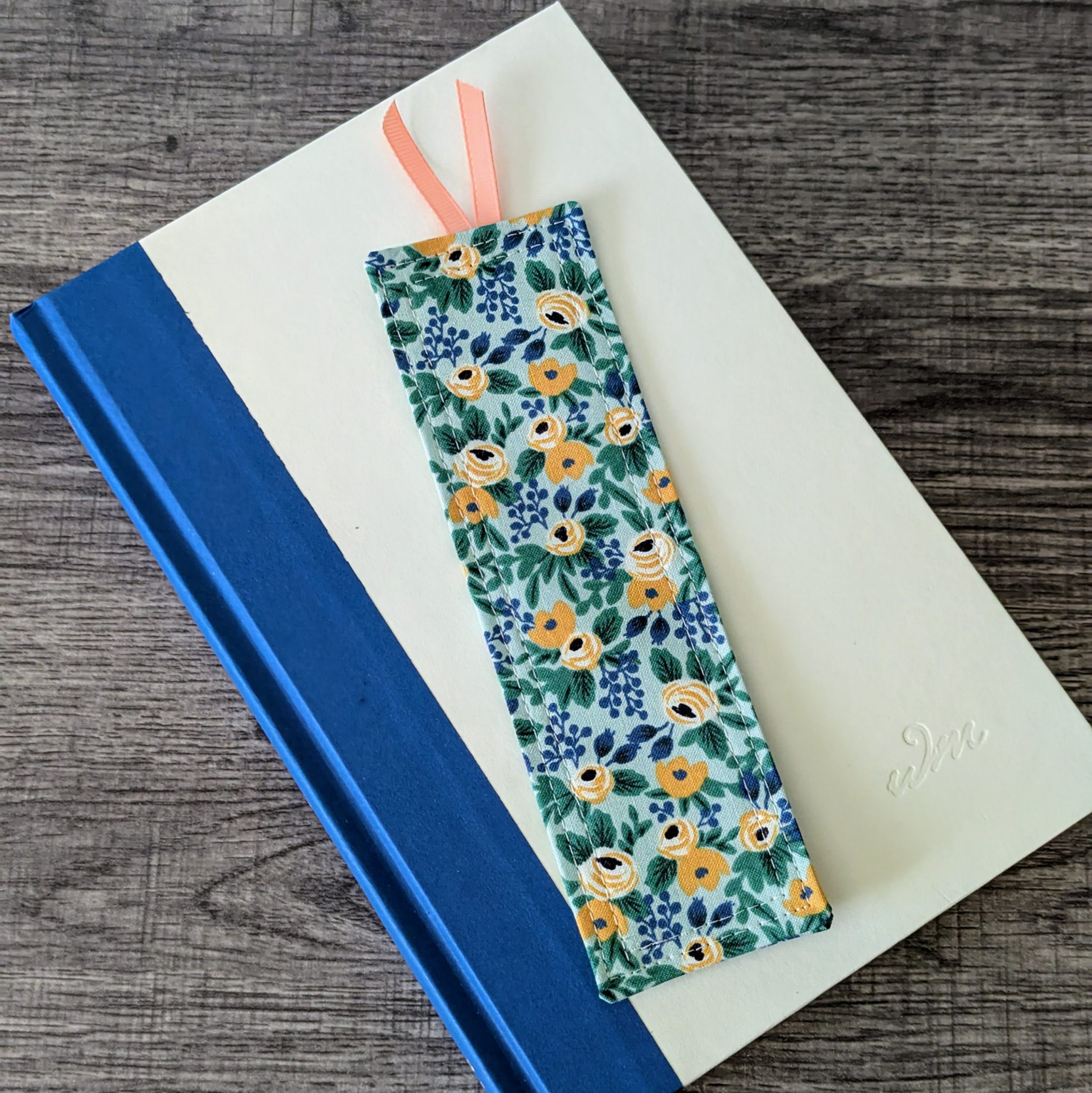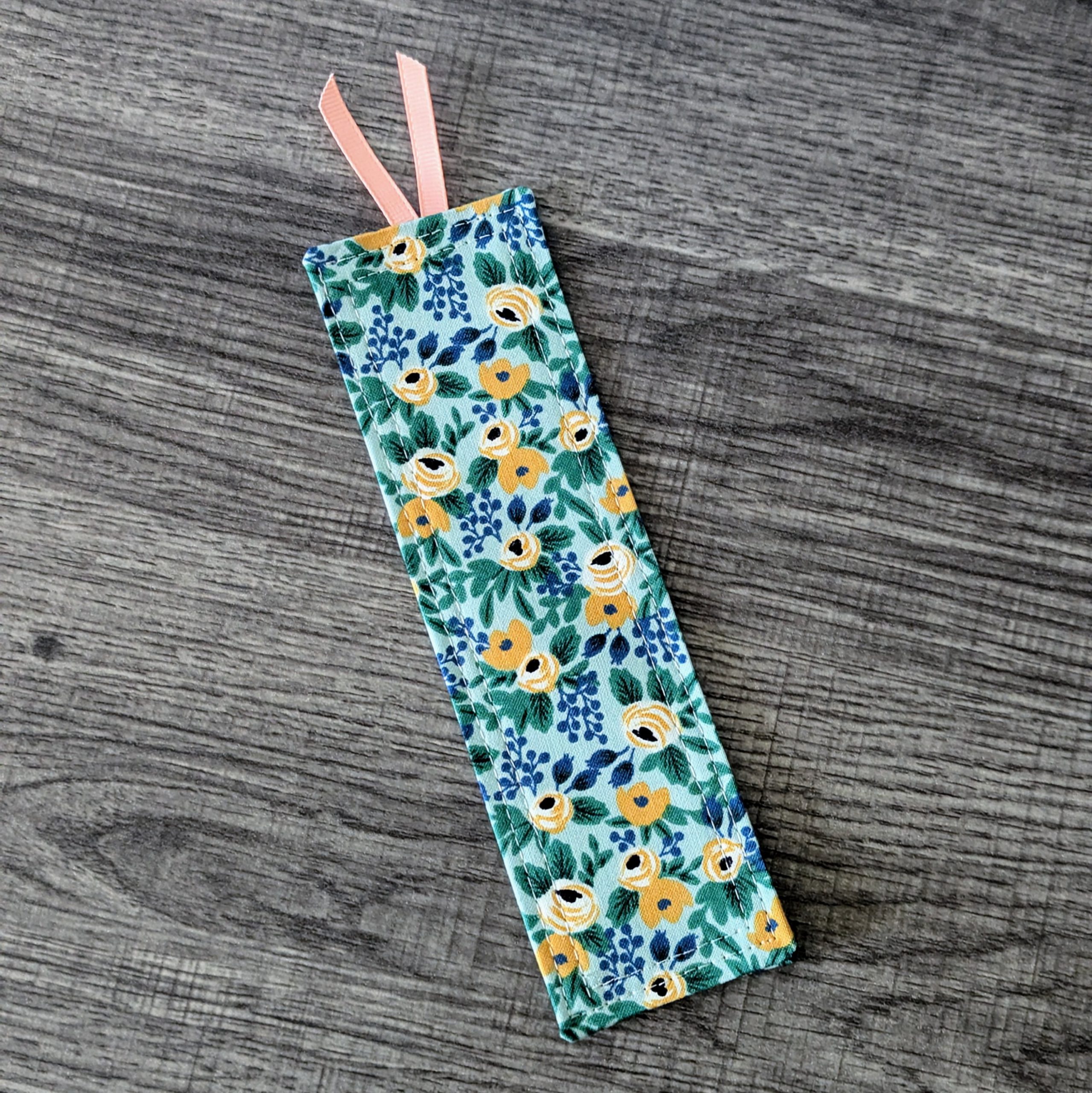 Hold your place in a book with this pretty floral bookmark. Featuring a peach flower print on mint green fabric, this bookmark is handcrafted with cotton fabric and a firm interfacing, and accented with a ribbon in a coordinating colour.