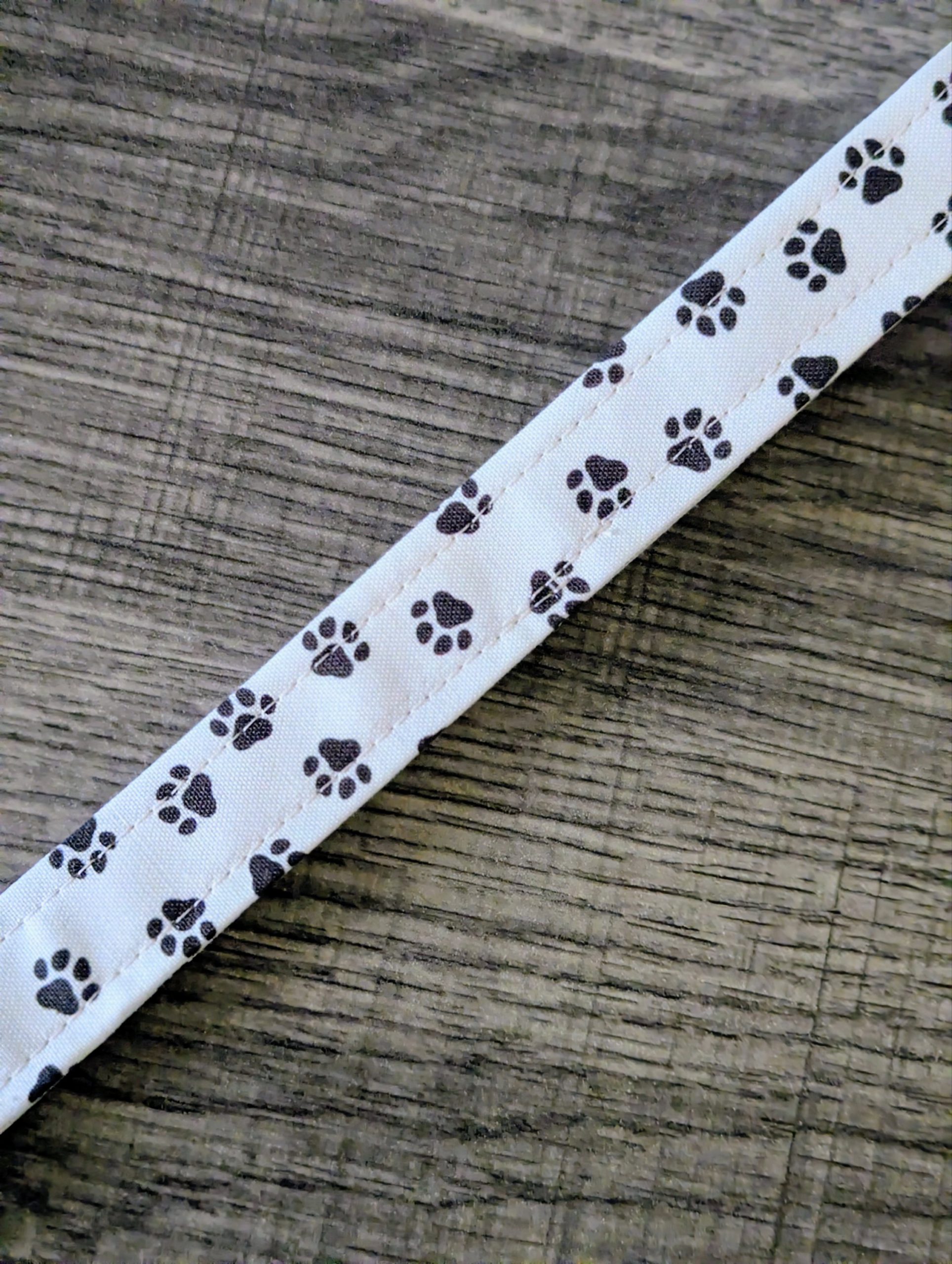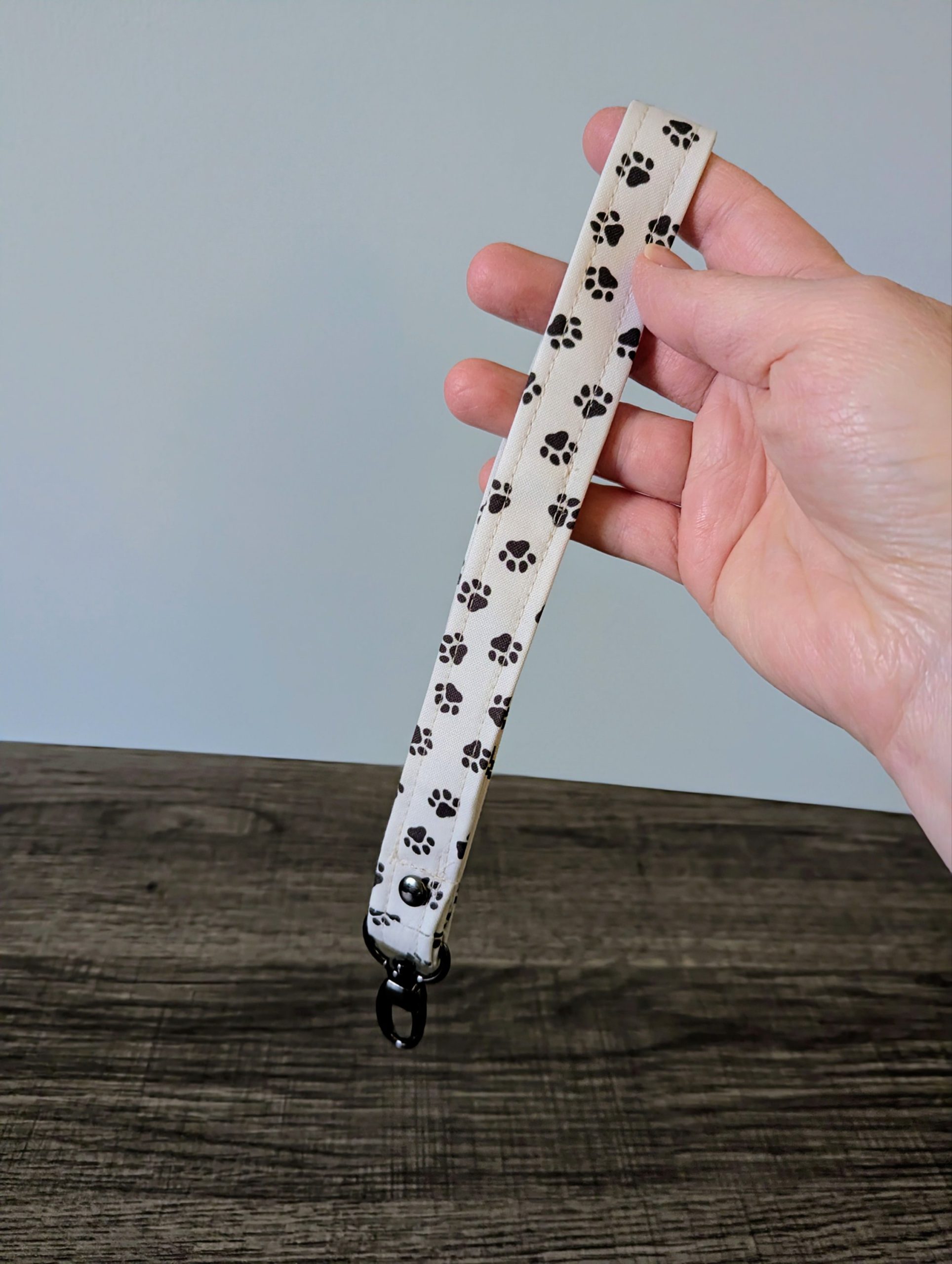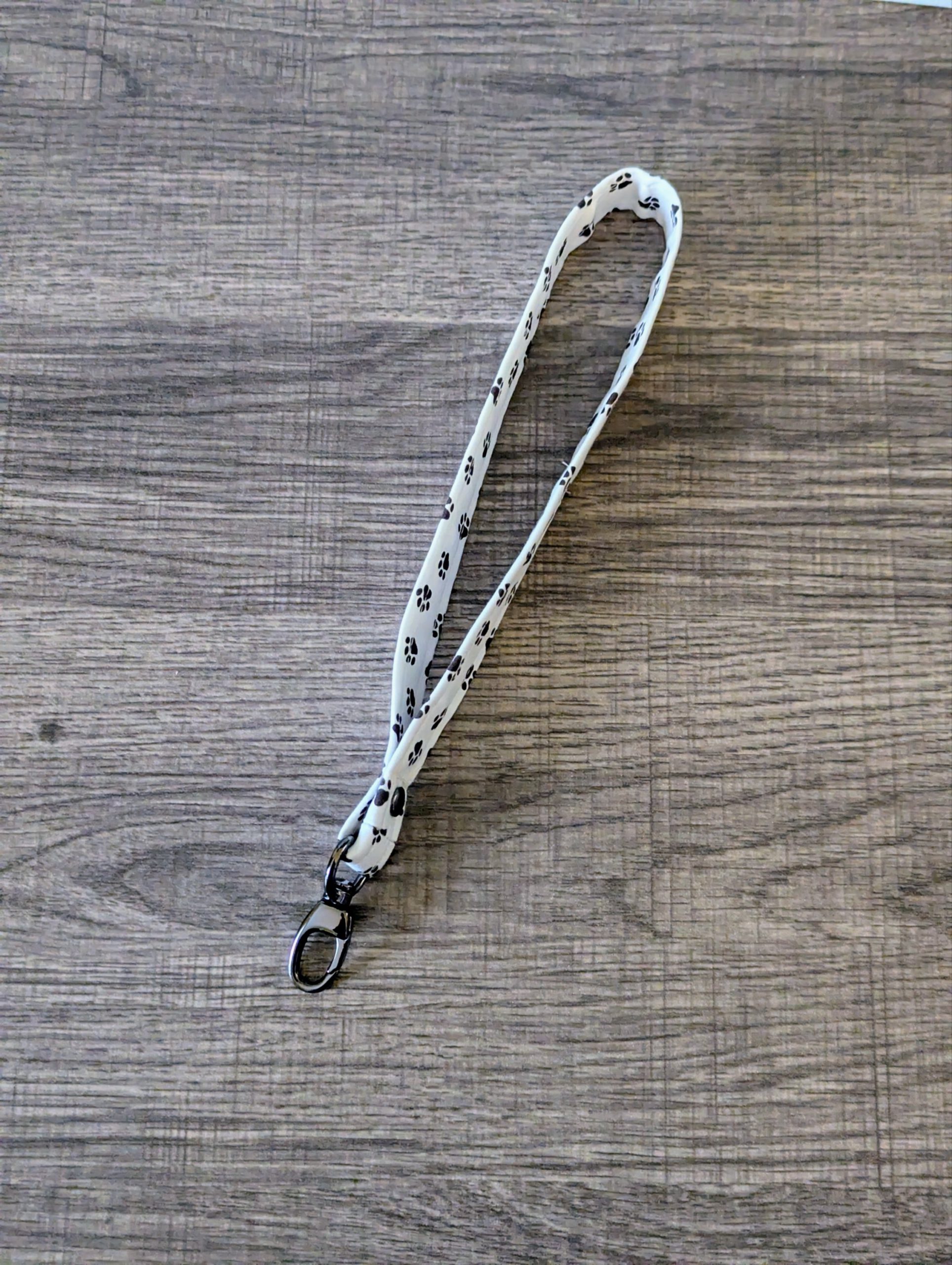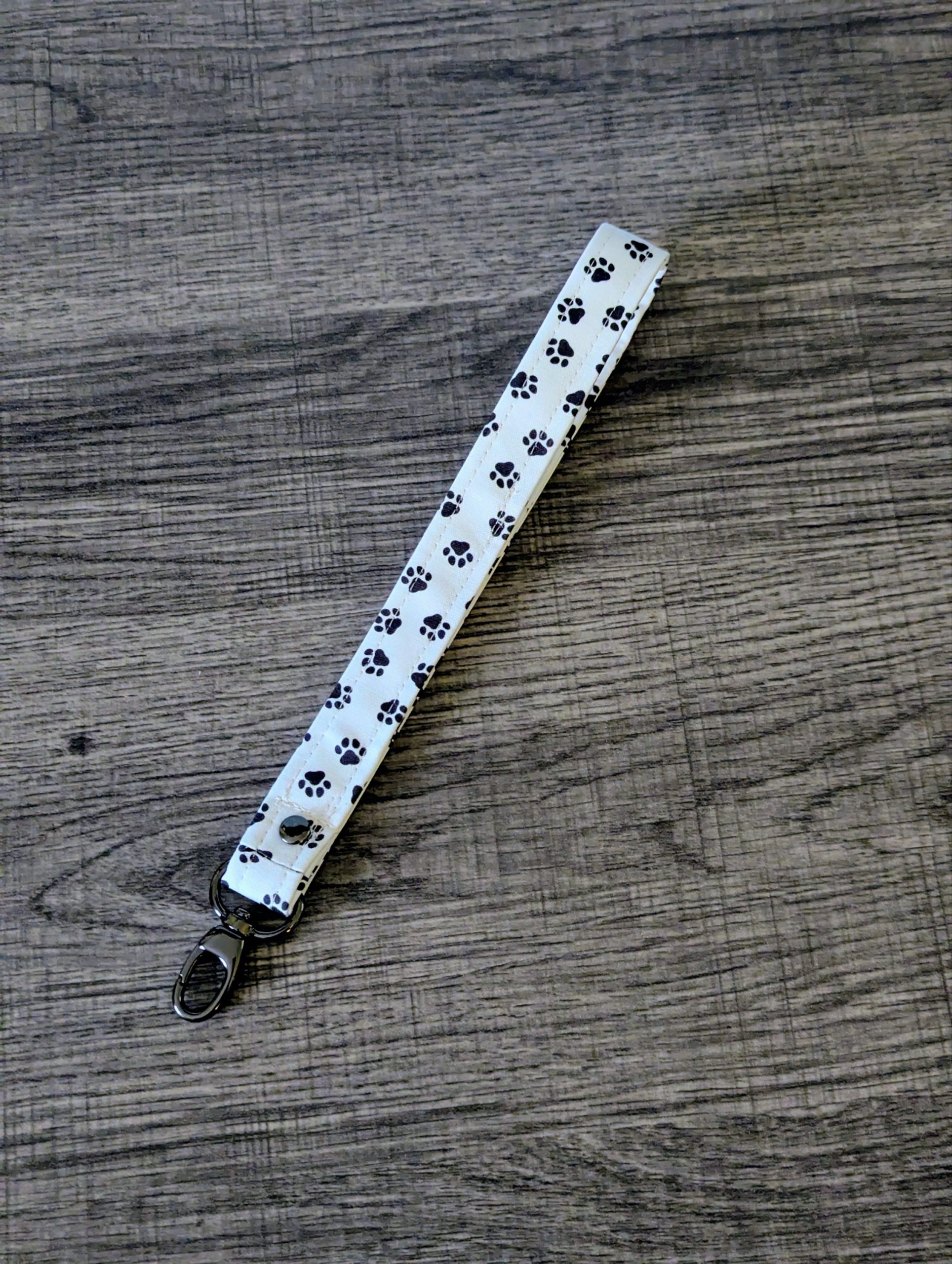 Keep your keys, fobs, or badge cards handy with this white cotton wristlet strap featuring a cat paw print print. These straps can also be used for any clutches or zipper pouches that have a tab on the outside.