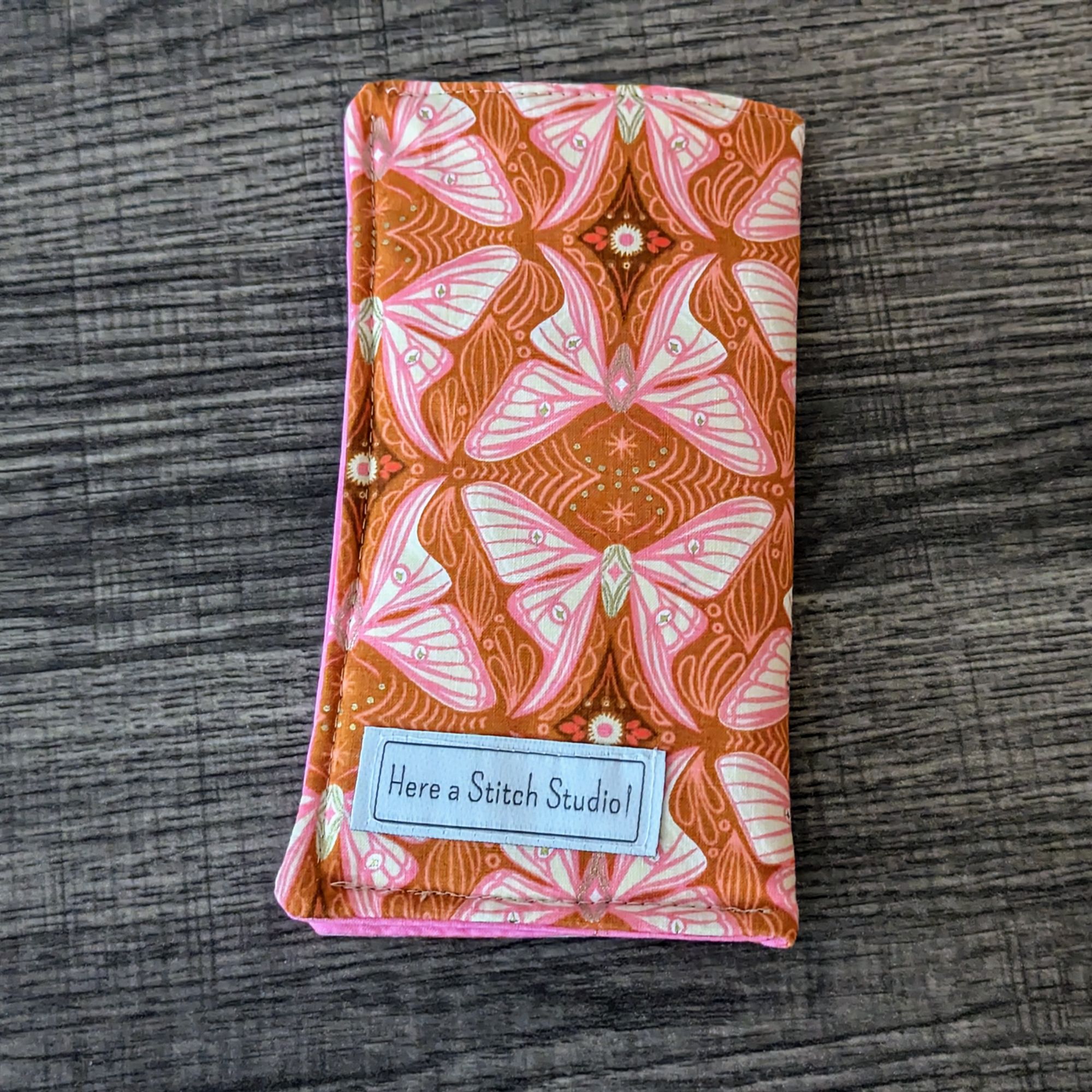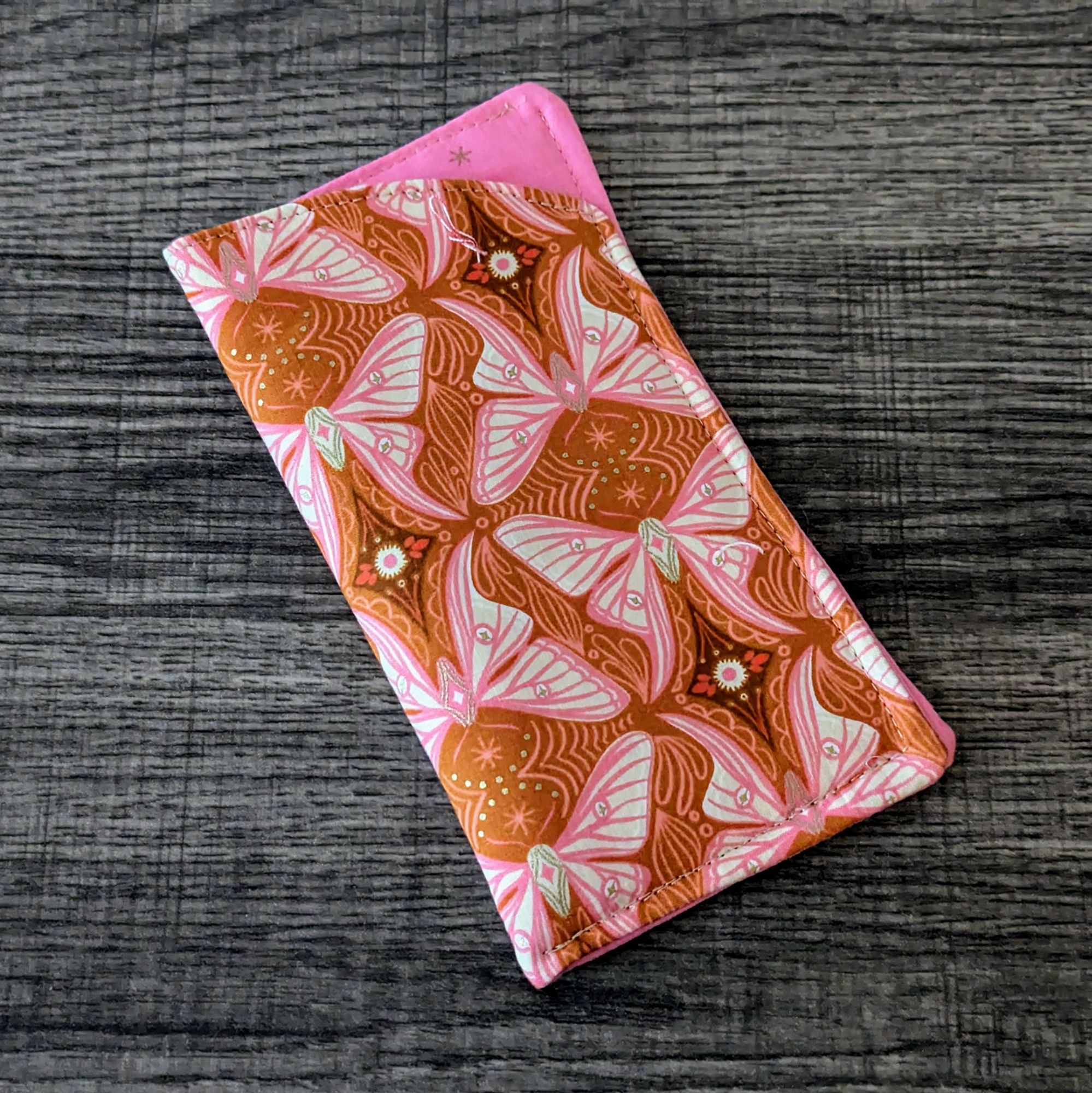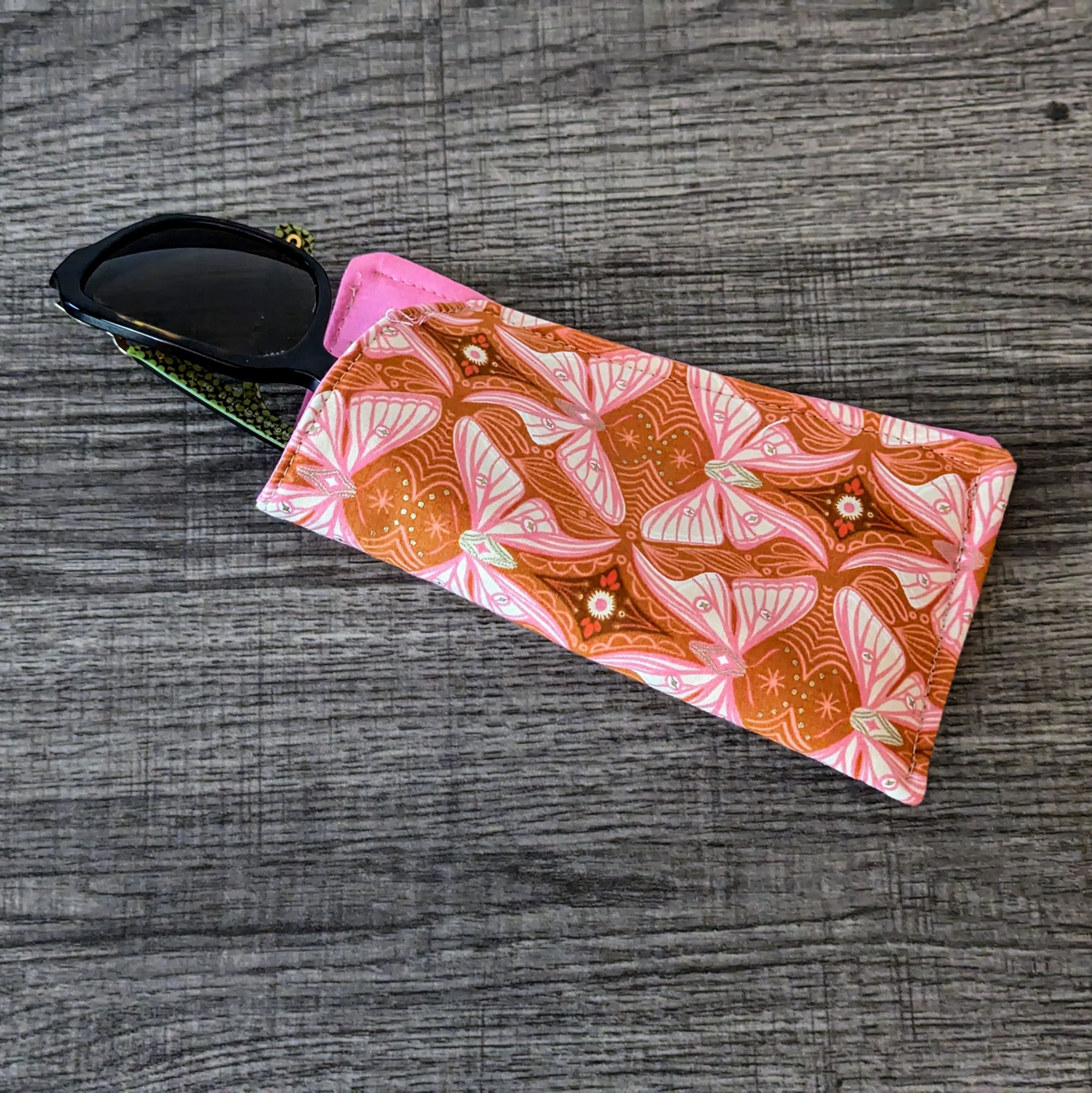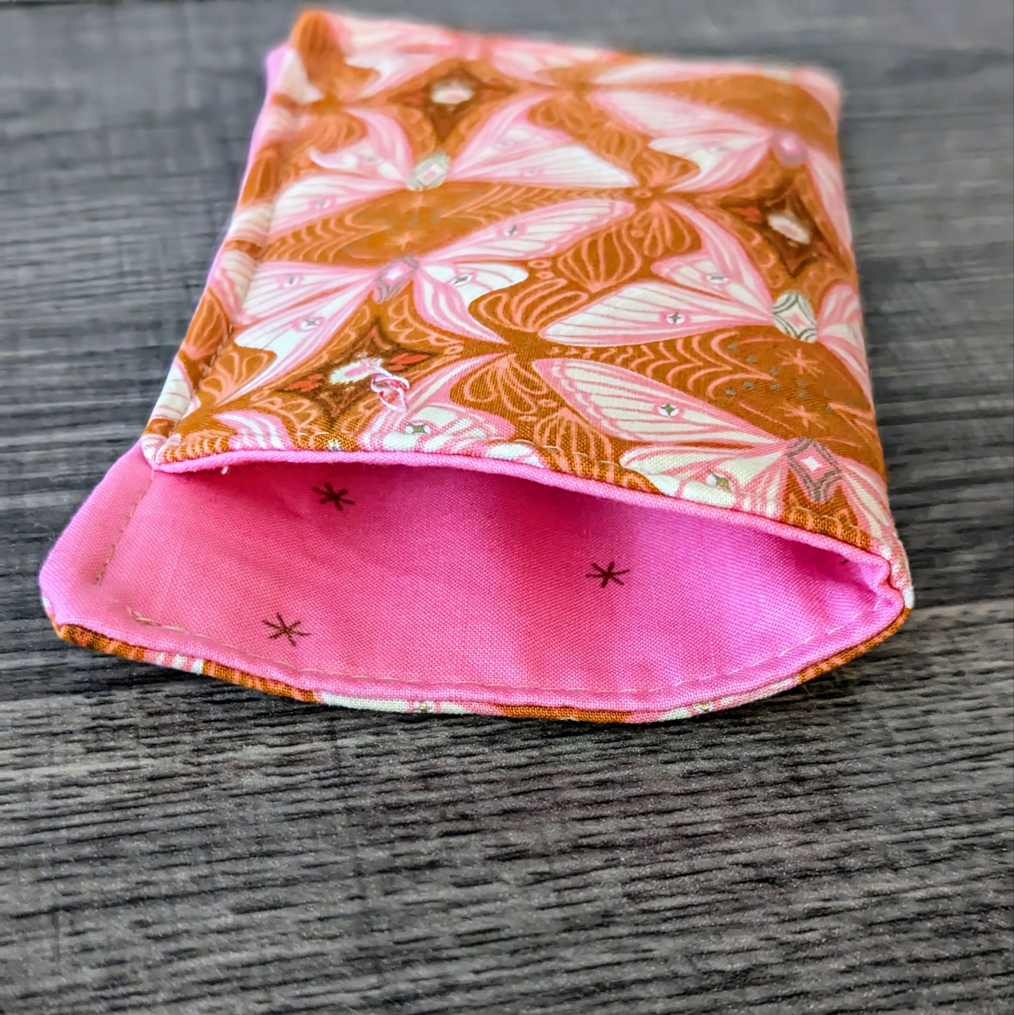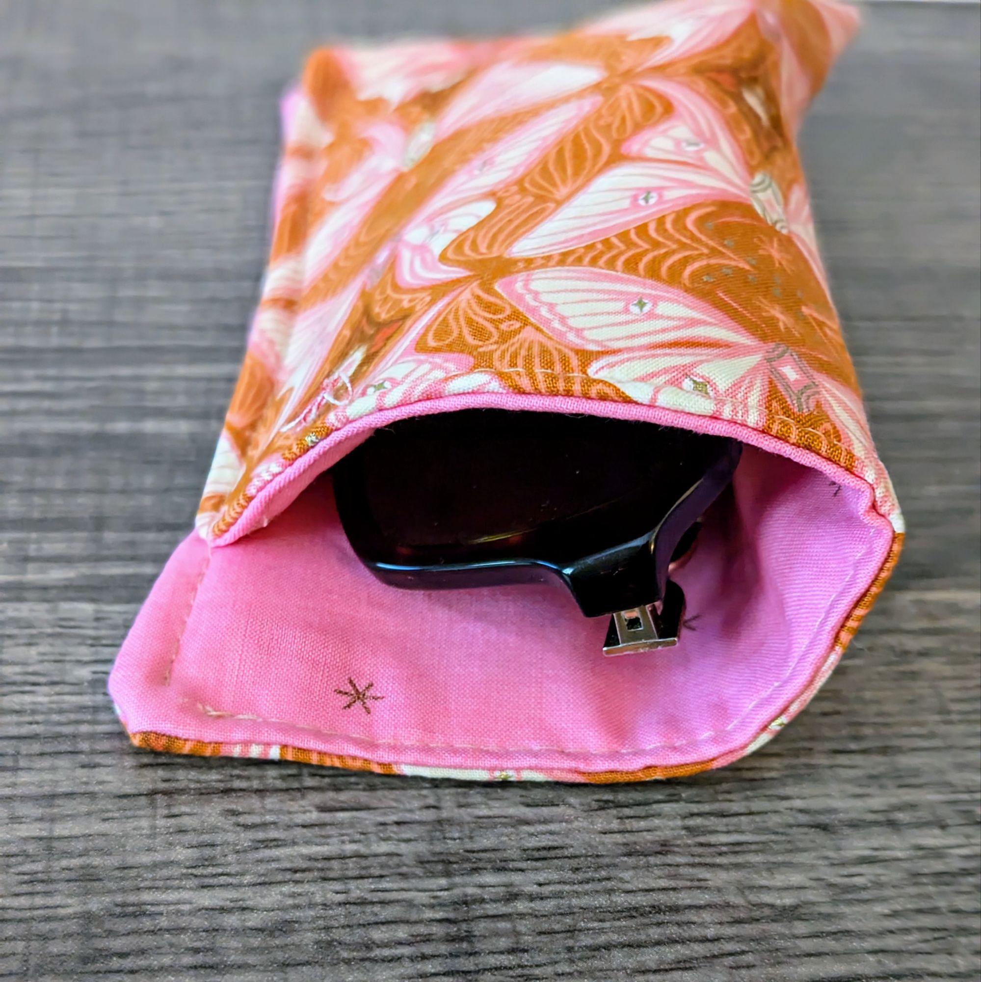 Keep your glasses safe, and add a little style with this padded eyeglass pouch. The exterior is a pink cotton featuring a butterfly print. The interior is a pink cotton featuring a small star print.
