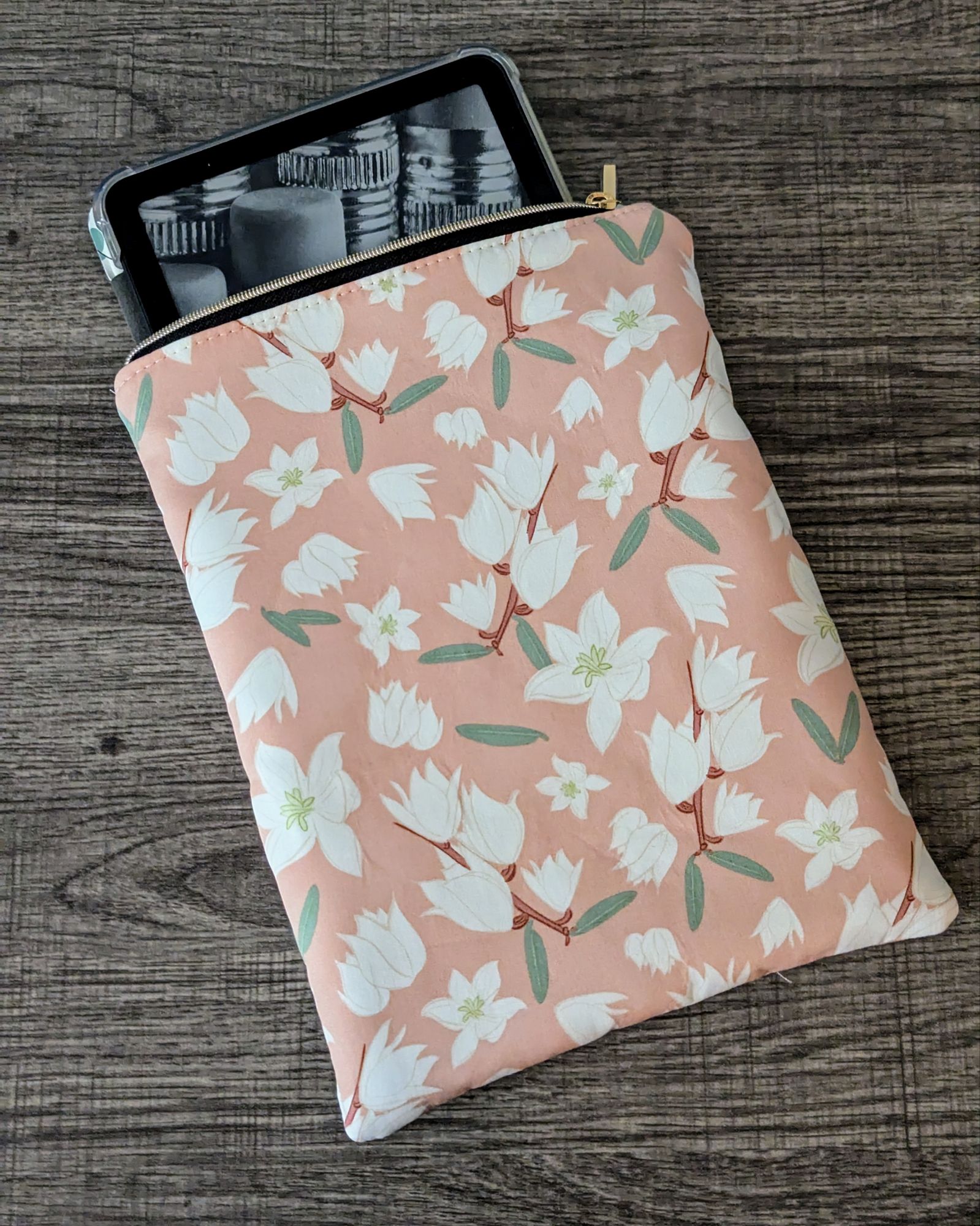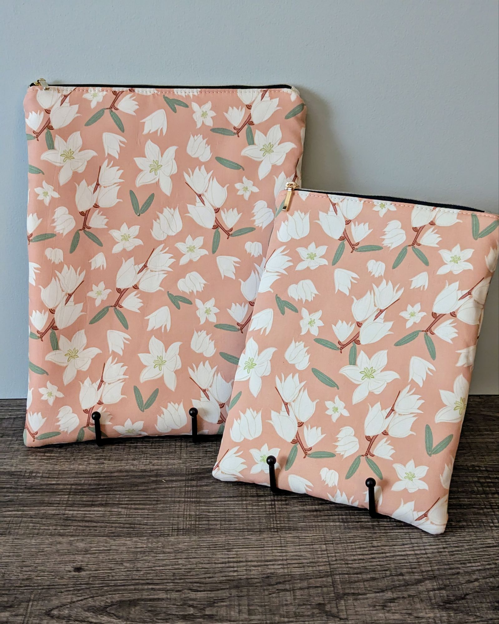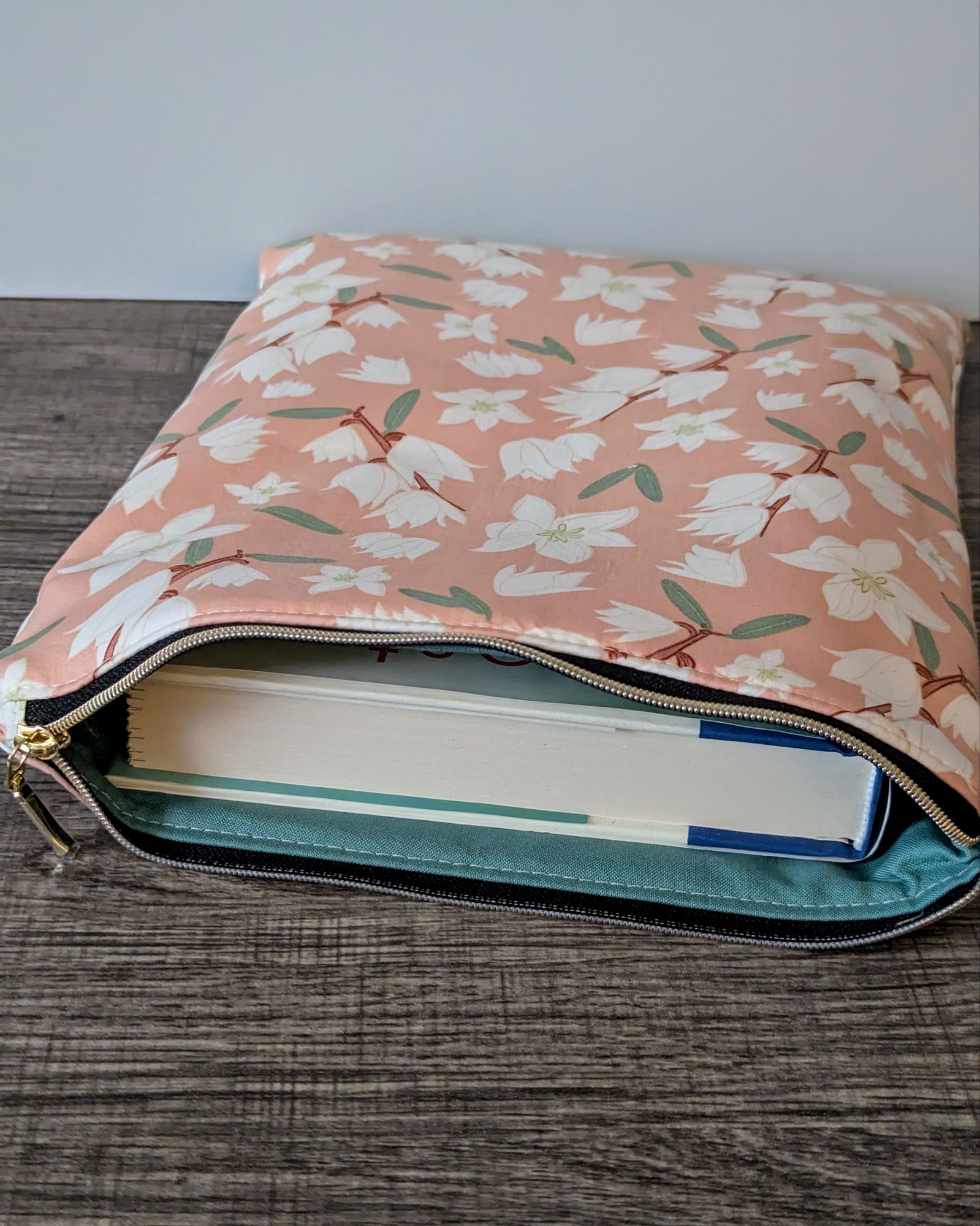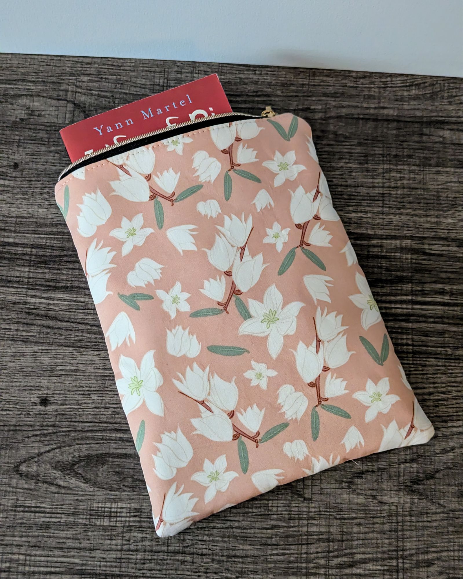 Protect your book, e-reader or tablet with this fabric book sleeve. These sleeves feature a white floral print on pink cotton and have a green cotton lining. The small book sleeve fits smaller paper backs, as well as some e-readers and tablets. The larger book sleeve fits some larger paper backs and hardcover books, as well as e-readers and tablets. Approximate size of book sleeves are below to check if they will fit your book or device.