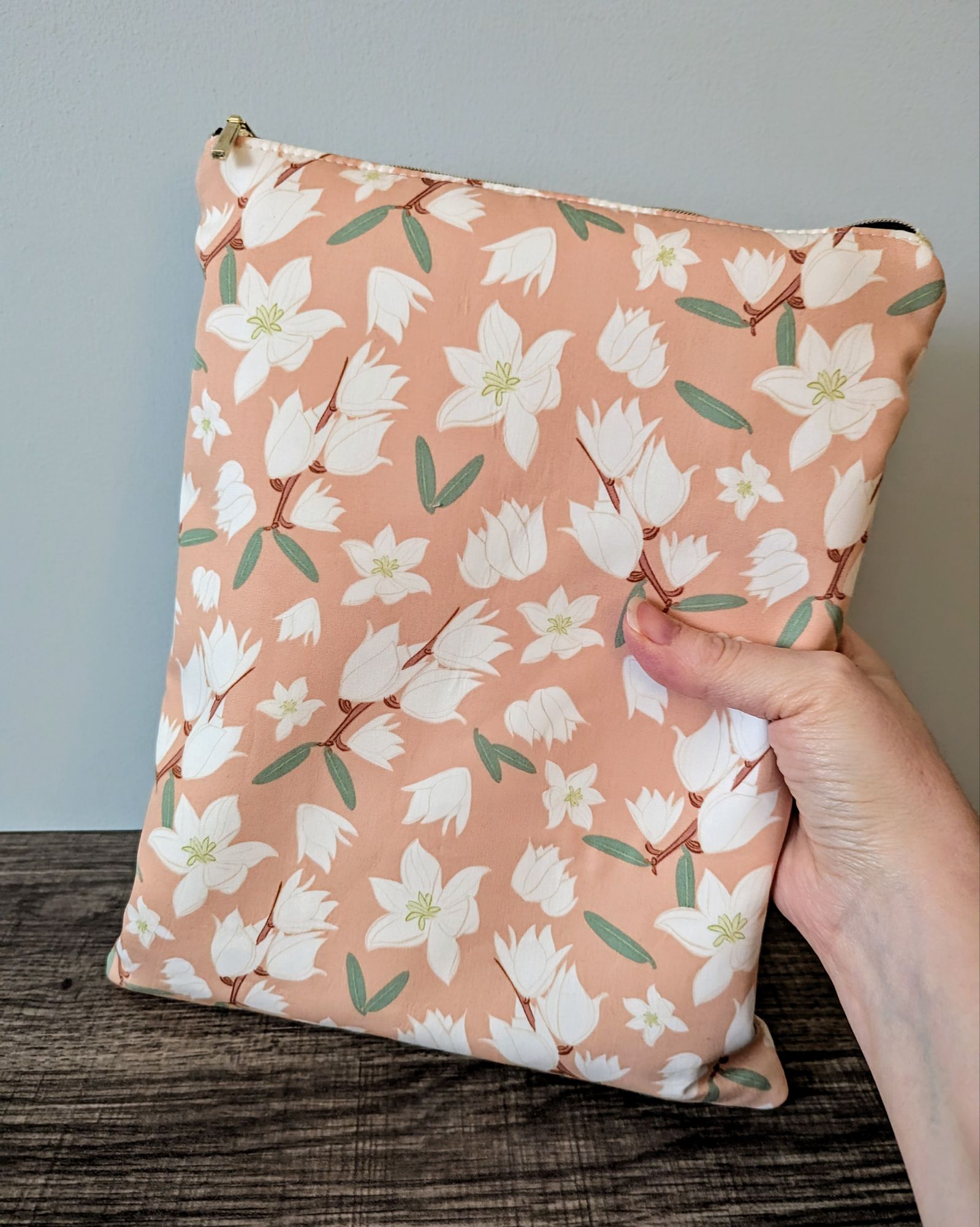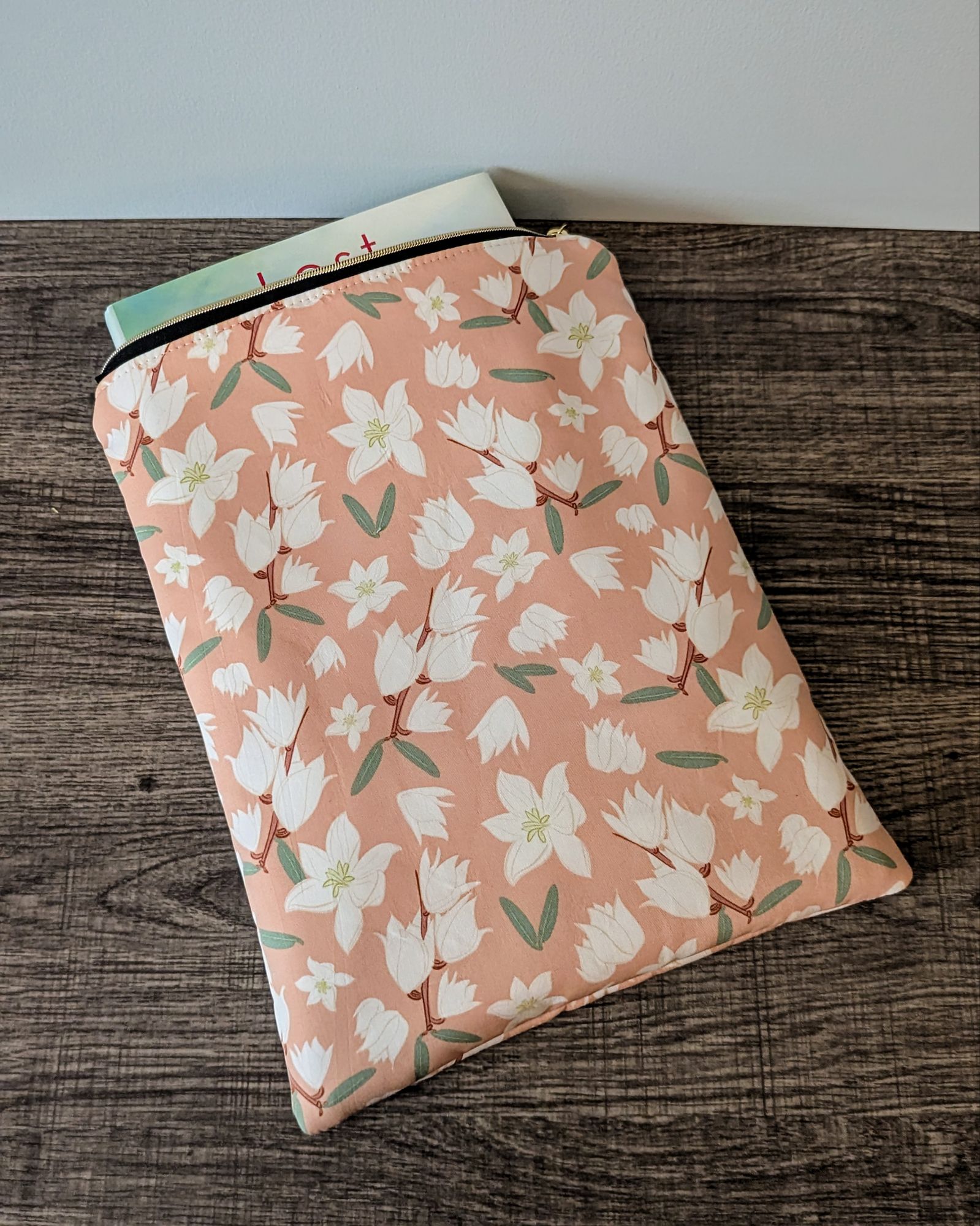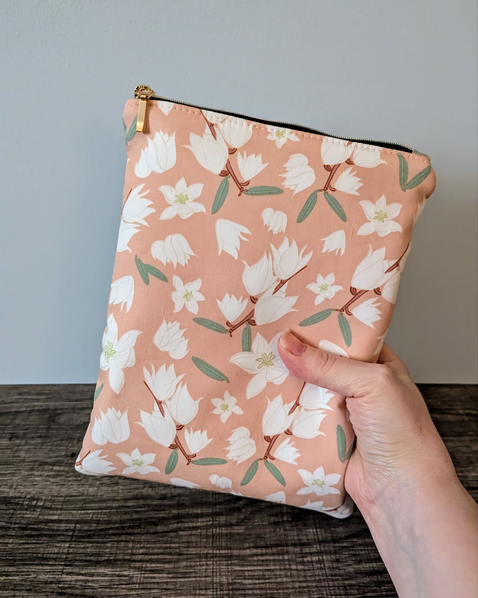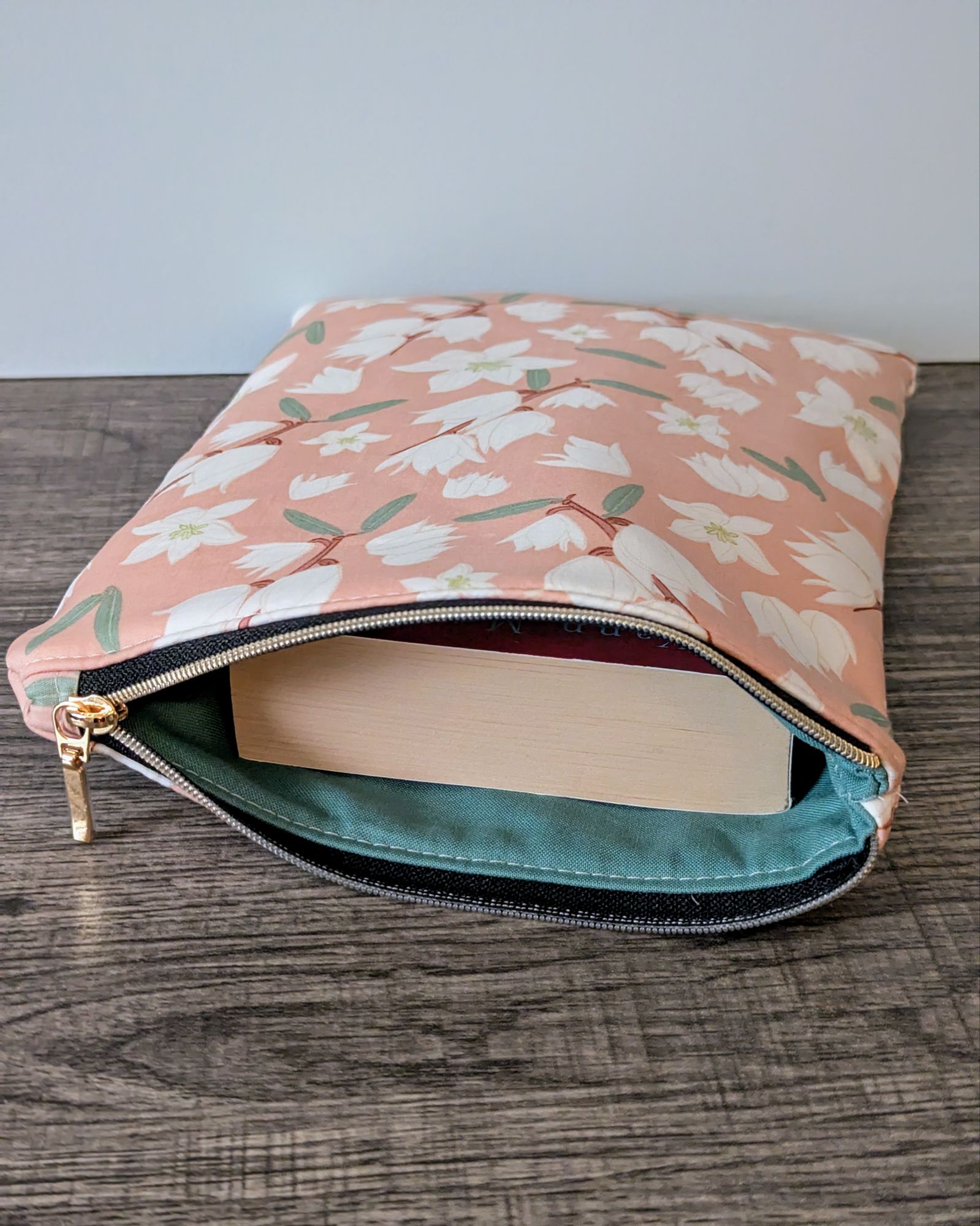 Protect your book, e-reader or tablet with this fabric book sleeve. These sleeves feature a white floral print on pink cotton and have a green cotton lining. The small book sleeve fits smaller paper backs, as well as some e-readers and tablets. The larger book sleeve fits some larger paper backs and hardcover books, as well as e-readers and tablets. Approximate size of book sleeves are below to check if they will fit your book or device.