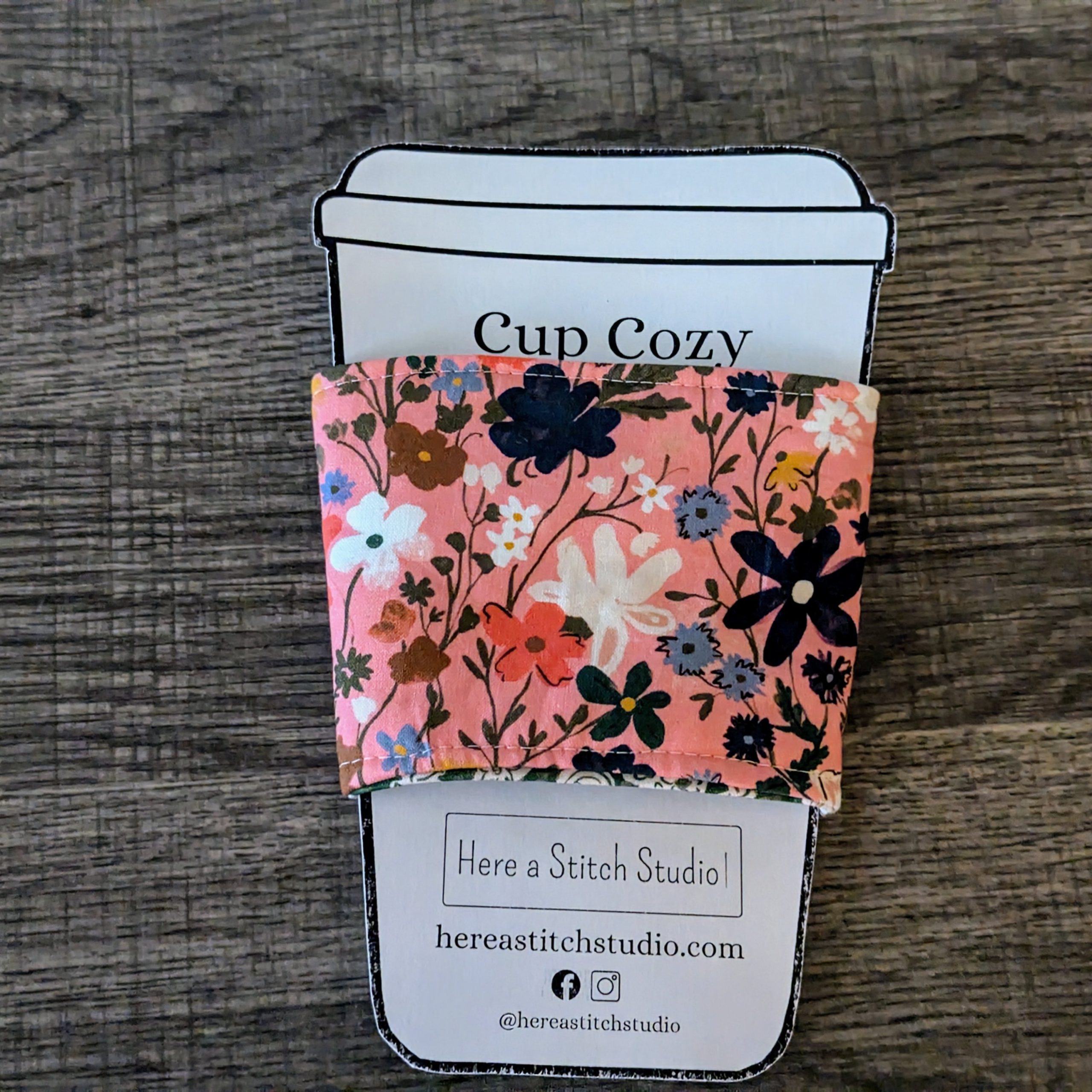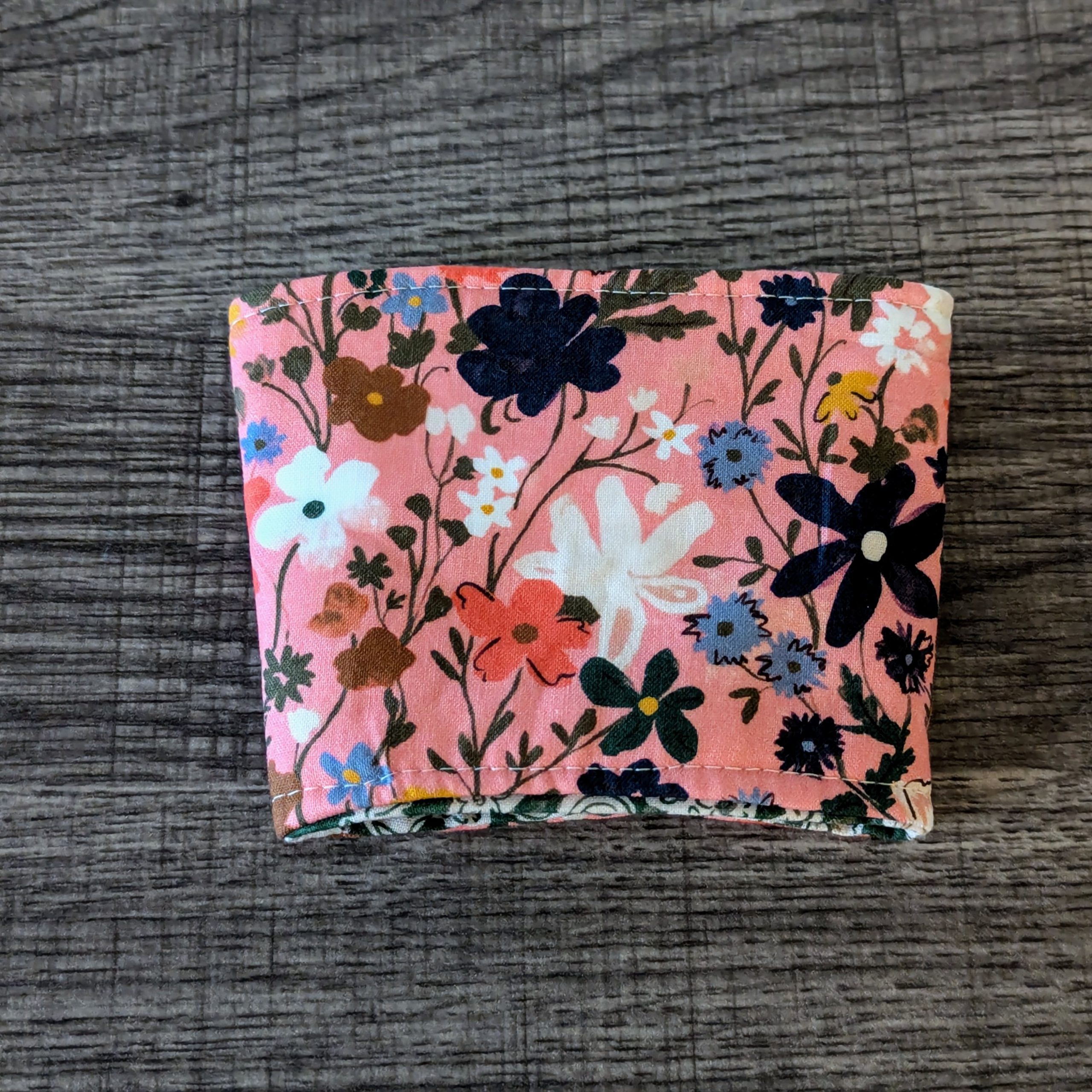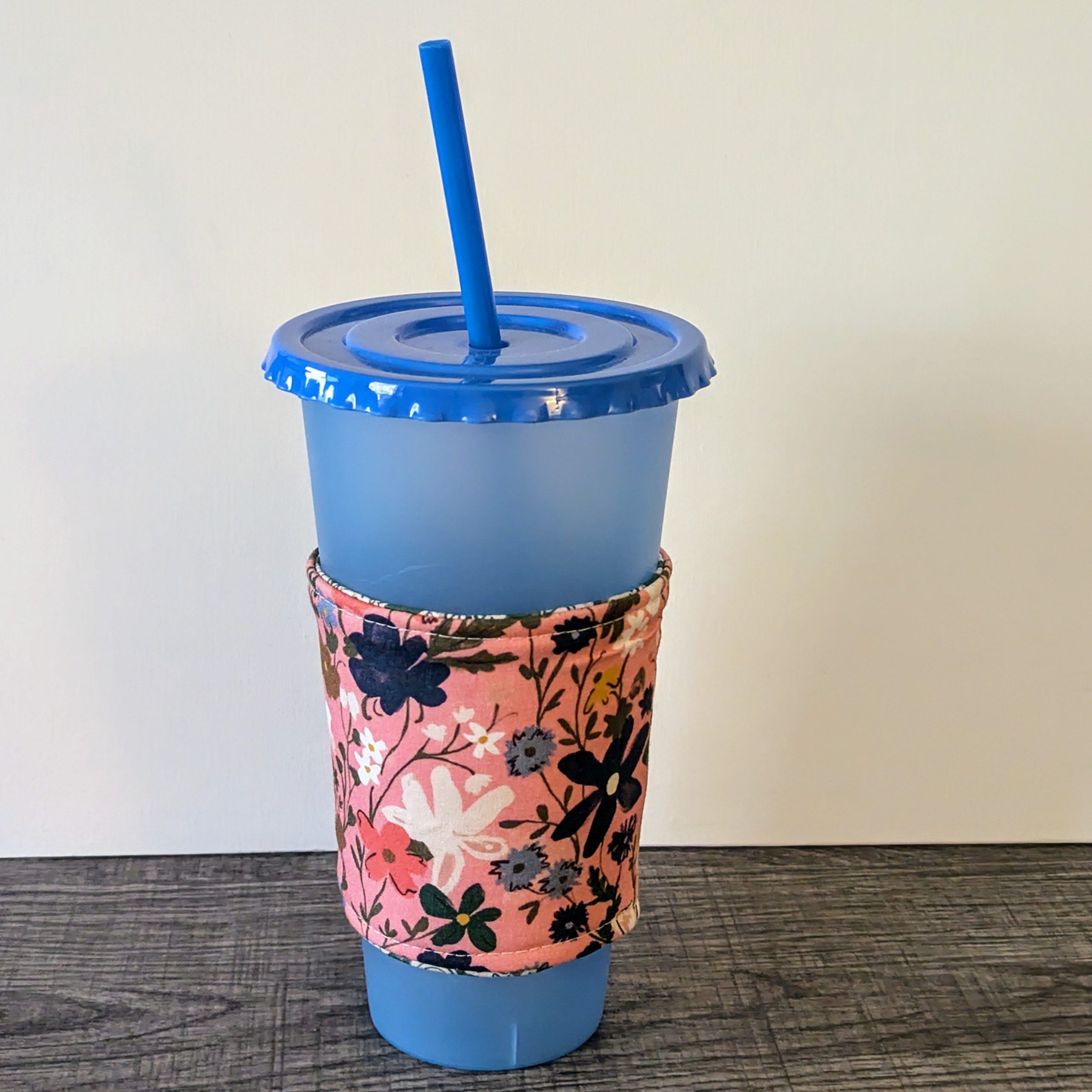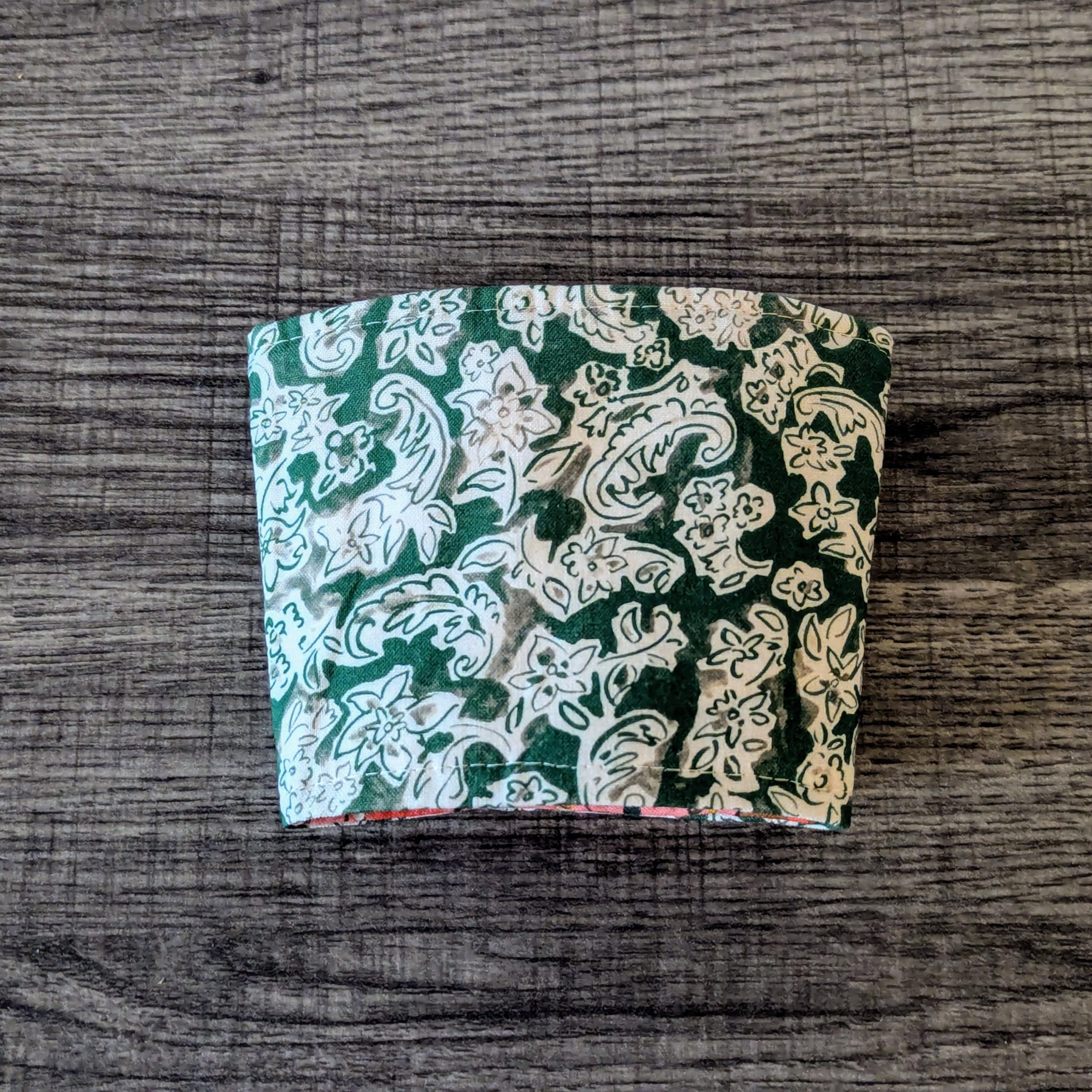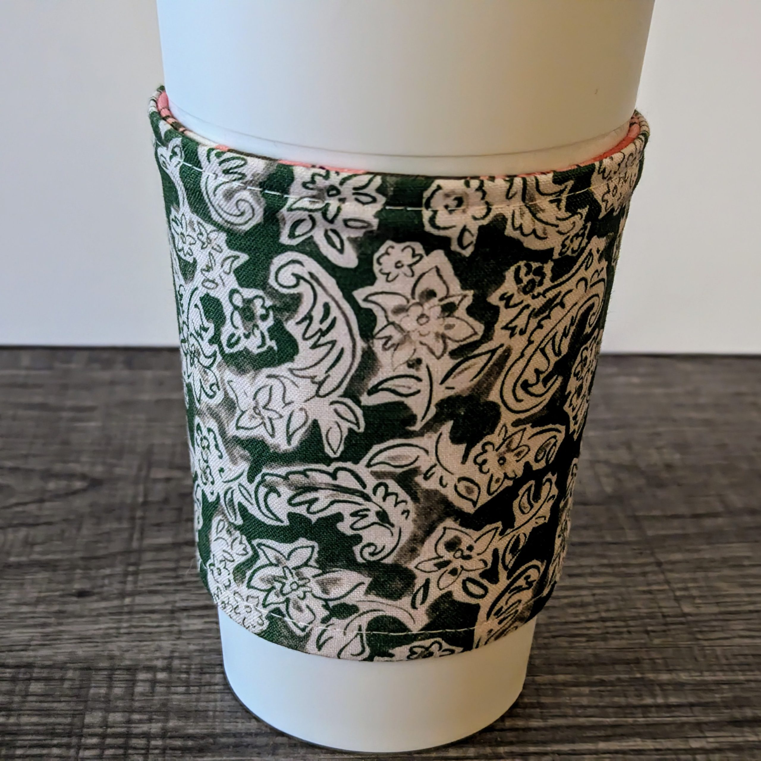 Keep your hands protected from both hot and cold drinks, and add some style to your on the go cup with this reversible cup cozy. One side features a floral print on pink fabric, while the other side features a chintz print on green fabric.