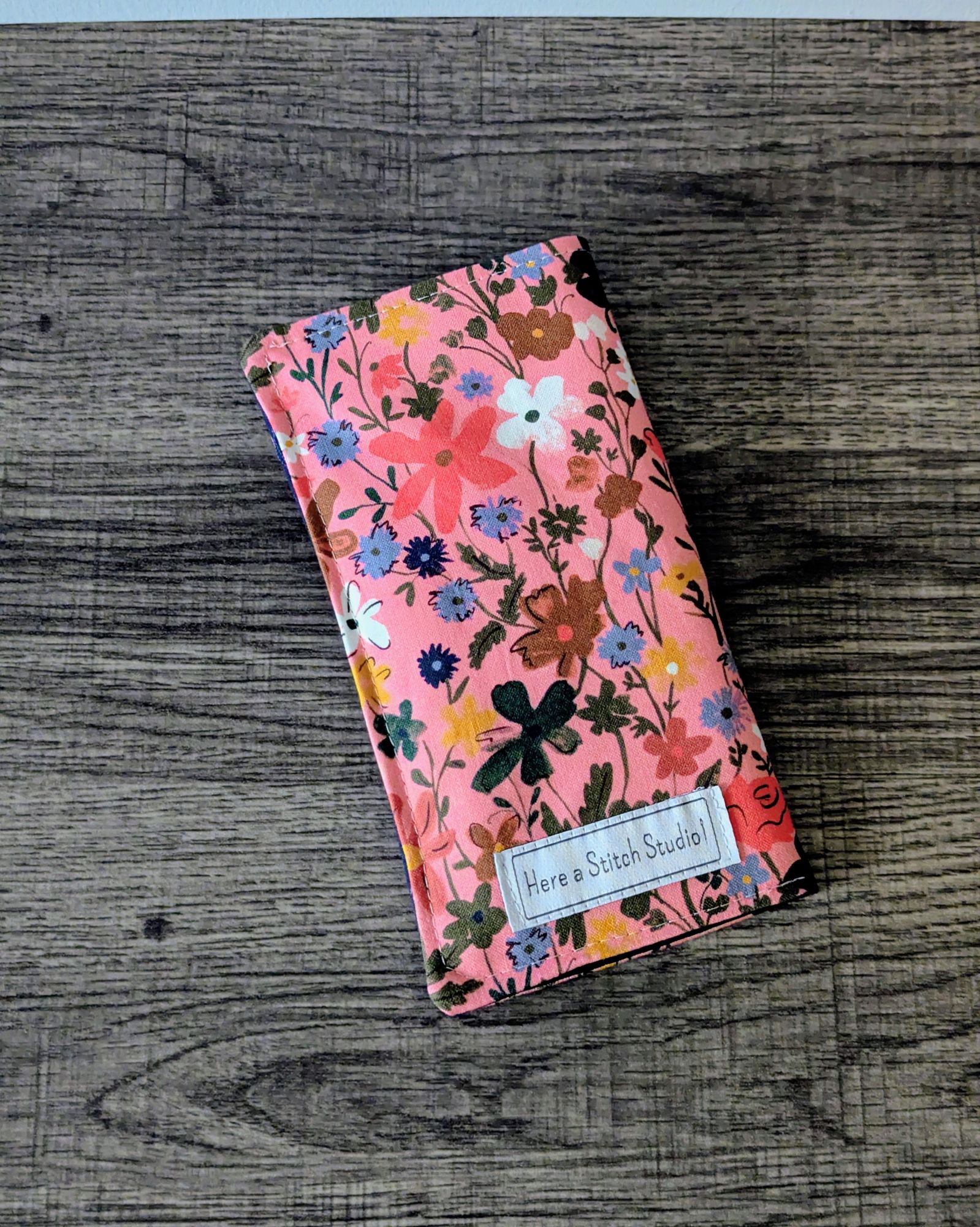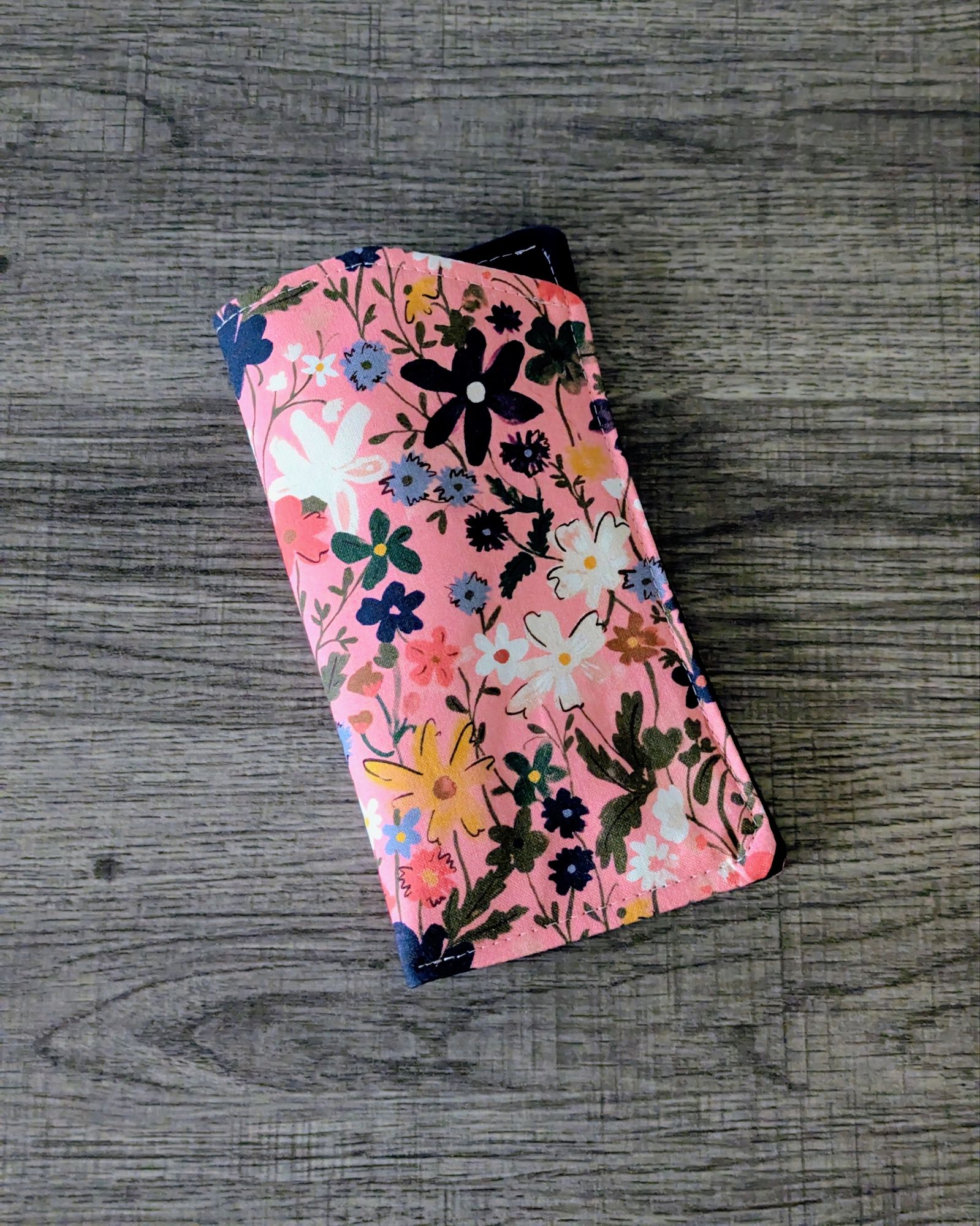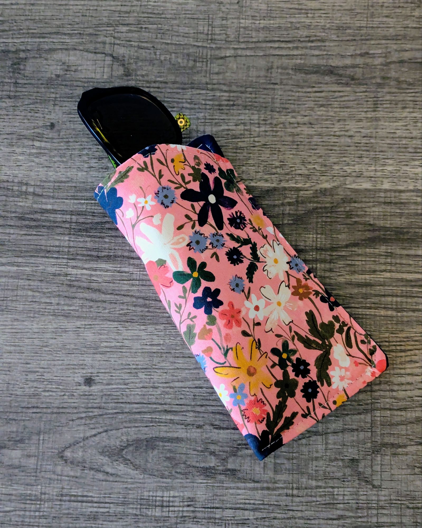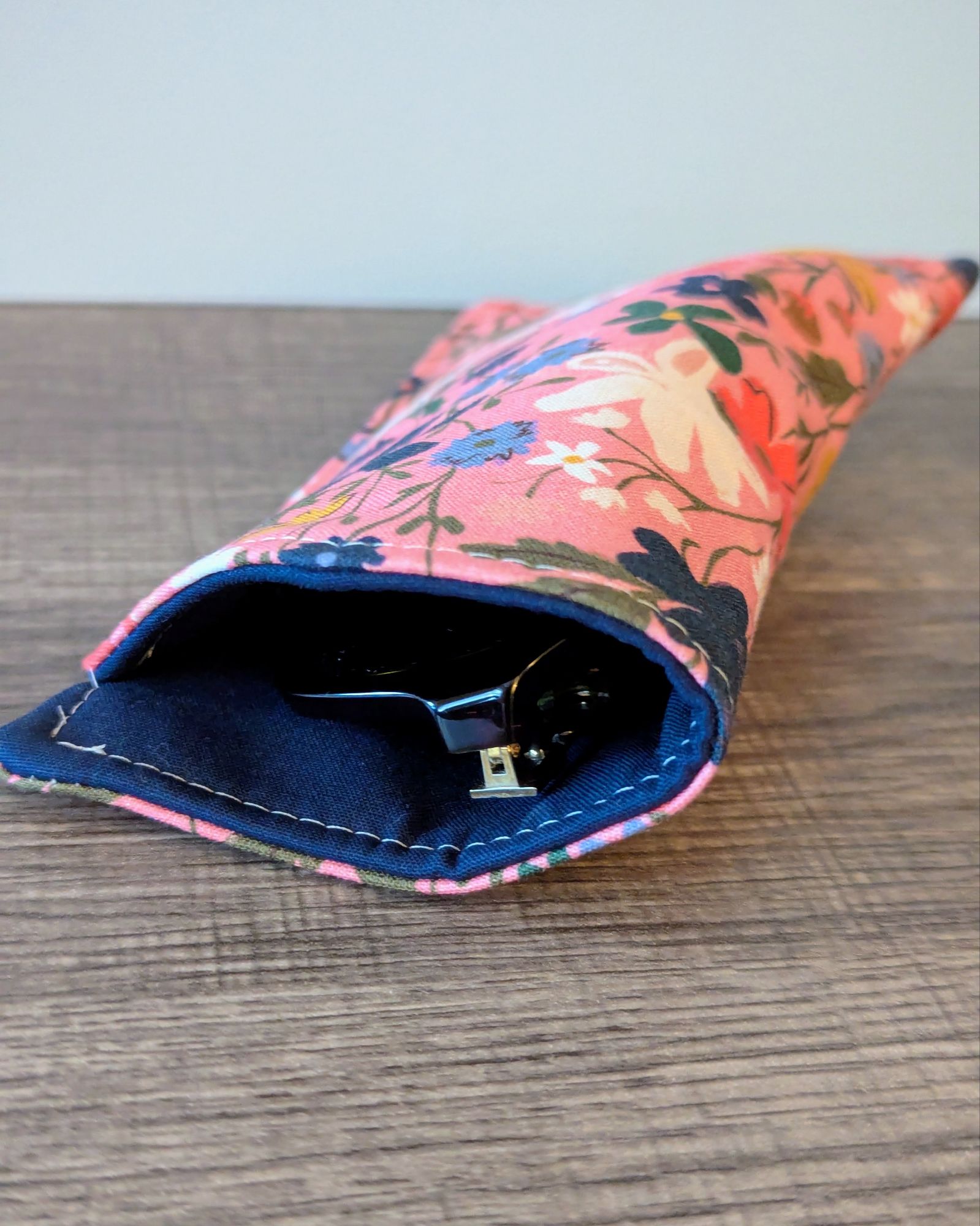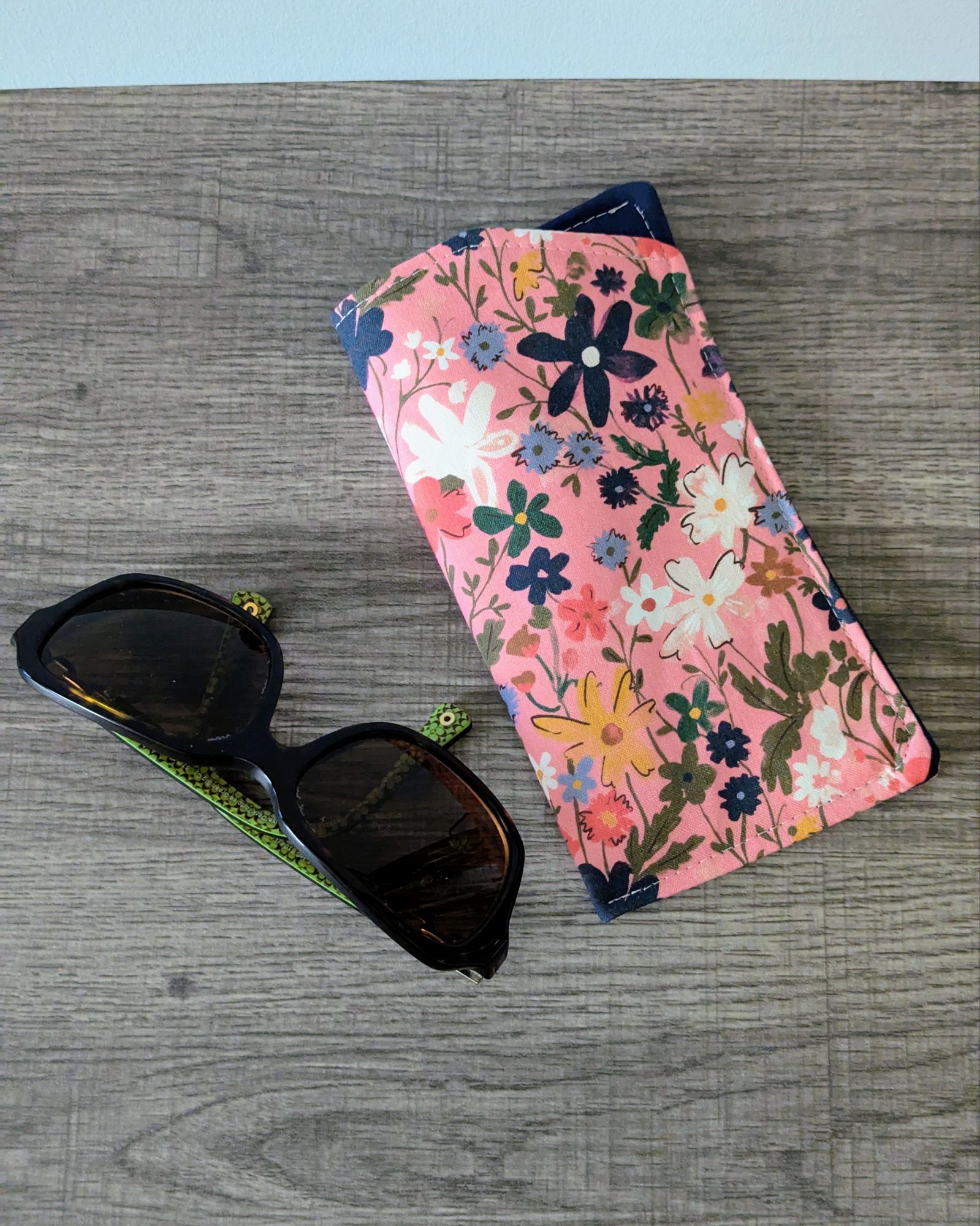 Keep your glasses safe, and add a little style with this padded eyeglass pouch. The exterior is a cotton featuring a wildflower floral print on pink. The interior is a navy blue cotton.