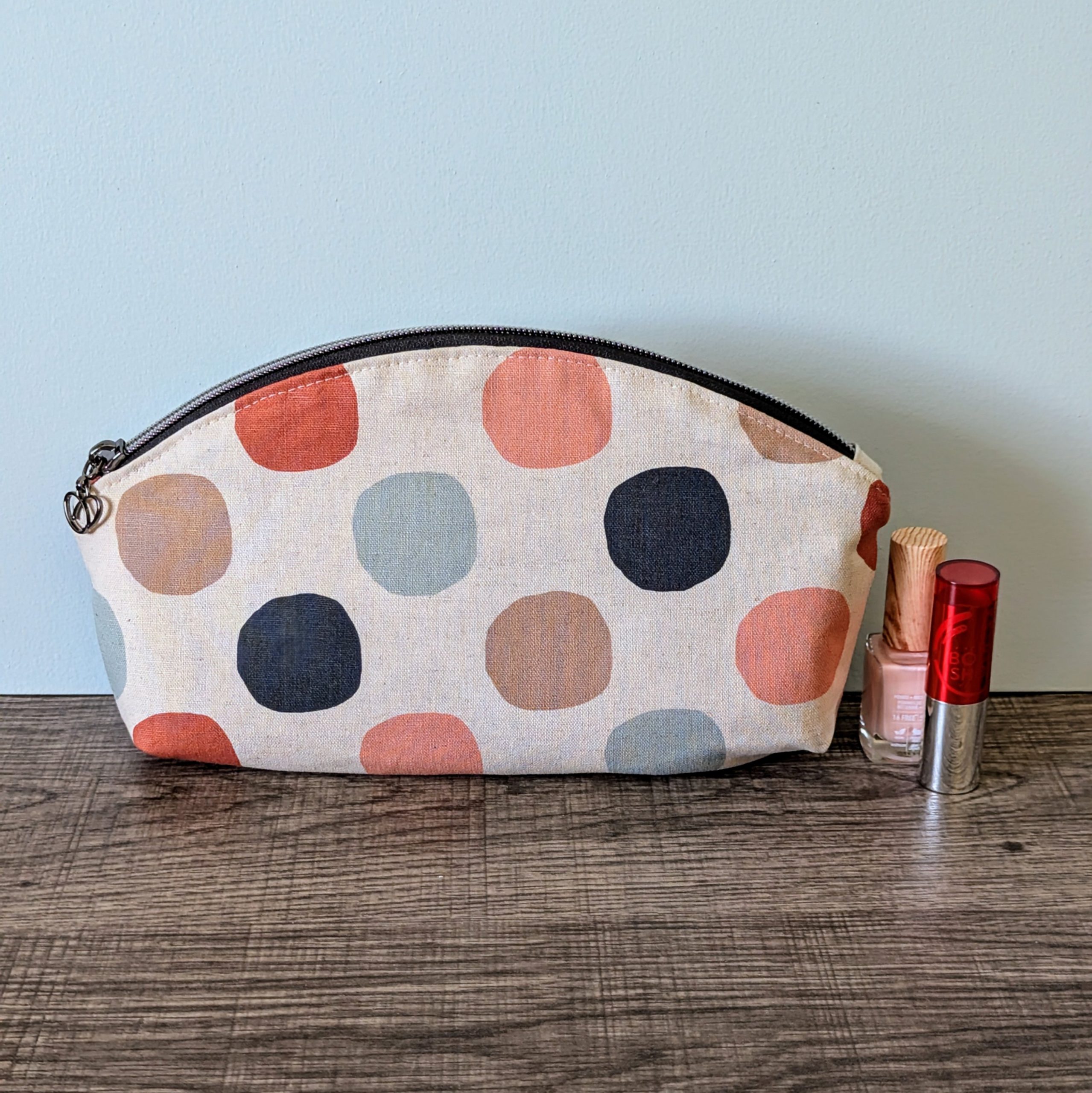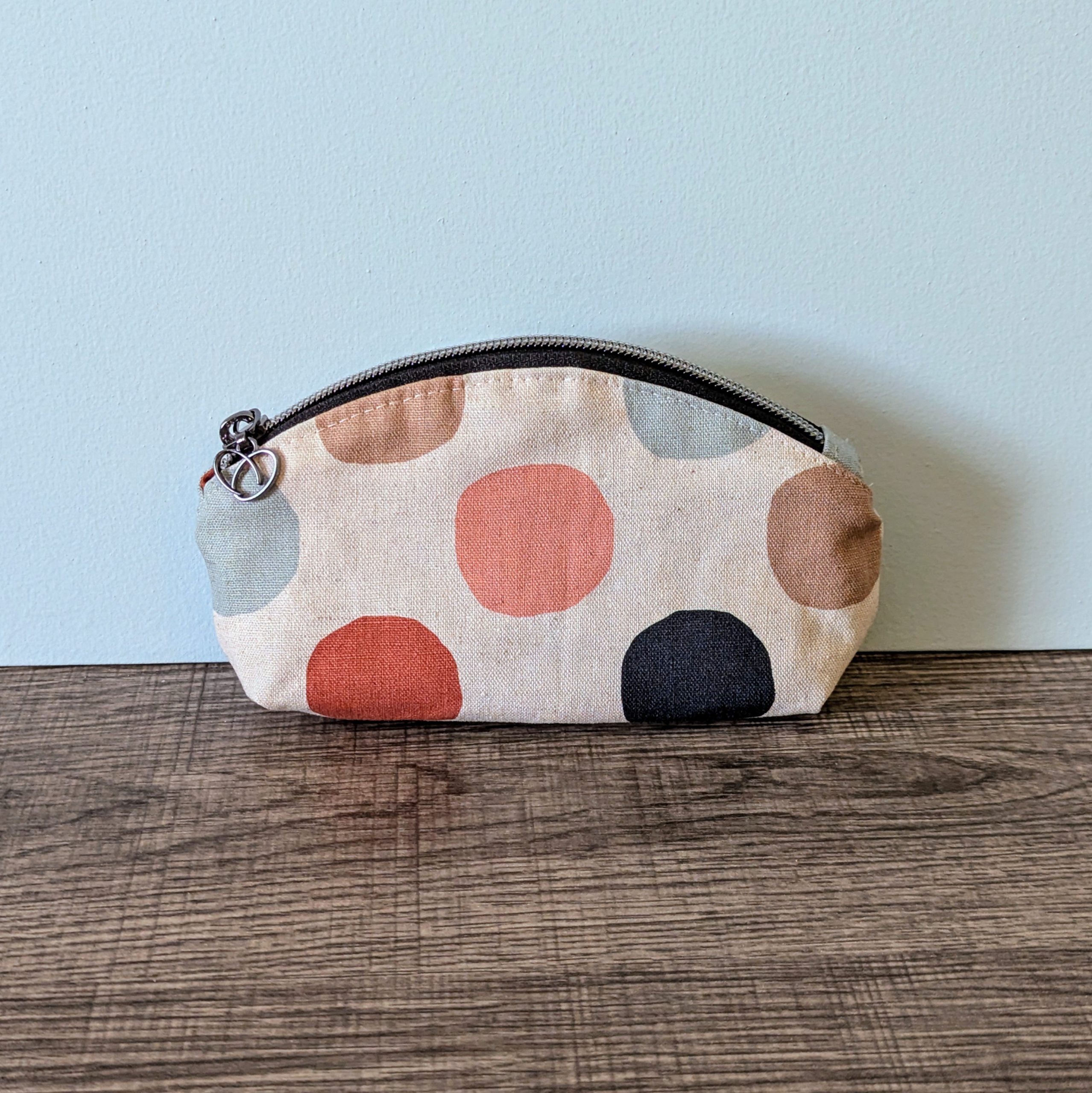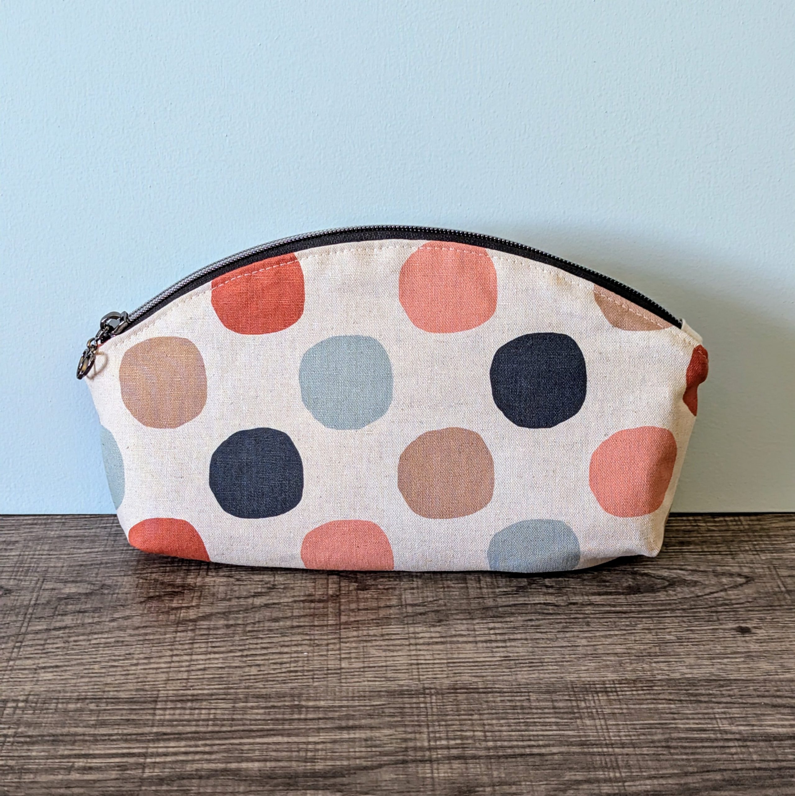 This polka dot cotton linen canvas zipper pouch makes the perfect toiletry and cosmetic bag. Great toiletry bag to use when travelling. This cosmetic bag comes in two sizes, large and small, to accommodate your personal care storage needs. This pouch is also makes a great notions bag or pencil case. Features a zipper in a gunmetal finish with a heart shaped zipper pull.