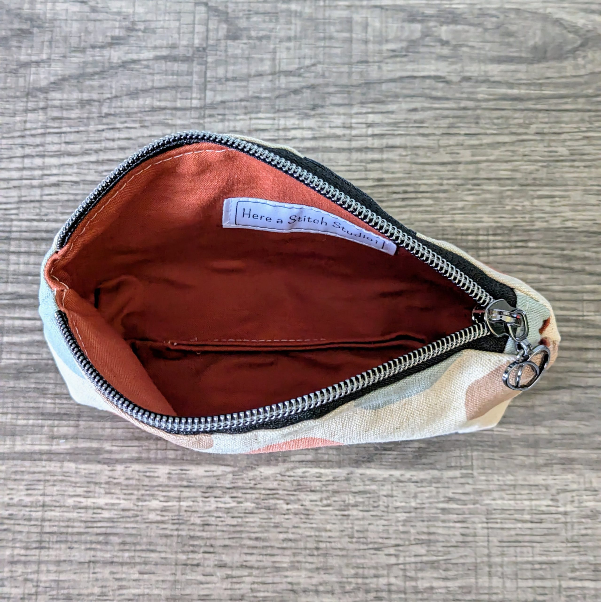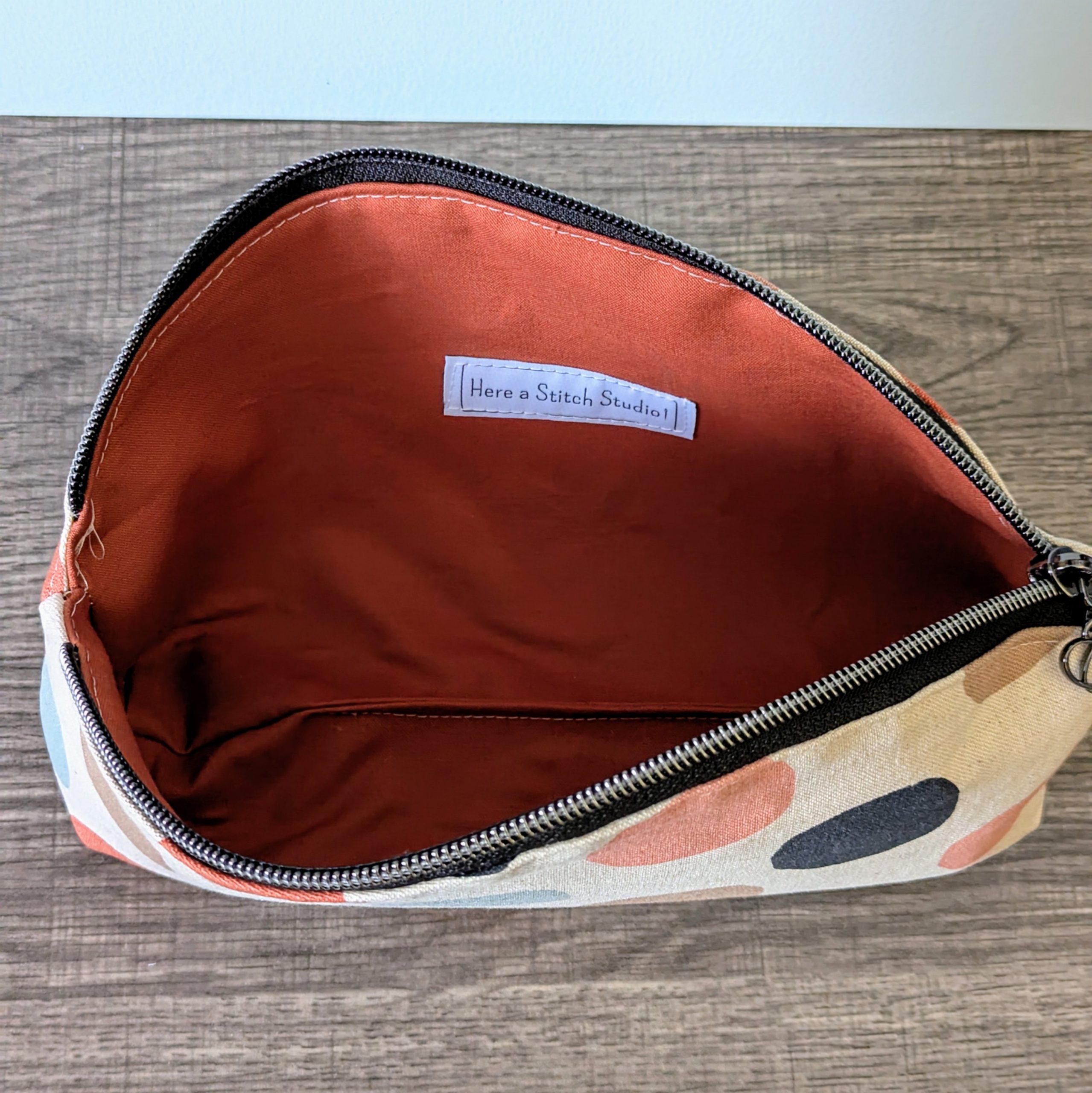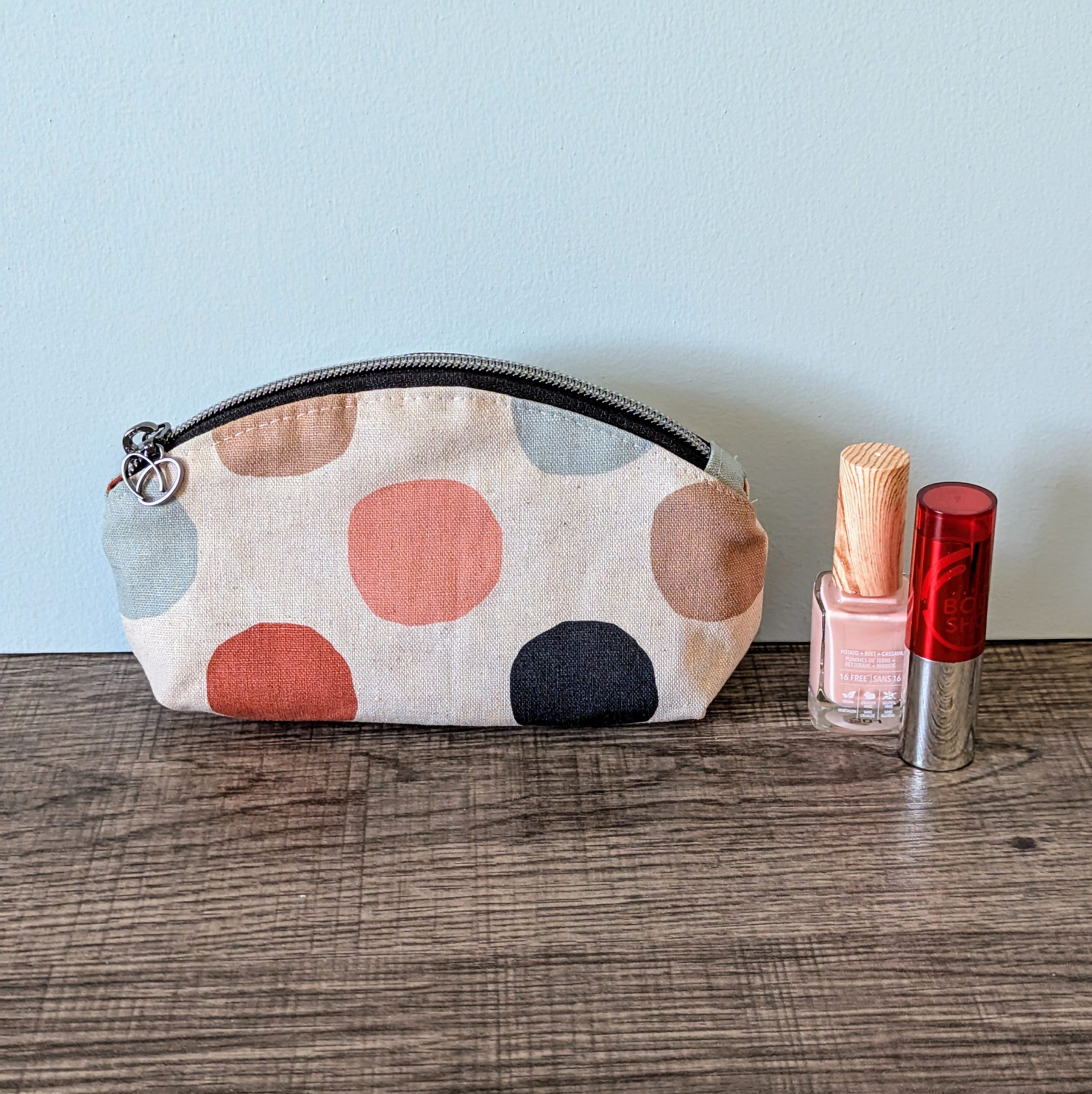 This polka dot cotton linen canvas zipper pouch makes the perfect toiletry and cosmetic bag. Great toiletry bag to use when travelling. This cosmetic bag comes in two sizes, large and small, to accommodate your personal care storage needs. This pouch is also makes a great notions bag or pencil case. Features a zipper in a gunmetal finish with a heart shaped zipper pull.
