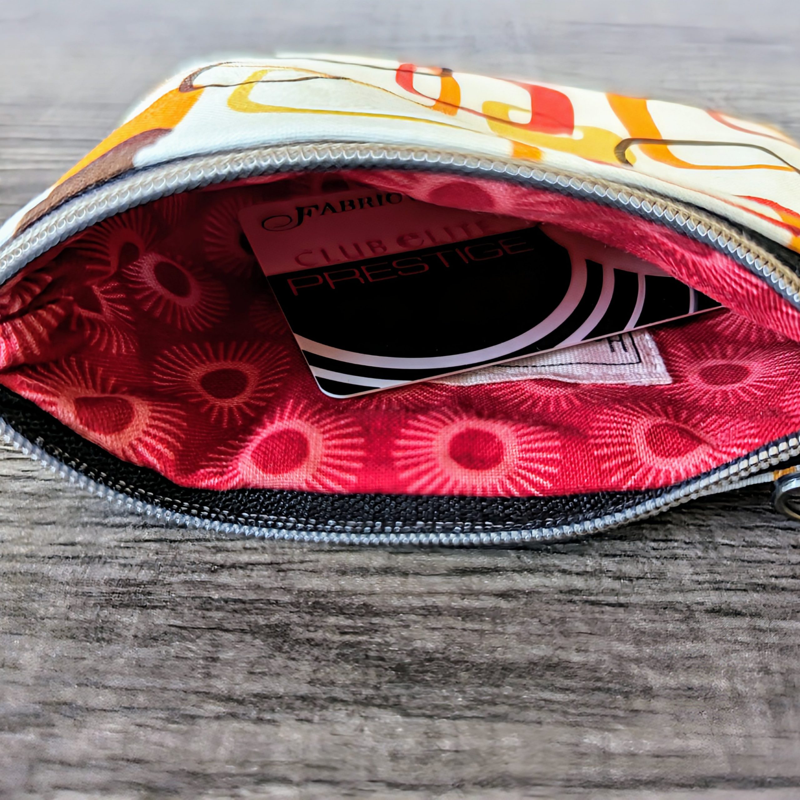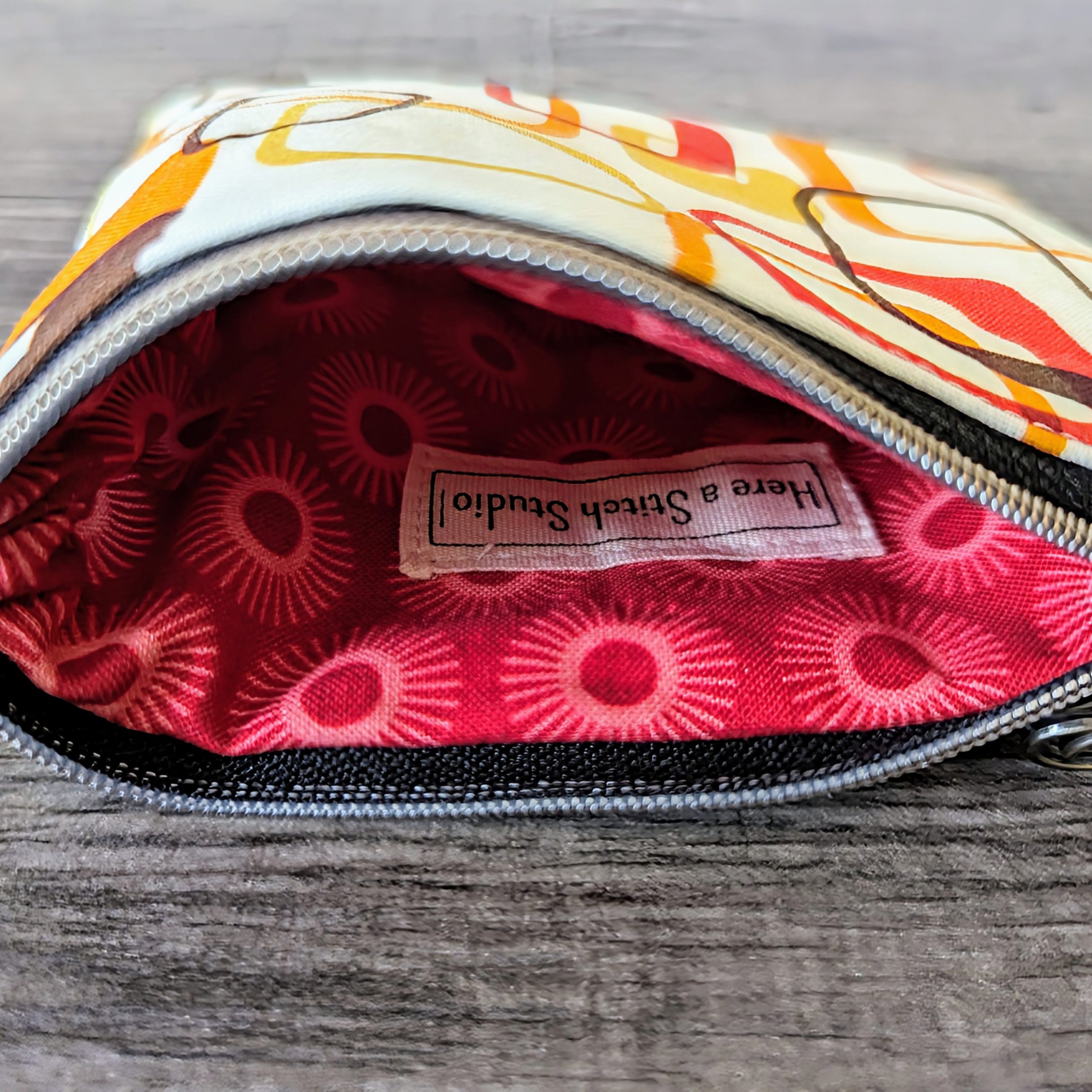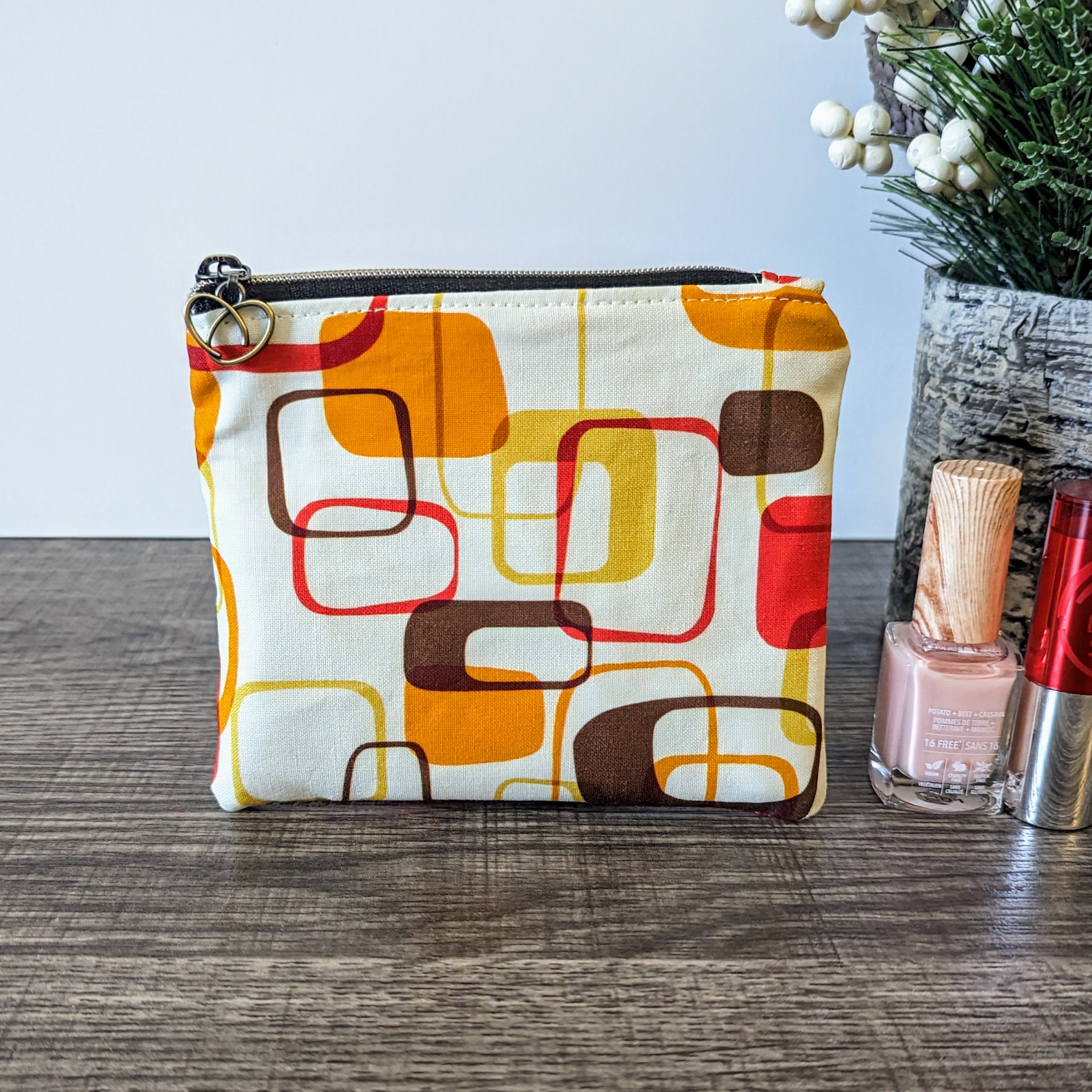 This cute little pouch features a retro mod print in red, orange, yellow, and brown, and is the perfect little storage bag. This cotton zipper pouch makes a nice money and coin purse, and it is the right size to hold debit, credit and gift cards. It also makes a great little makeup pouch, as it can easily fit lipstick, mascara, and small compacts.