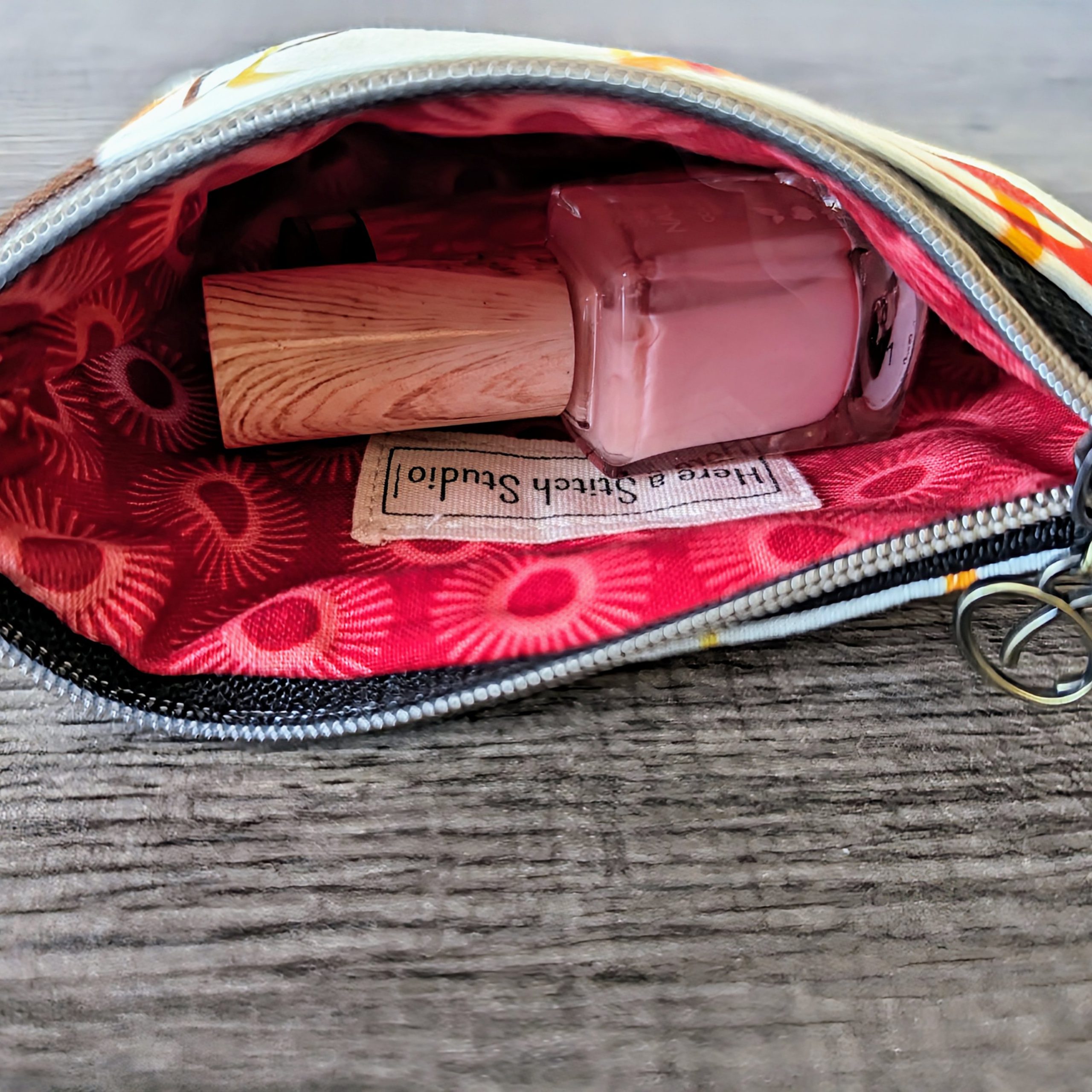 The exterior and interior of the pouch are made from 100% cotton fabric from Michael Miller Fabrics, and both are interfaced for extra durability. Each pouch has a metal zipper made with a heart shaped zipper pull in an antique brass finish.