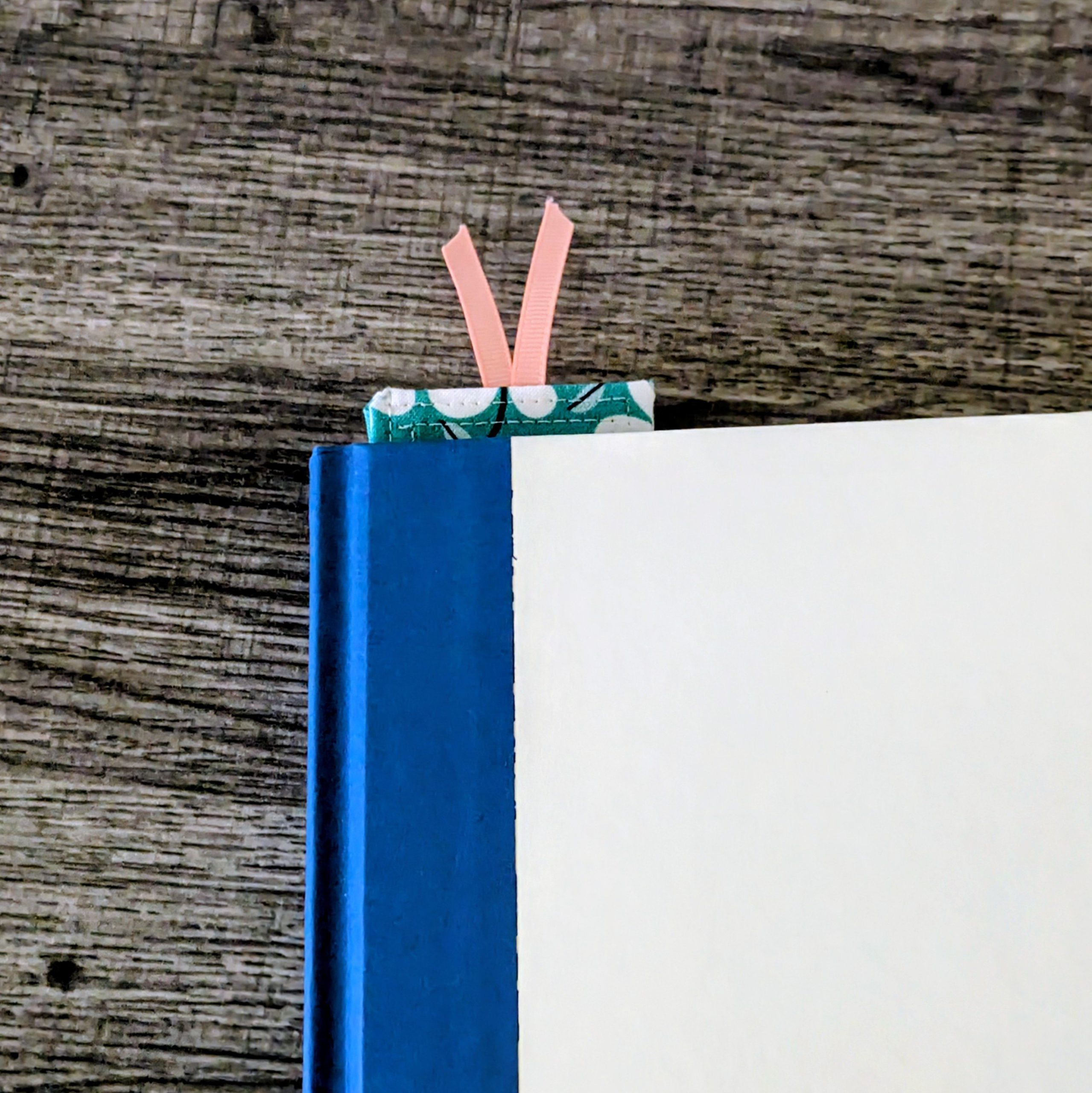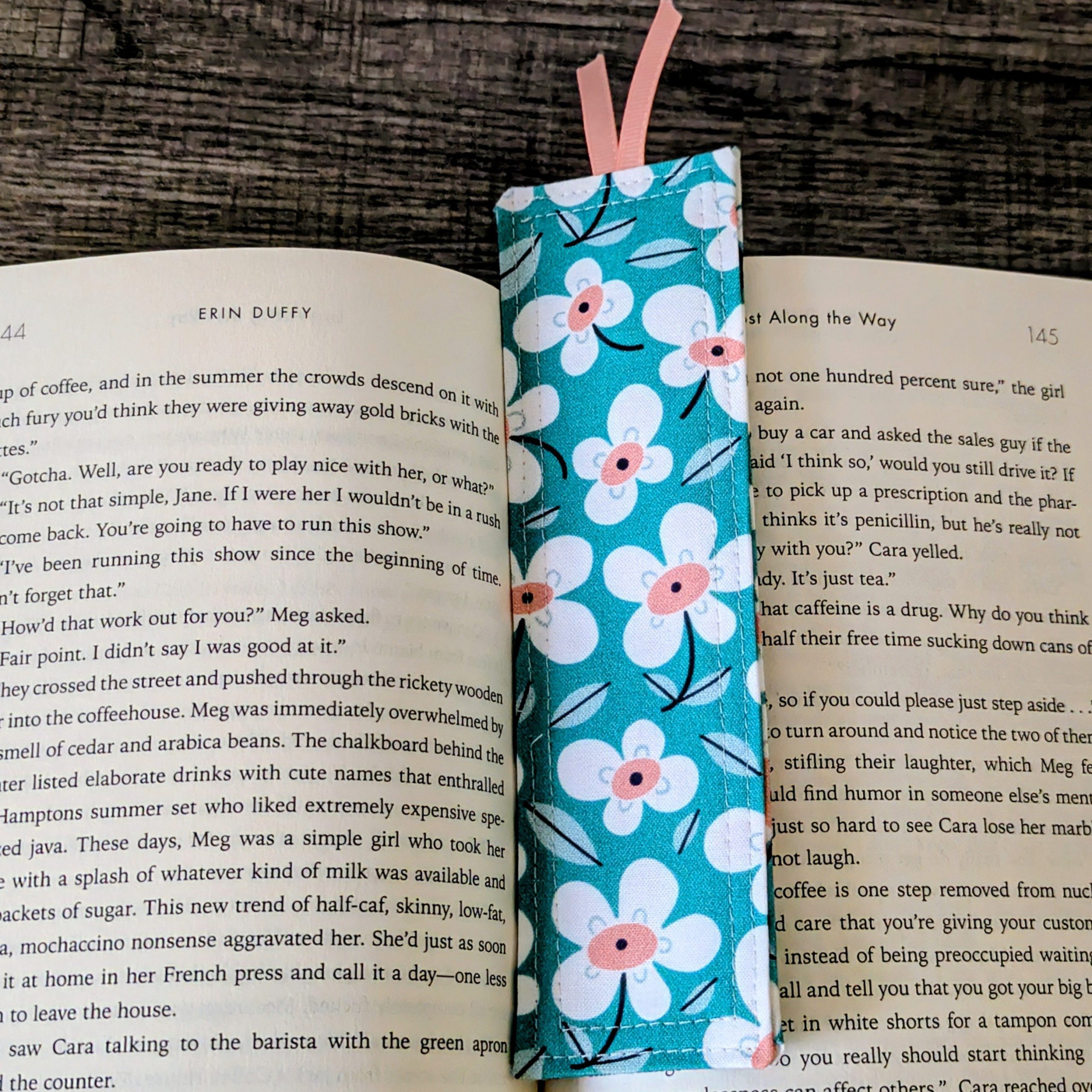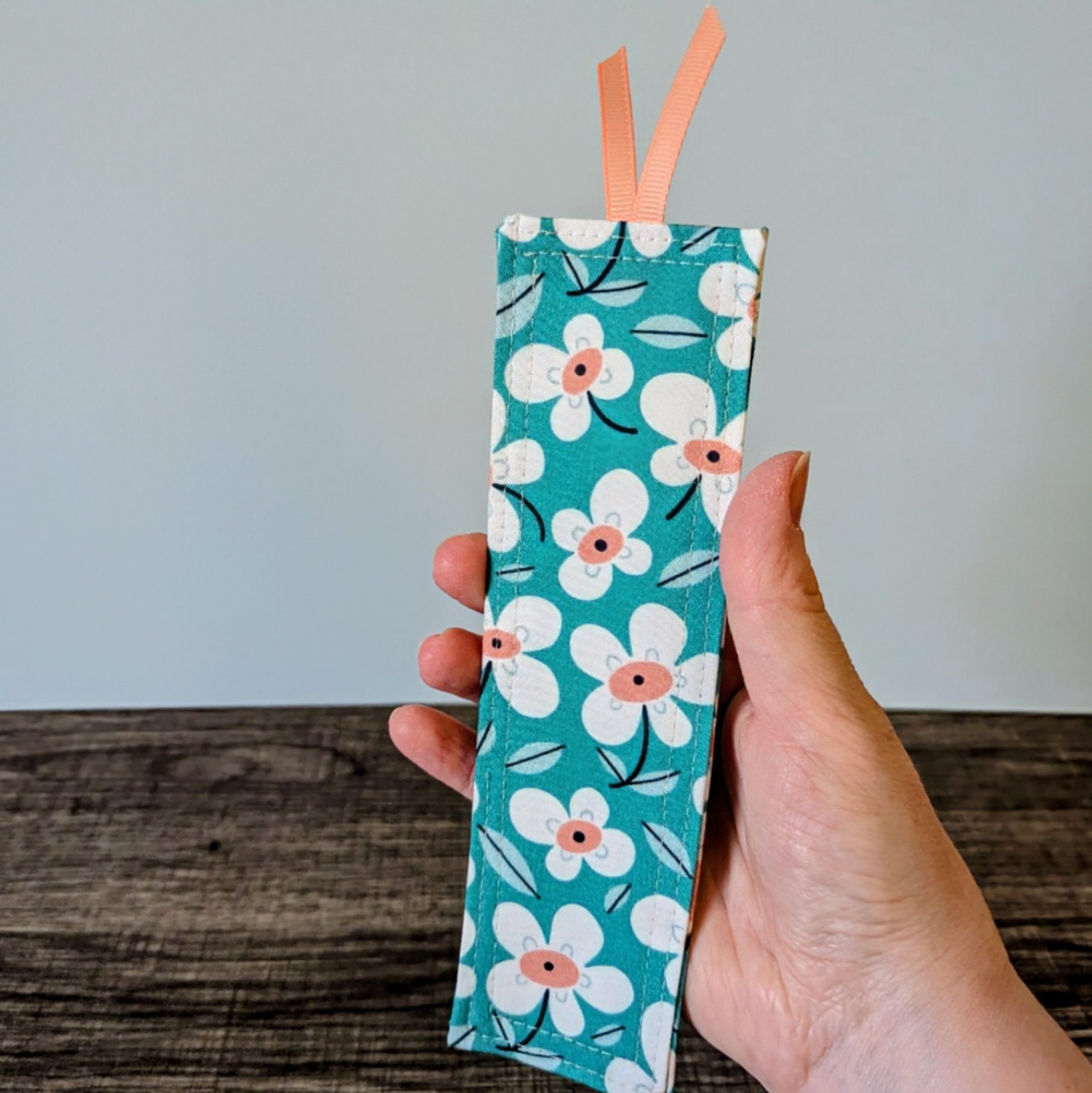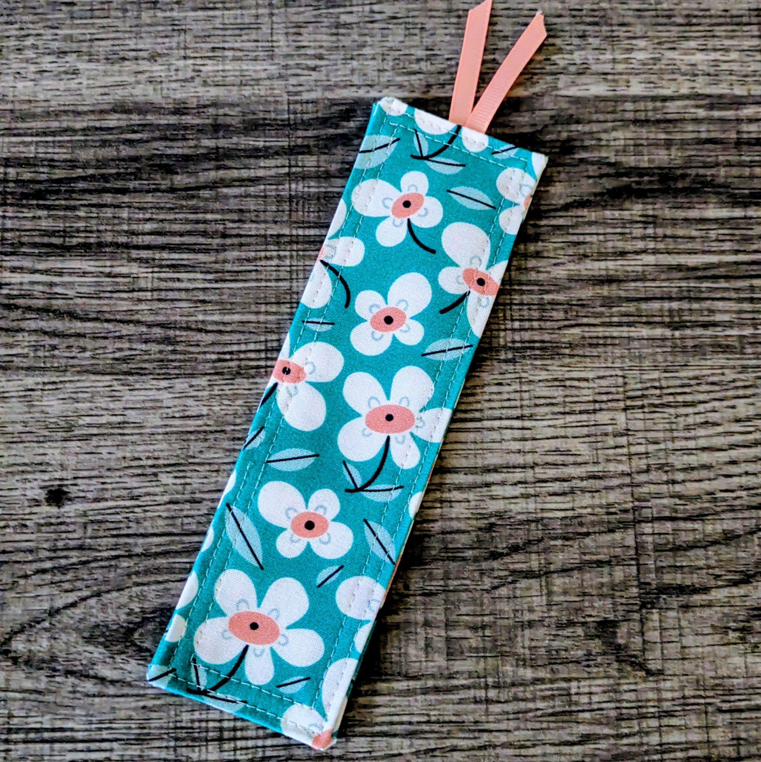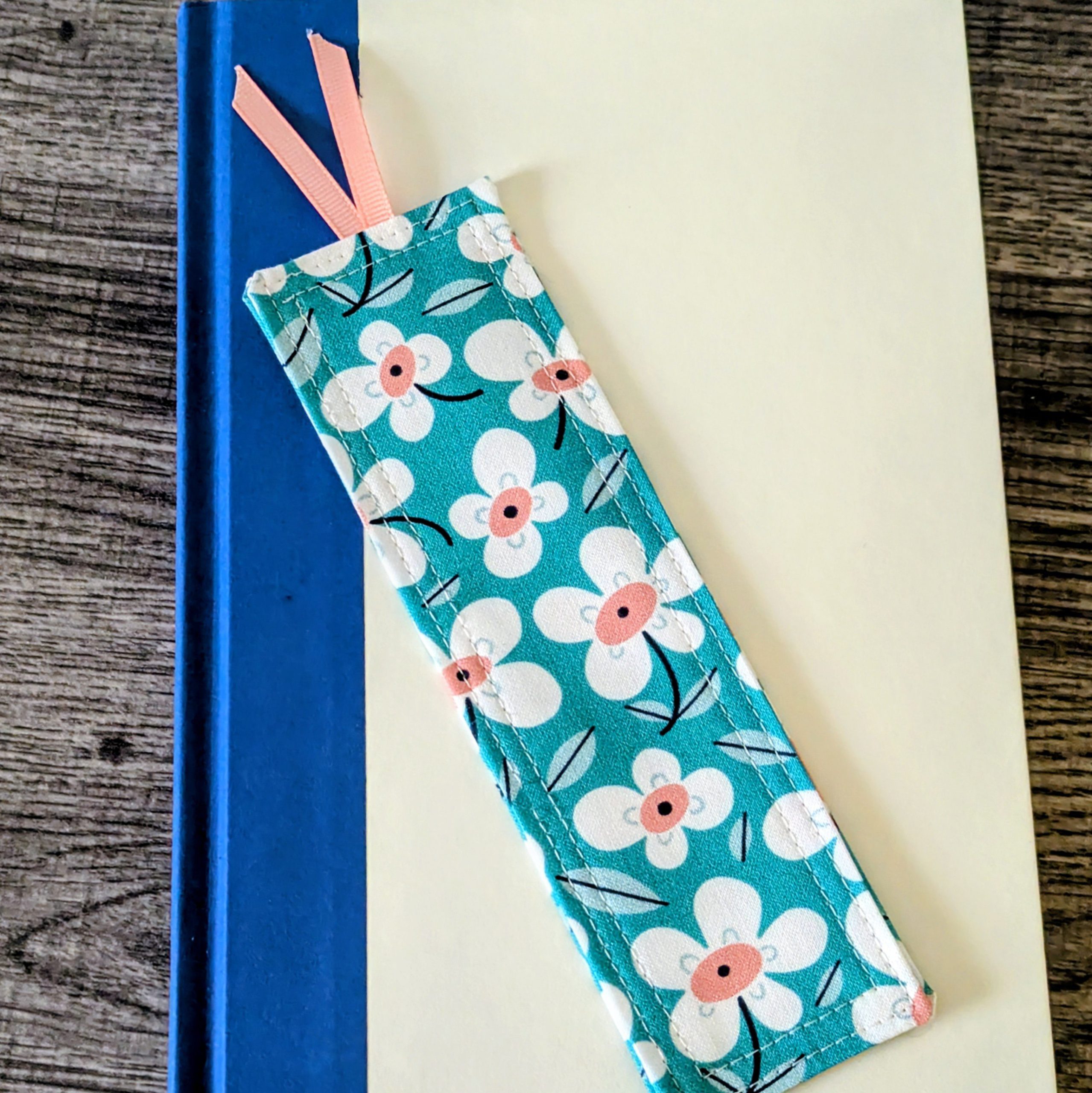 Hold your place in a book with this pretty floral bookmark. Featuring a daisy flower print on turquoise blue fabric, this bookmark is handcrafted with cotton fabric and a firm interfacing, and accented with a ribbon in a coordinating colour.