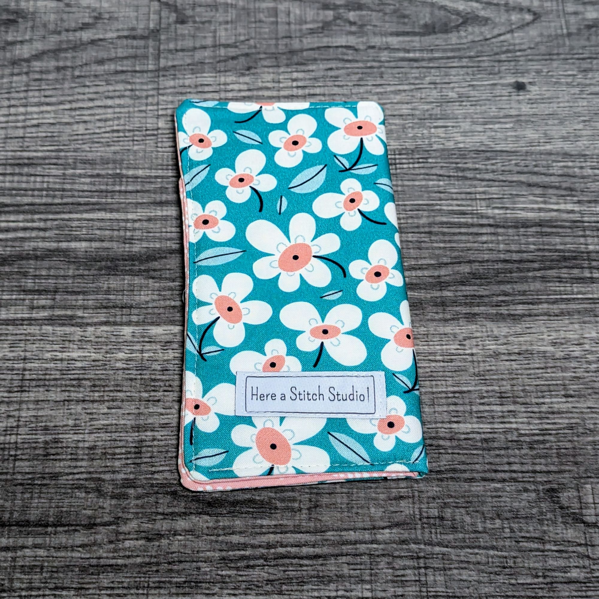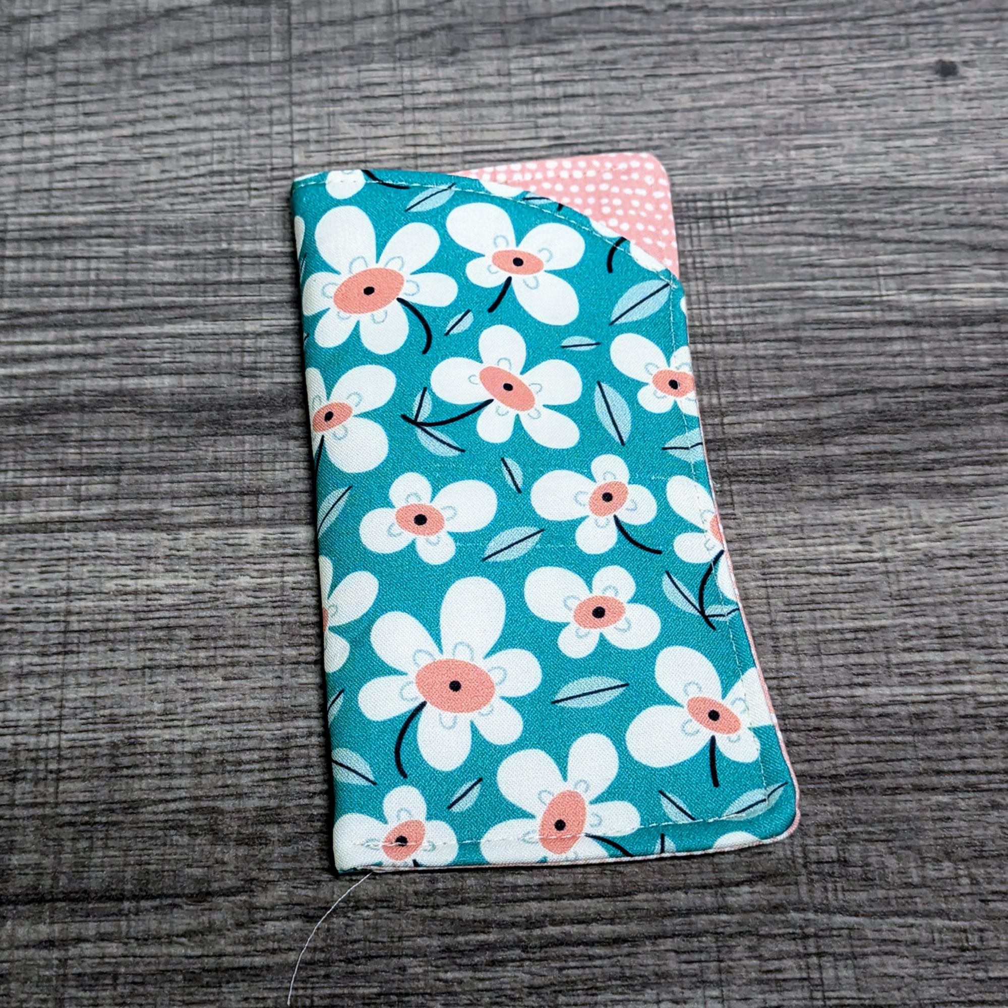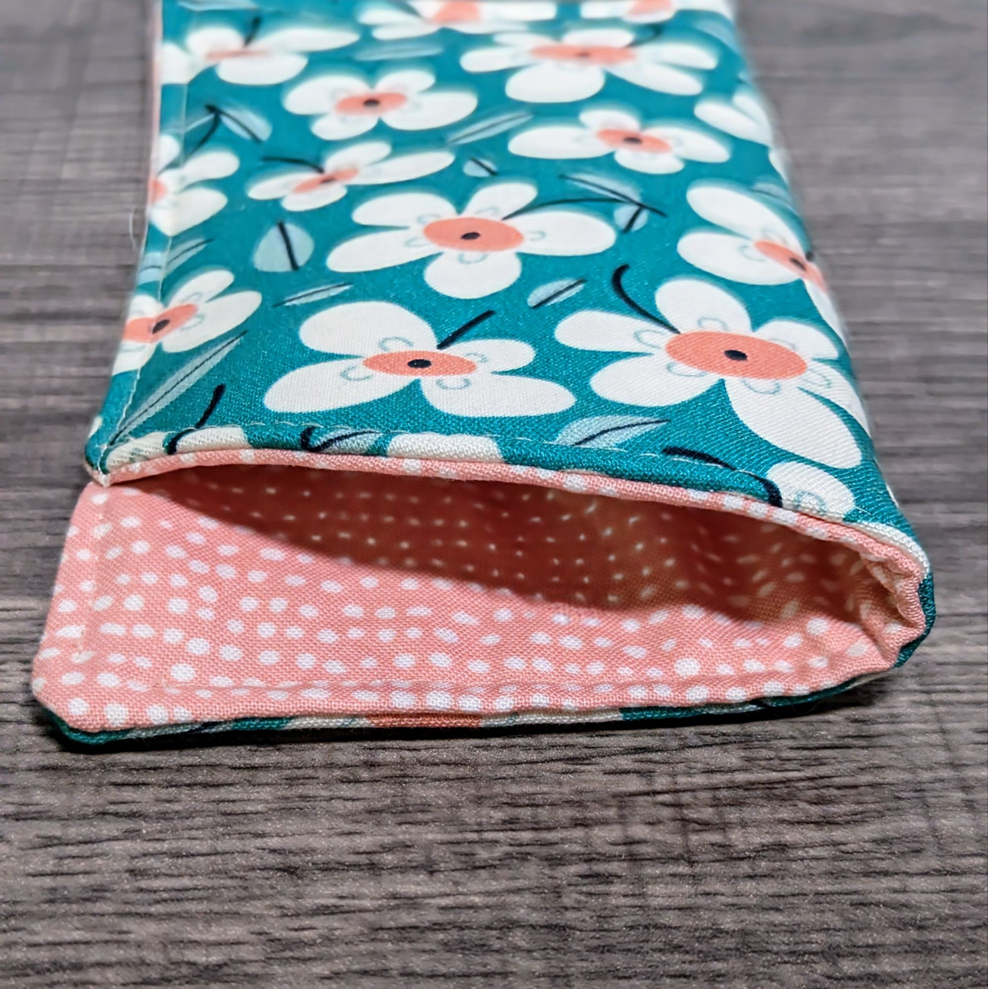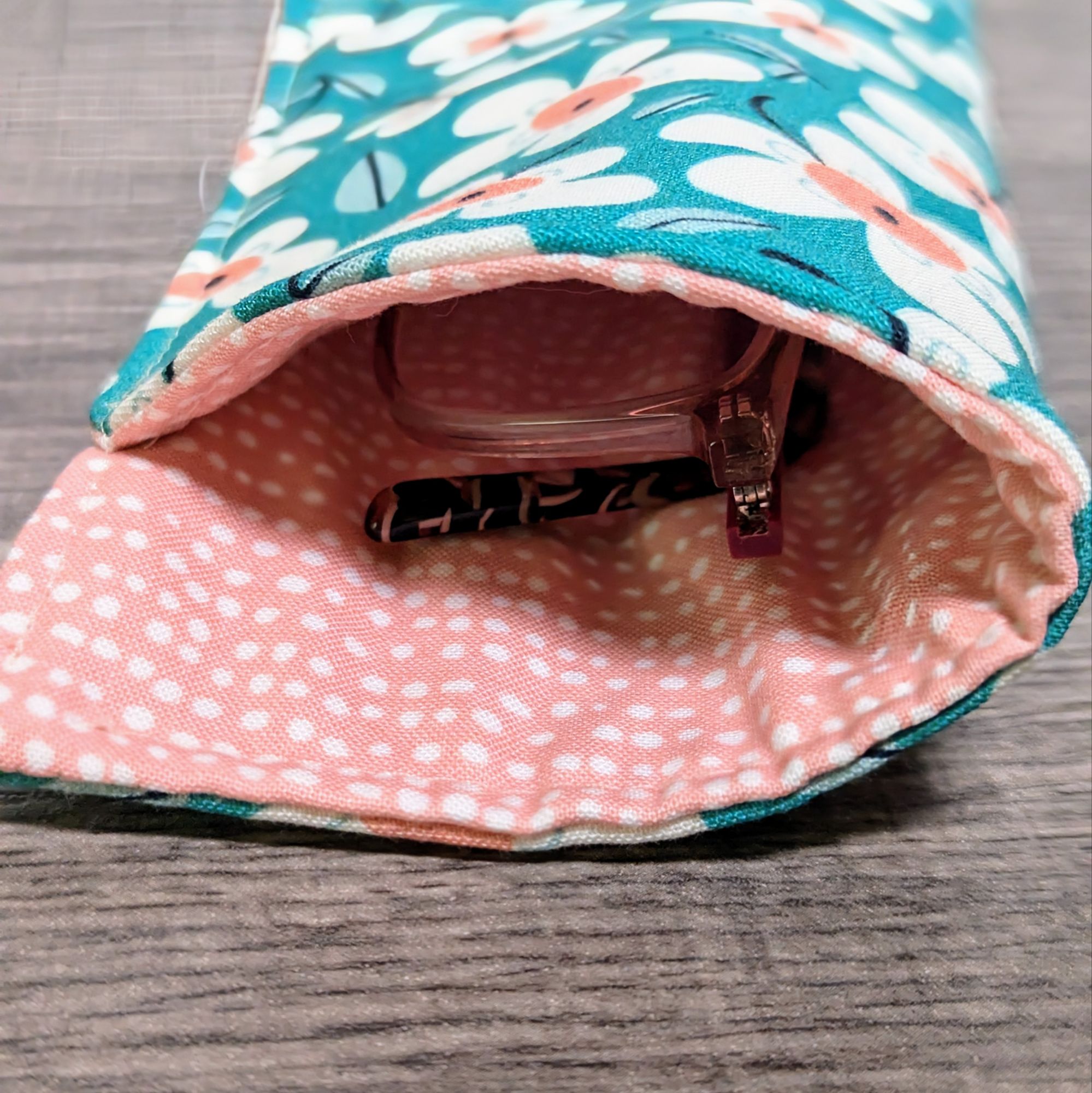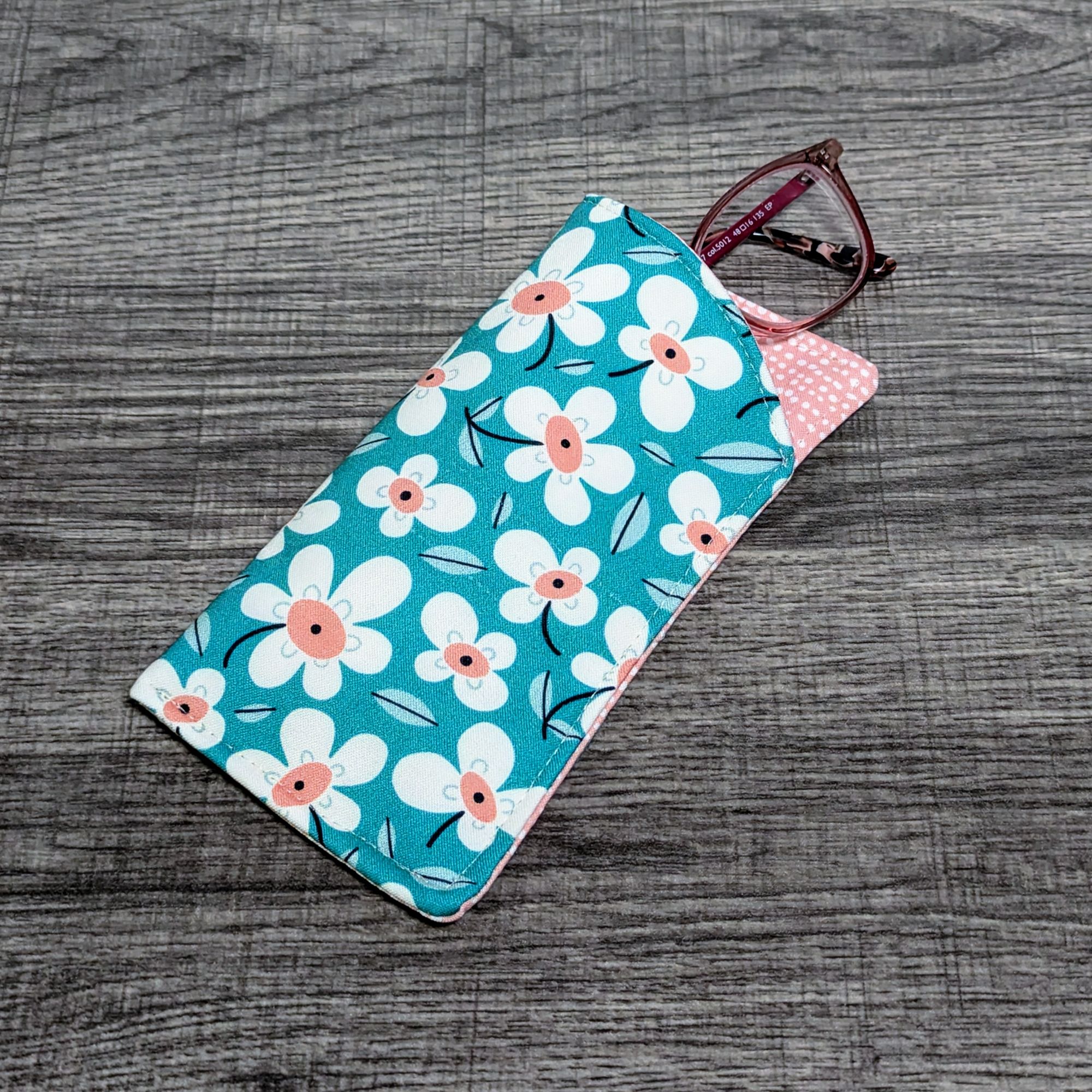 Keep your glasses safe, and add a little style with this padded eyeglass pouch. The exterior is a turquoise cotton featuring a daisy floral print. The interior features a apricot pink print cotton.